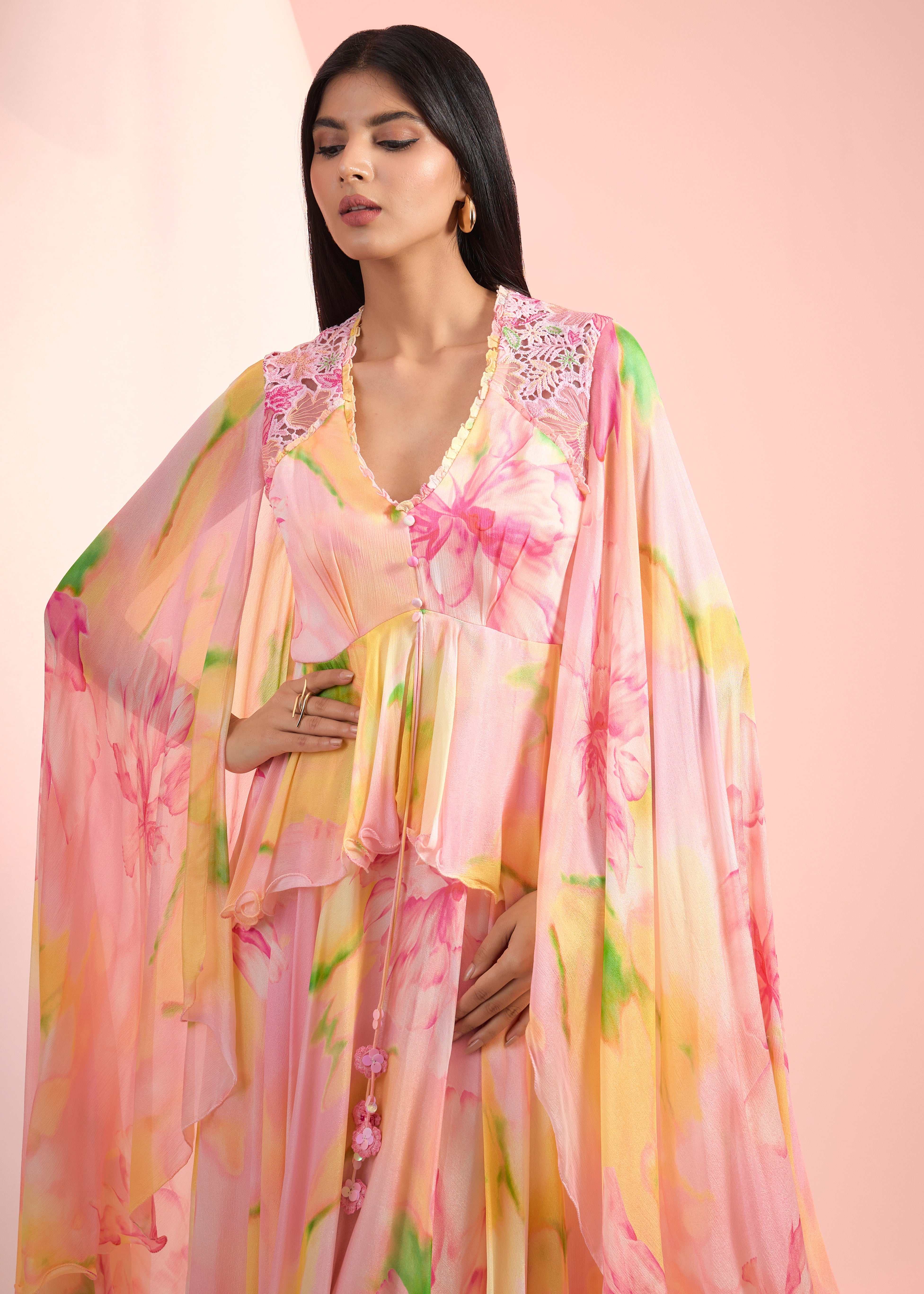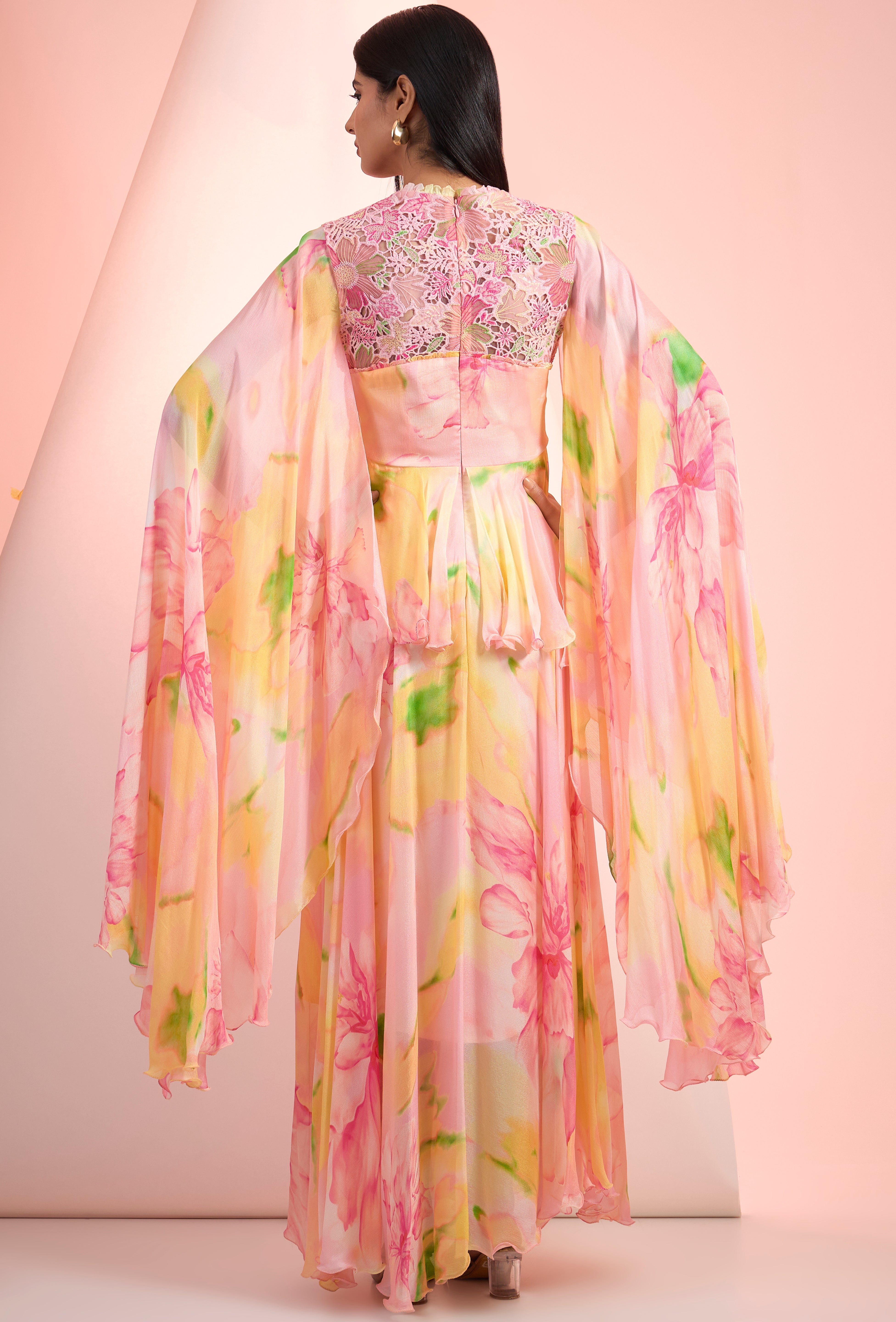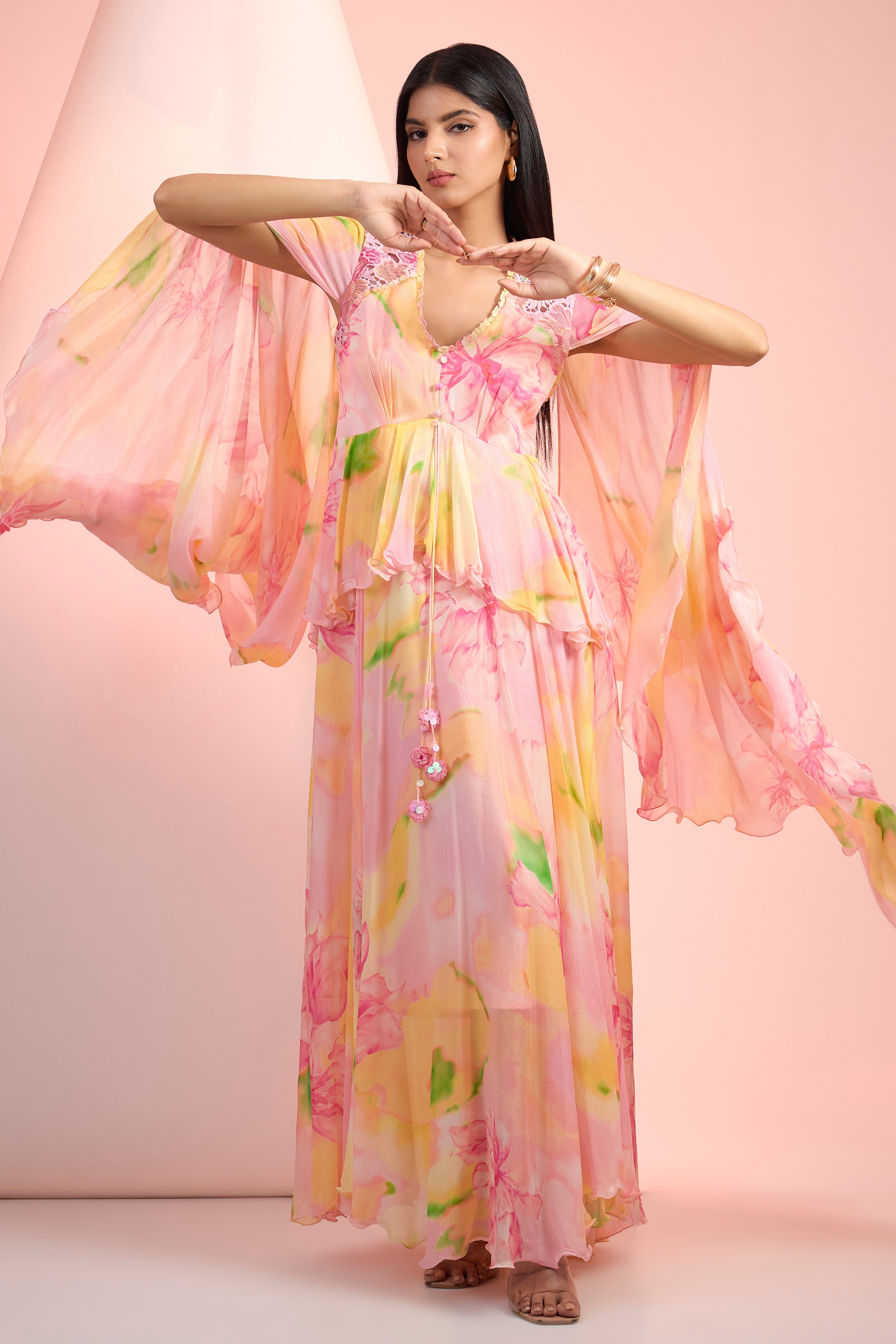 Elegant and flowing full-length dress with cape sleeves features an frill waist.