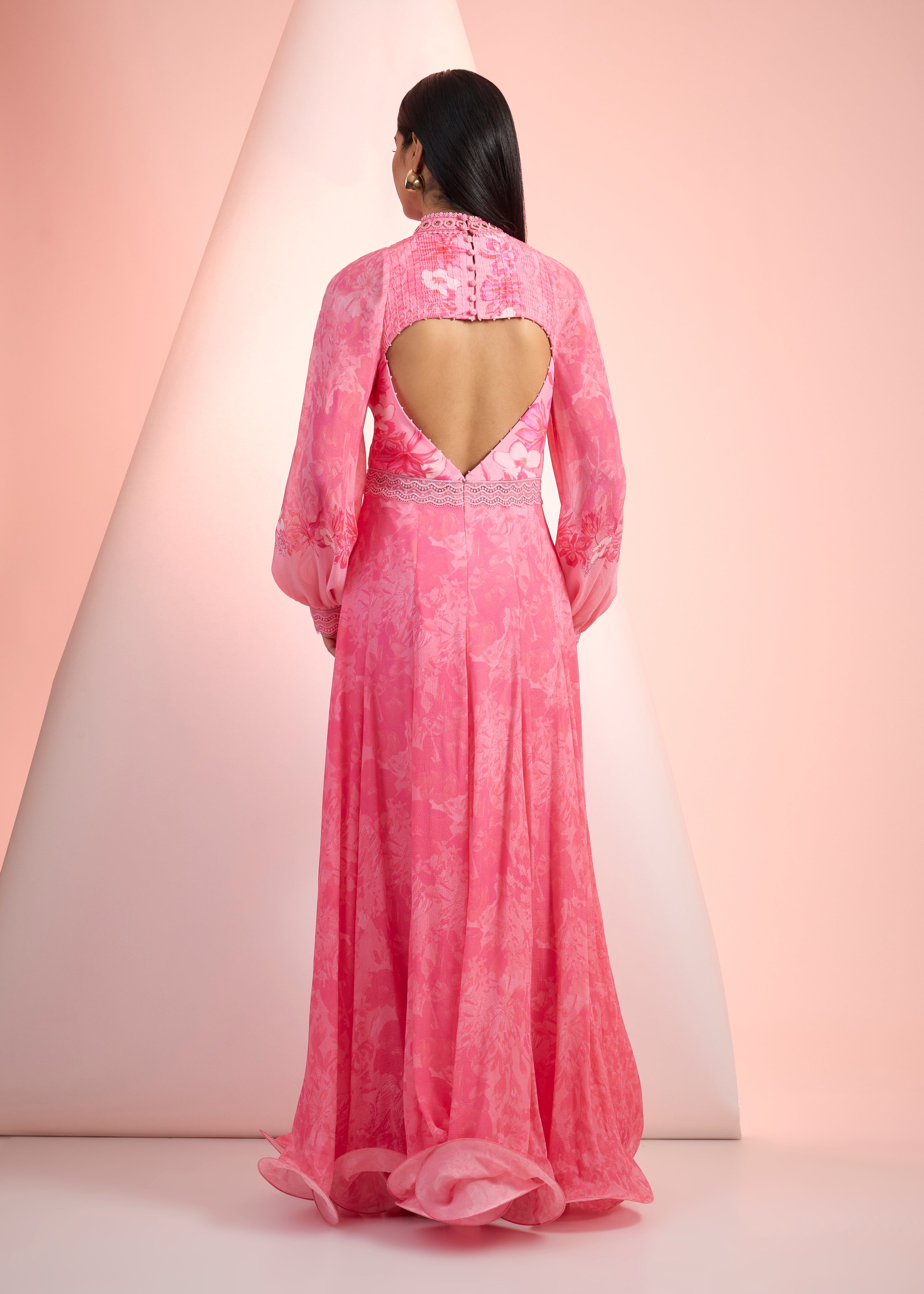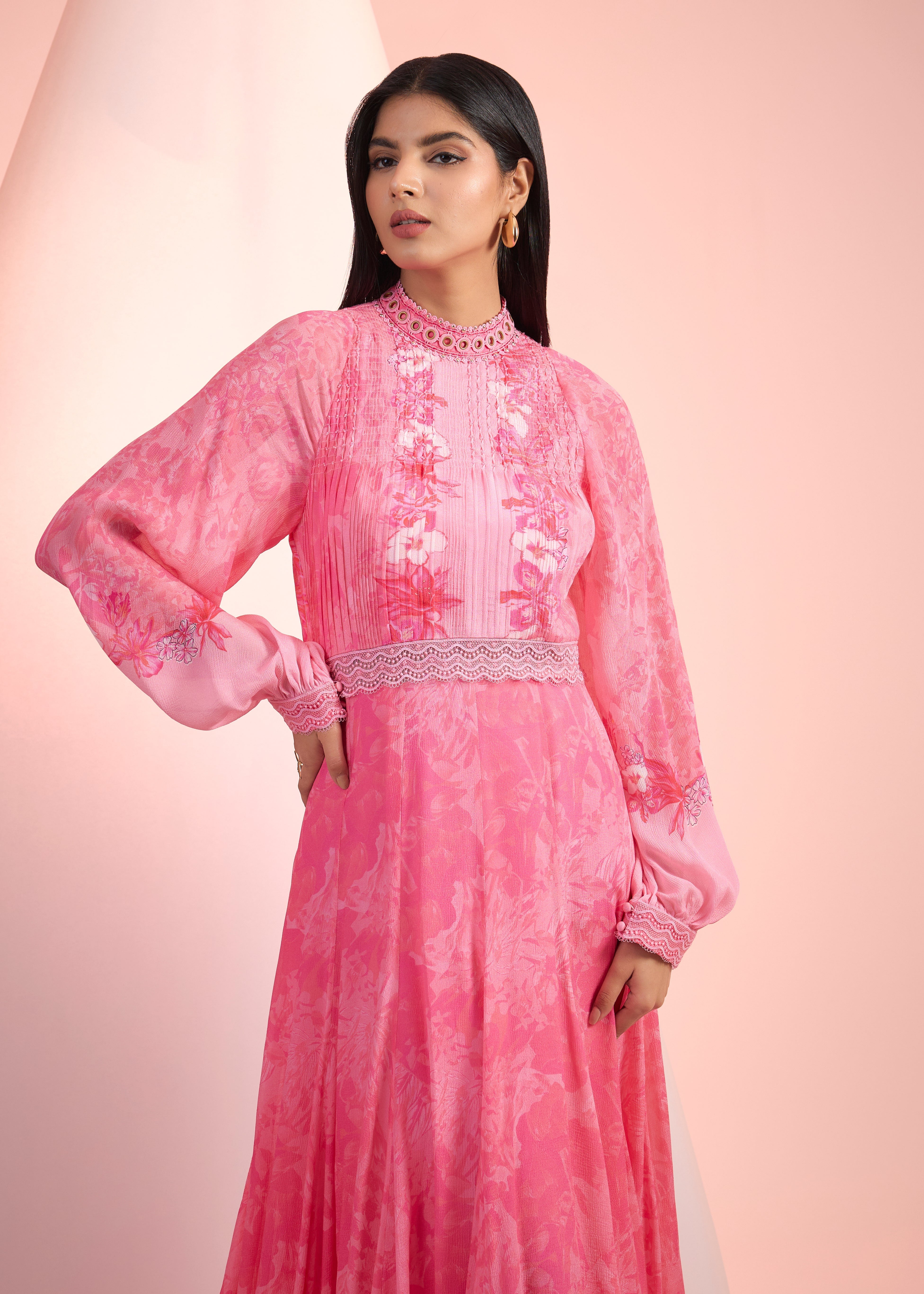 Printed long dress with front yoke with pintuck lace detailing on the waist and neck area.