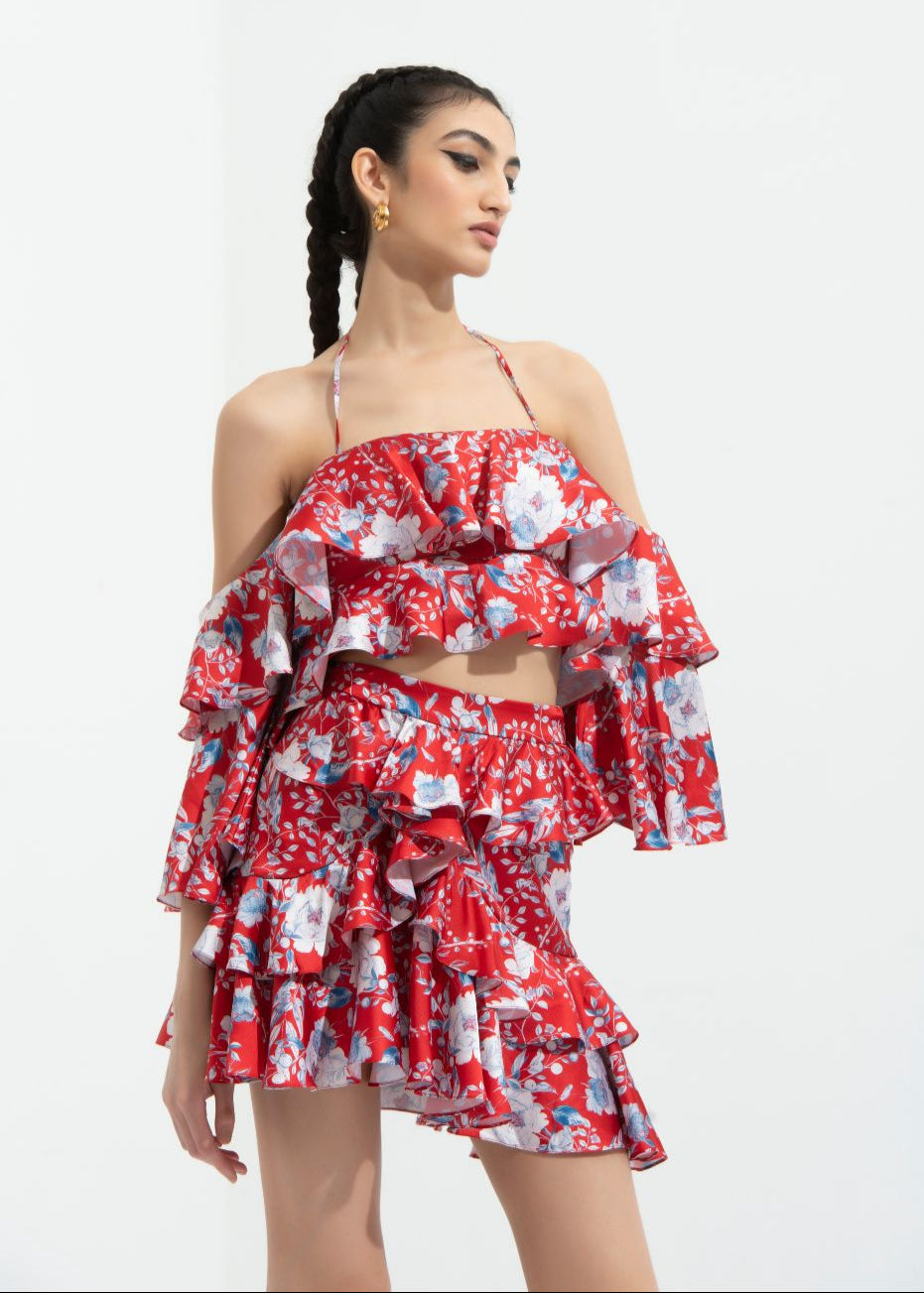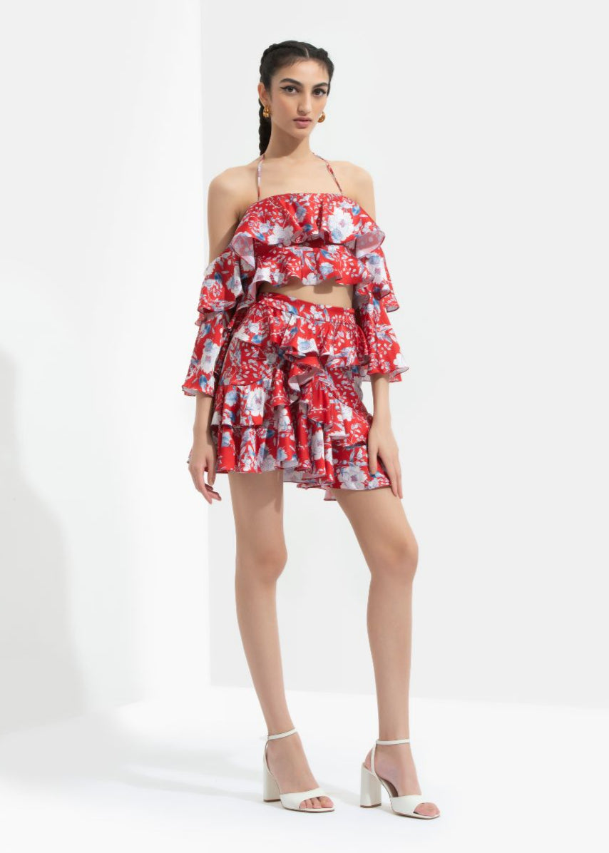 Ajisia Printed Cold Shoulder Blouse Paired With Short Skirt