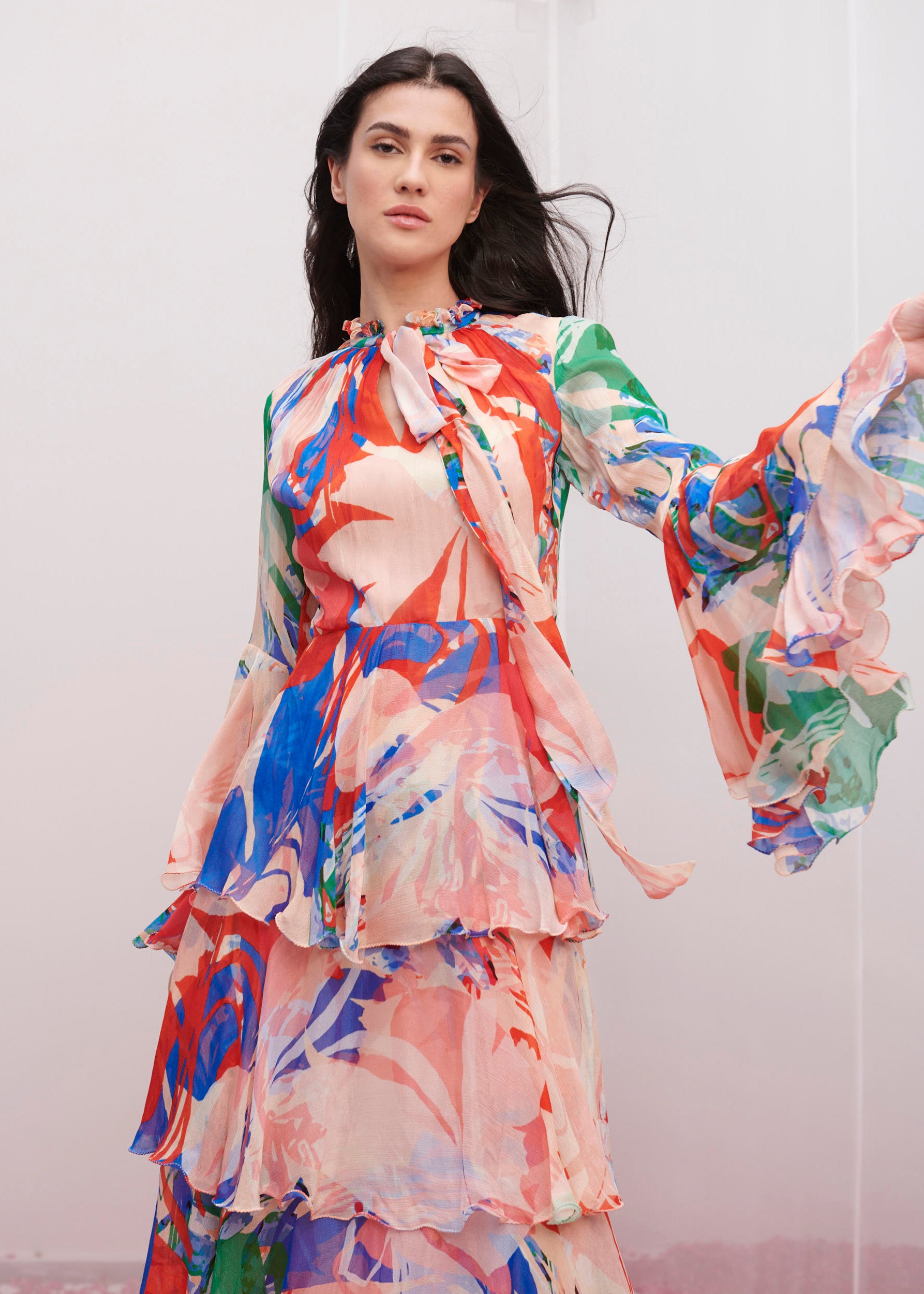 Experience the captivating allure of Mandira Wirk's Beige and Red Abstract Printed Layered Long Dress with Layered Sleeve Detail and Neck Tie Up. The neck tie-up enhances the neckline, allowing you to adjust the dress to your desired fit and style.