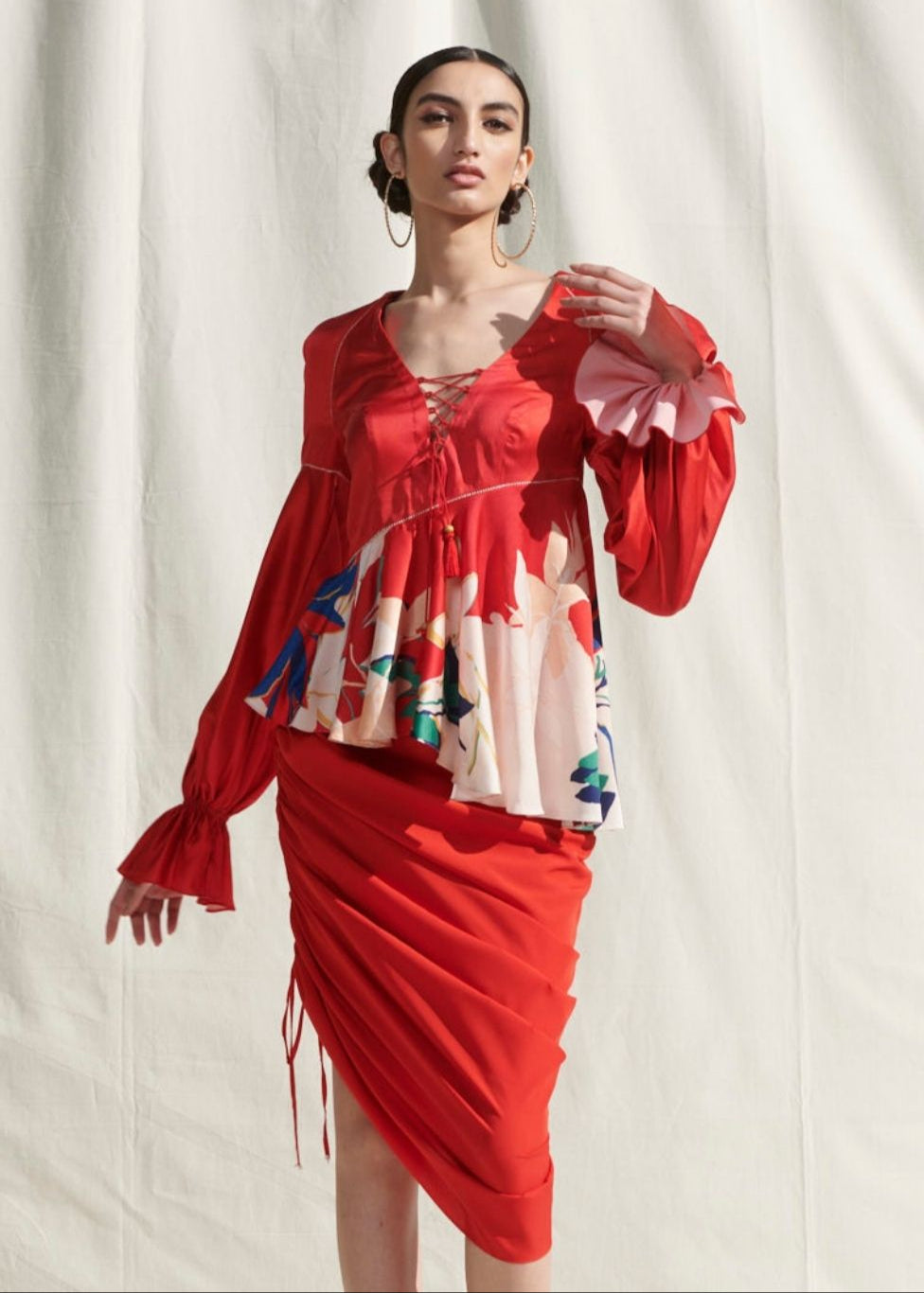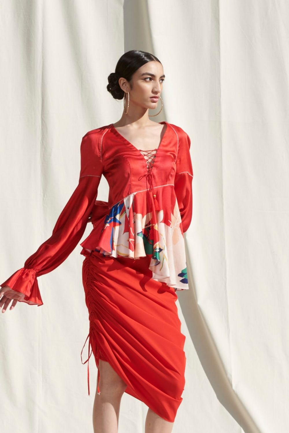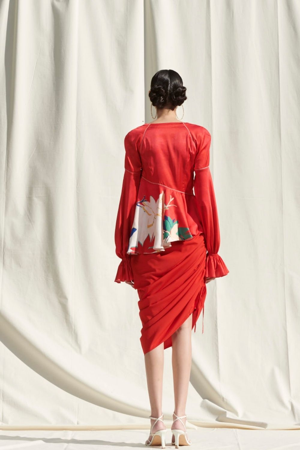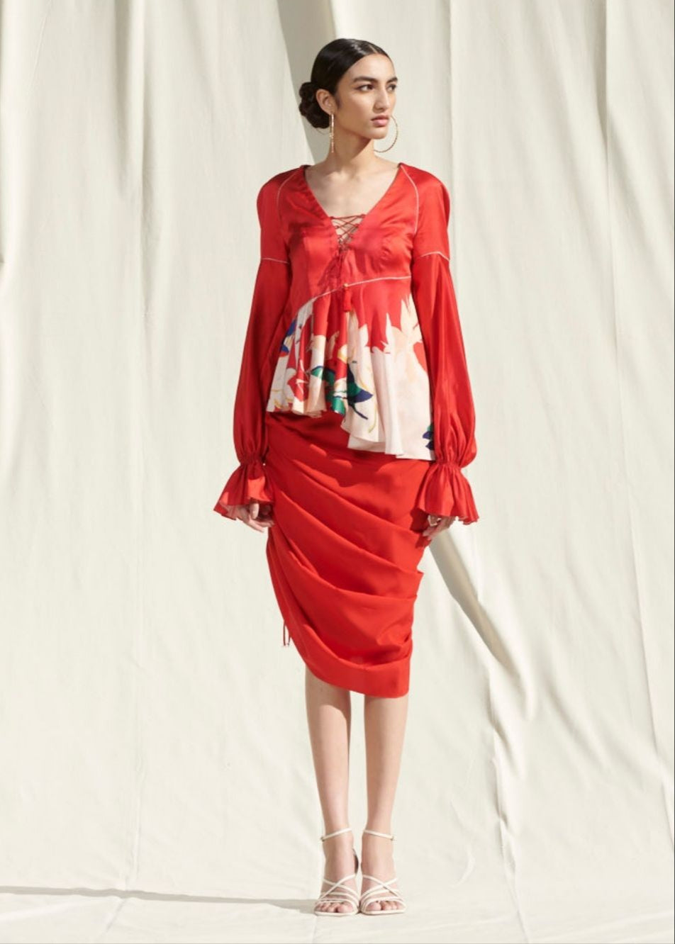 Red Crepe Satin Peplum Top With Placement Prints Paired With A Solid Crepe Drape Skirt