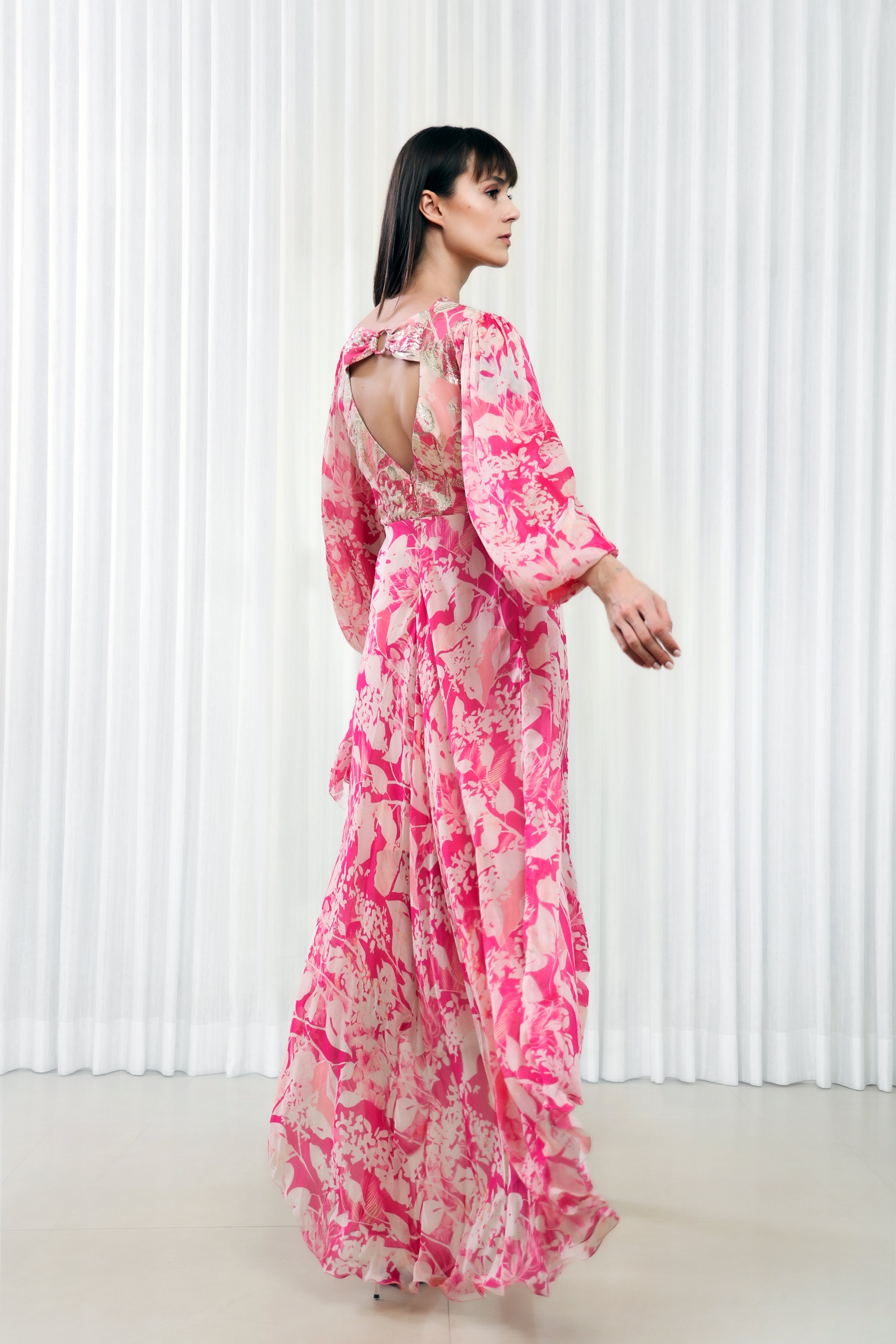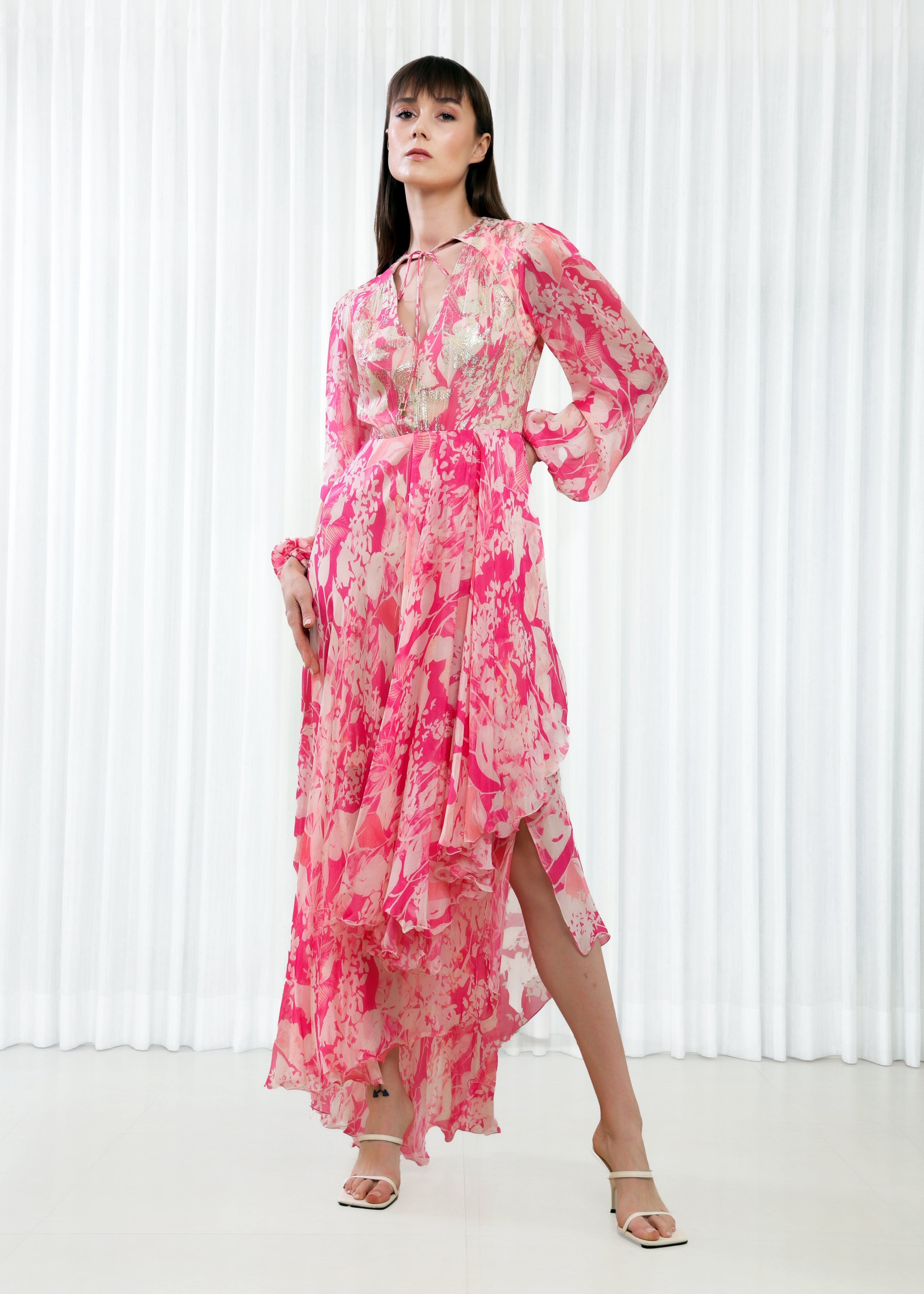 Crafted from a luxurious combination of chiffon and Brasso fabrics, this dress boasts a mesmerizing multi-pink color palette.