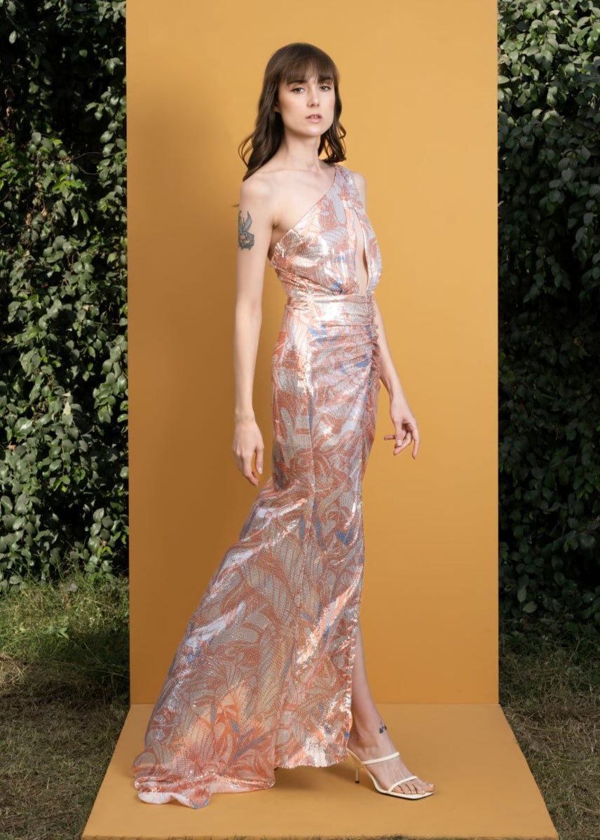 Hibiscus Print Sequin One Shoulder Tulip Dress