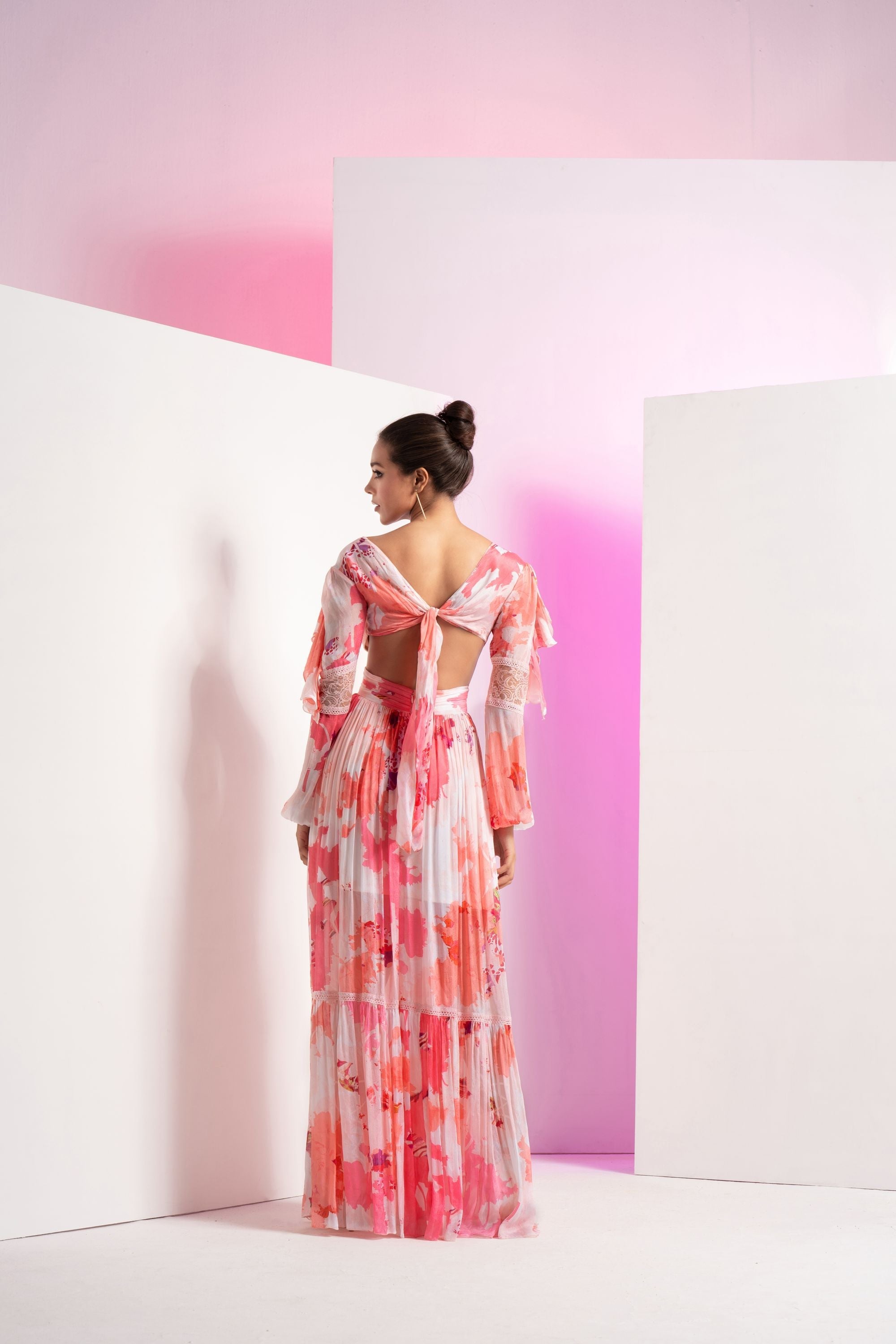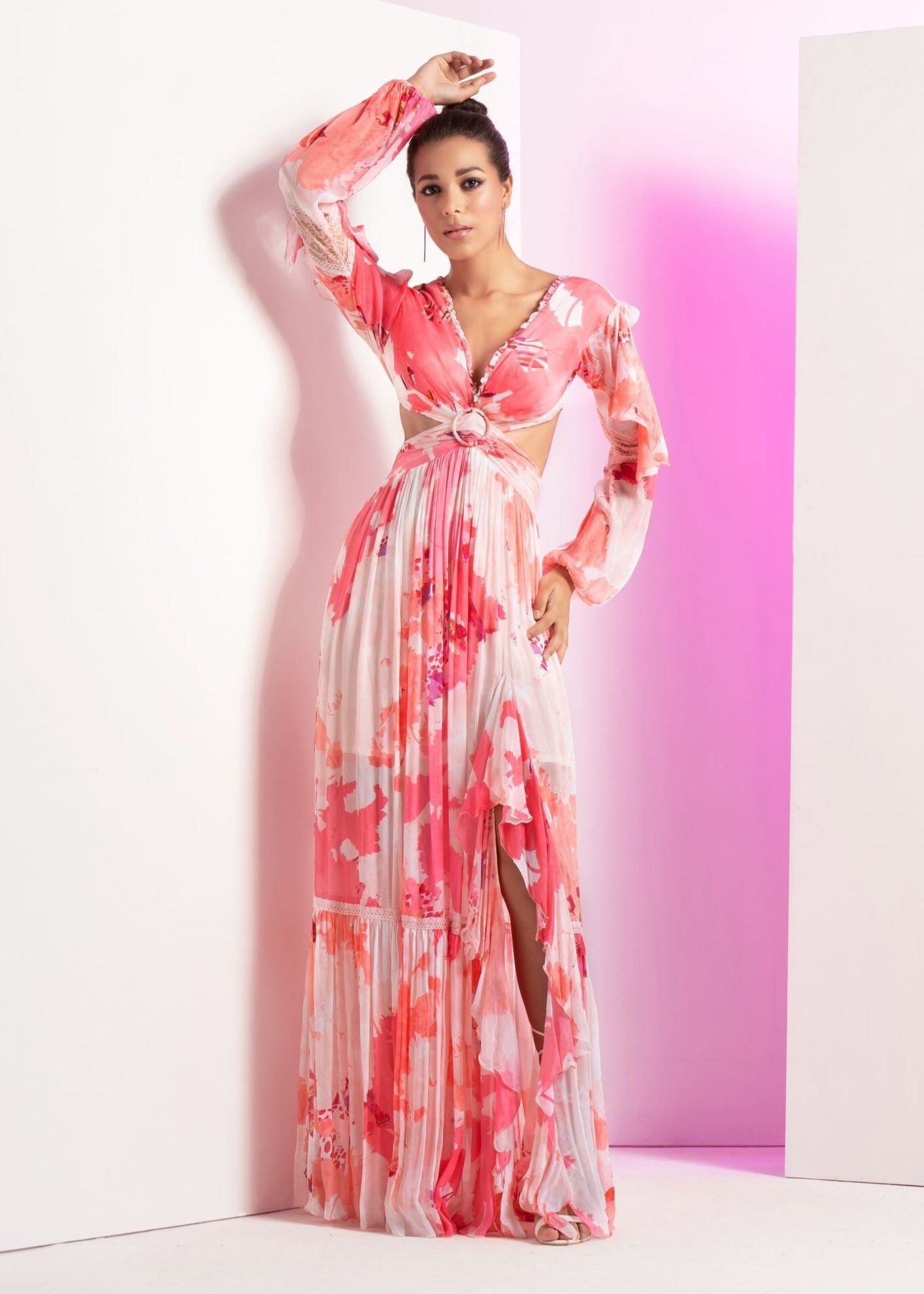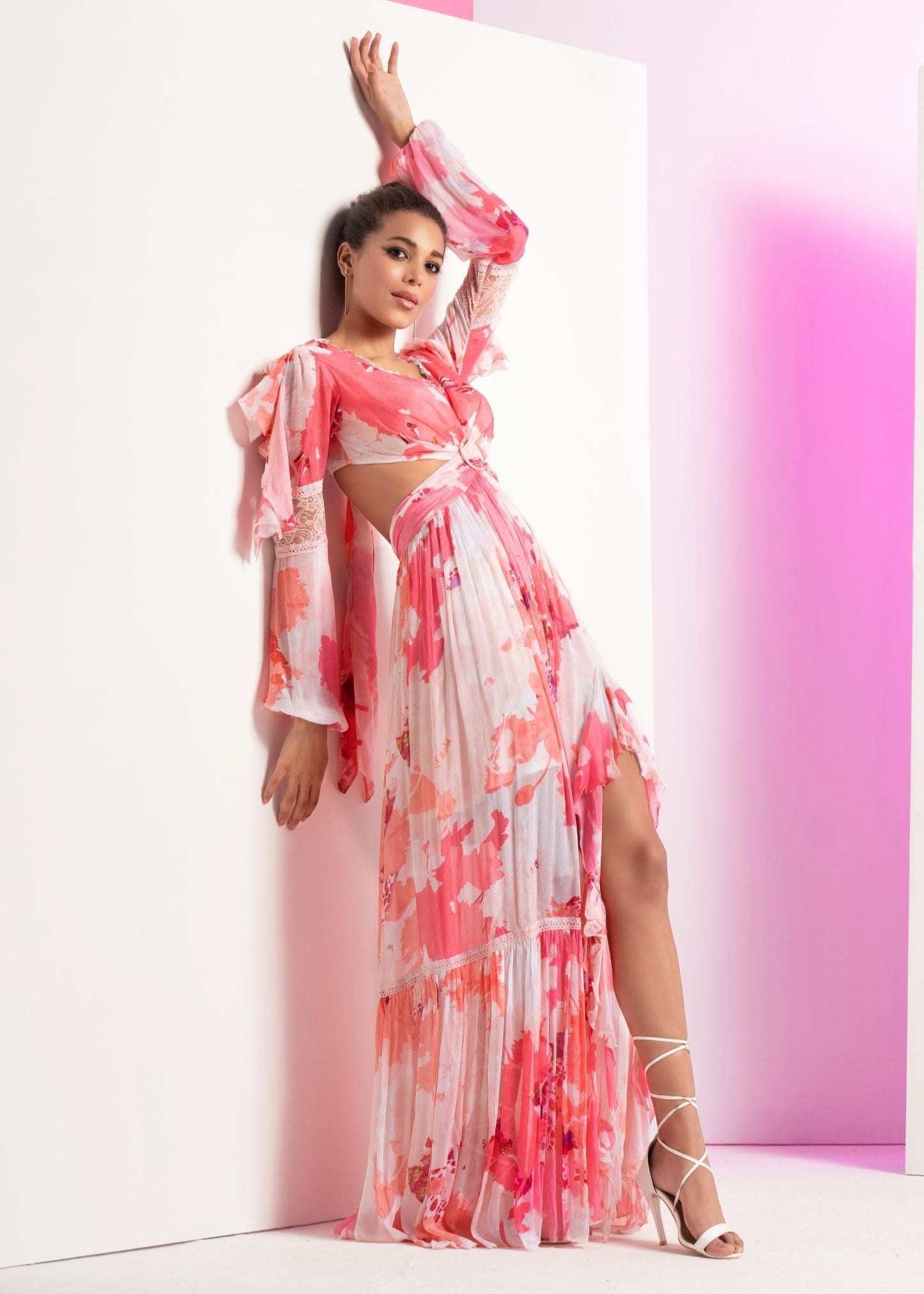 This maxi dress showcases a delightful floral pattern reminiscent of blooming buds in full splendor, creating a captivating and fresh look that's perfect for various occasions.