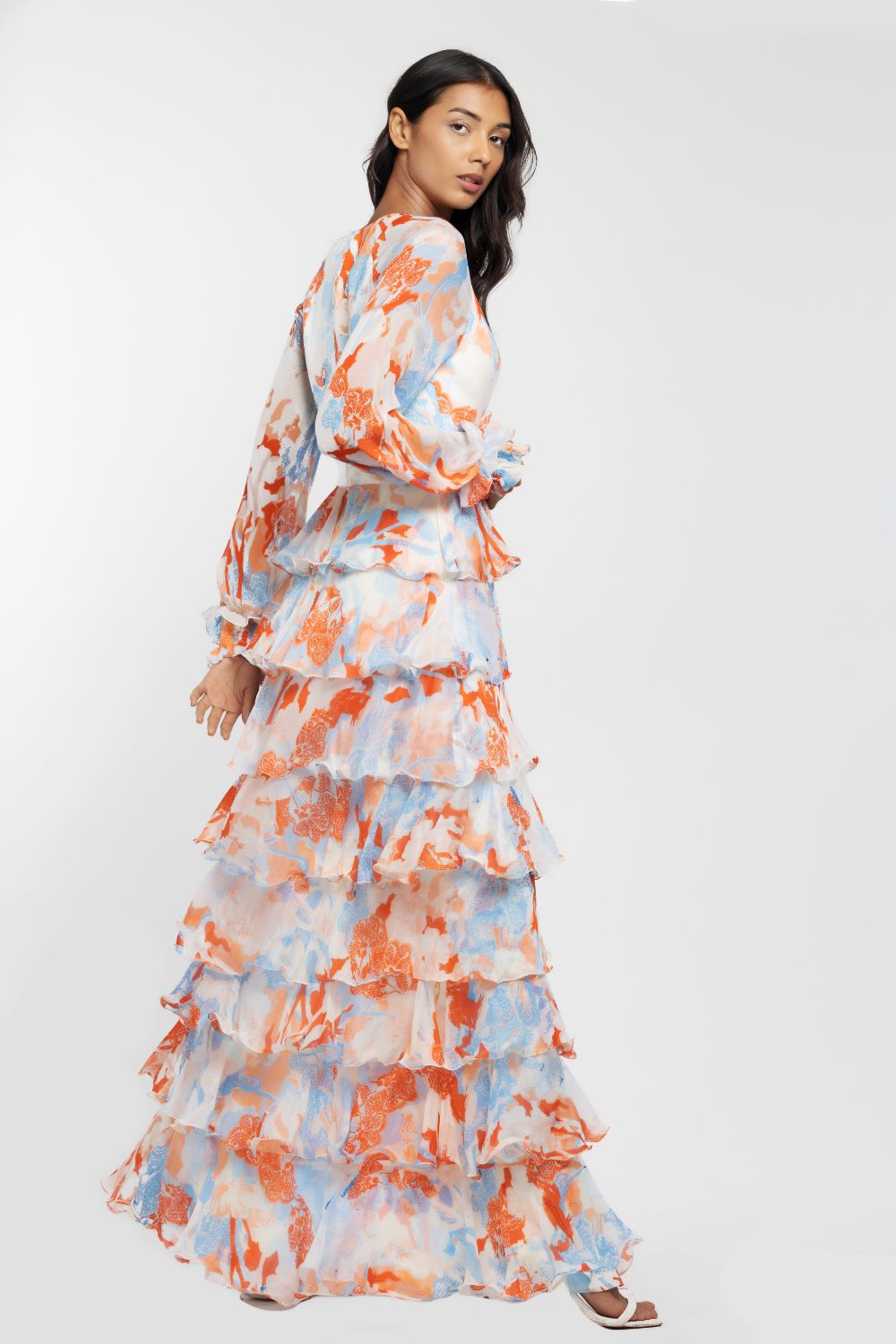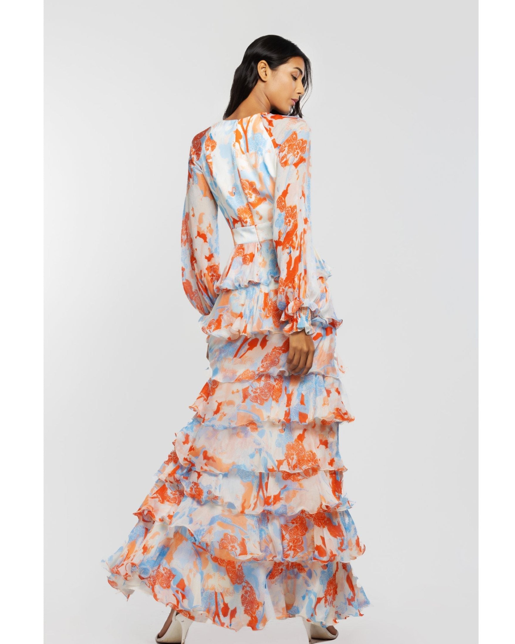 Indulge in the vibrant allure of Mandira Wirk's Ivory and Orange Tropical Printed Chiffon Long Tiered Dress with Plunge Neckline and Side Slit. This captivating dress features a delightful tropical print, meticulously crafted from luxurious chiffon fabric.