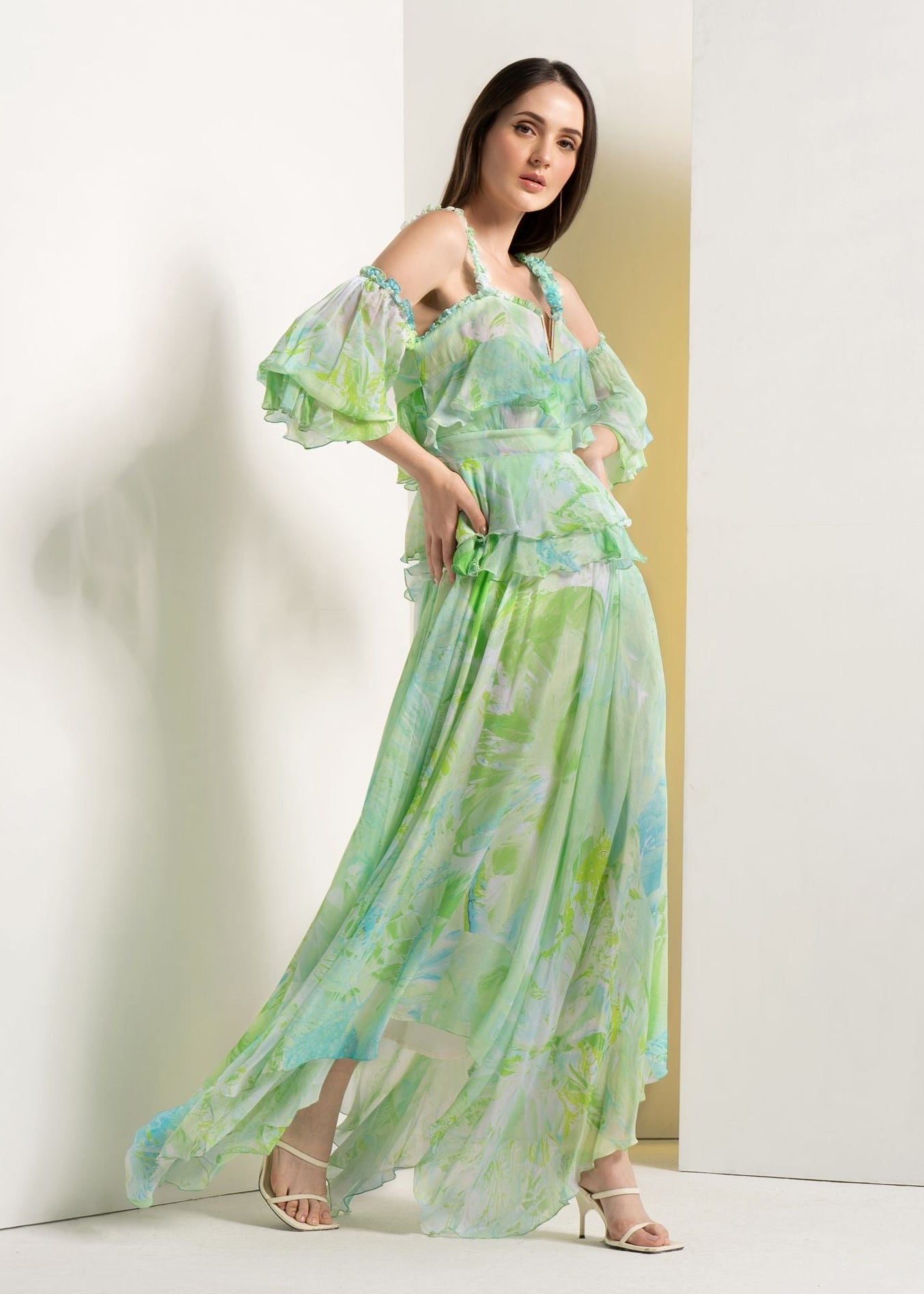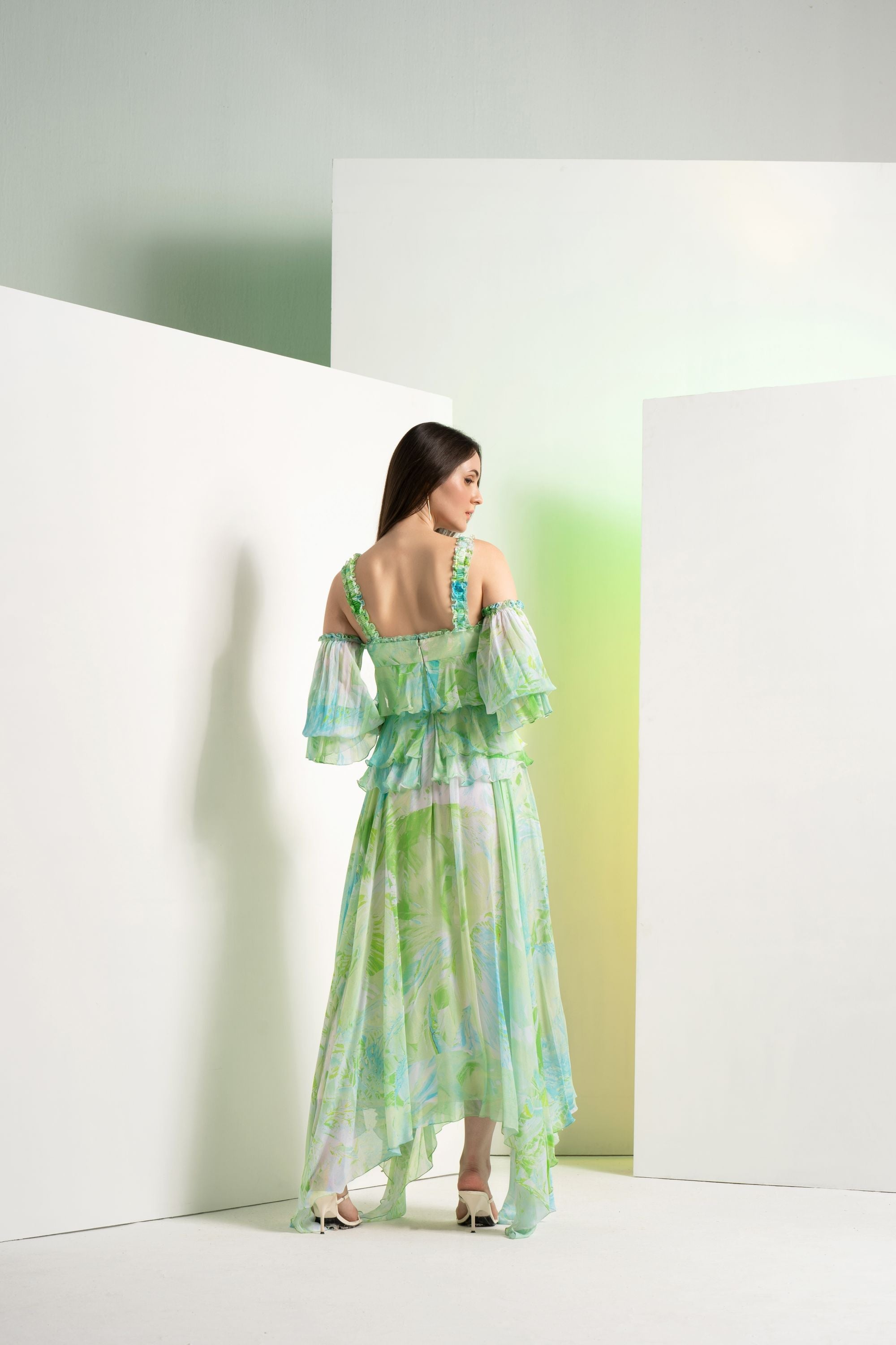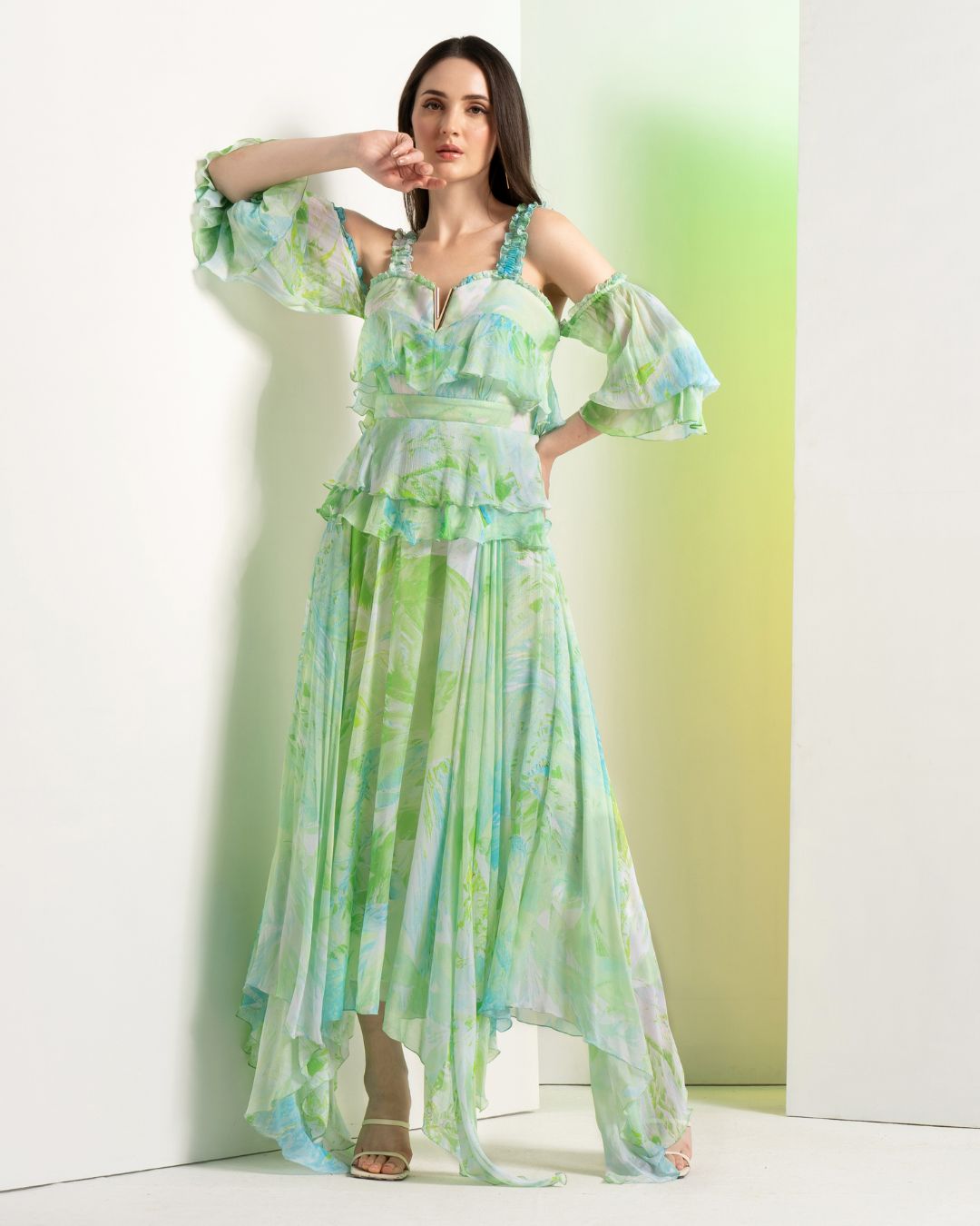 Green raw crystal printed chiffon dress with drop shoulder and high low cut falls.