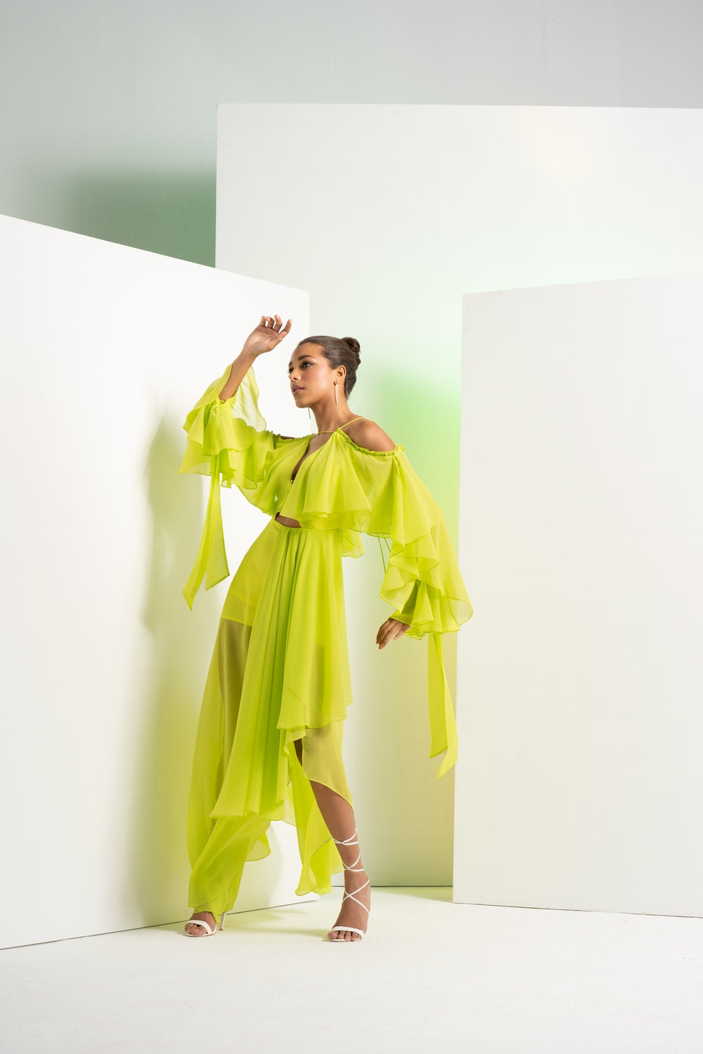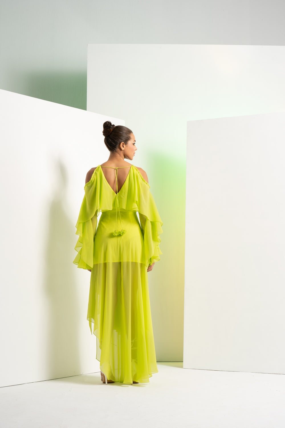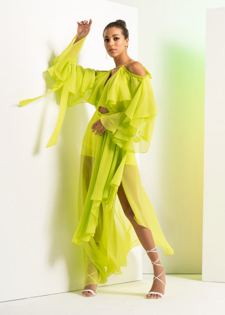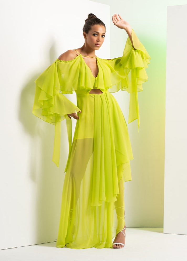 Styling: Effortlessly elegant, the Lime Green Asymmetric Dress with cascade sleeves is the perfect choice for making a stylish and unique impression at evening gatherings, garden parties, or special occasions.