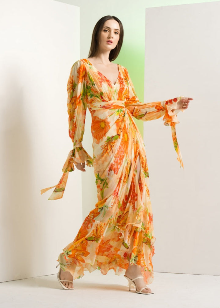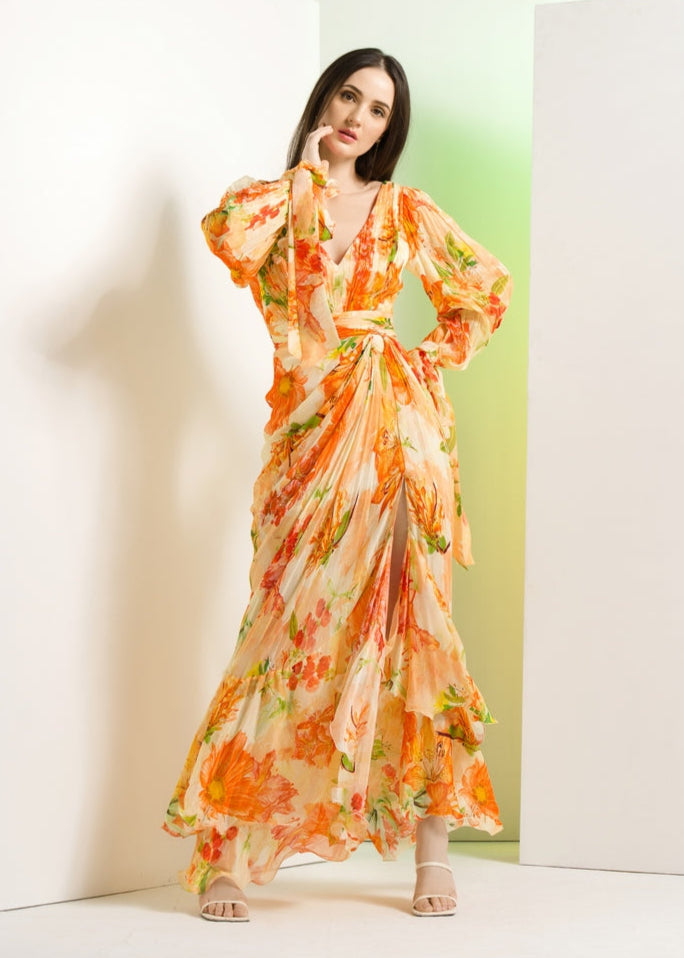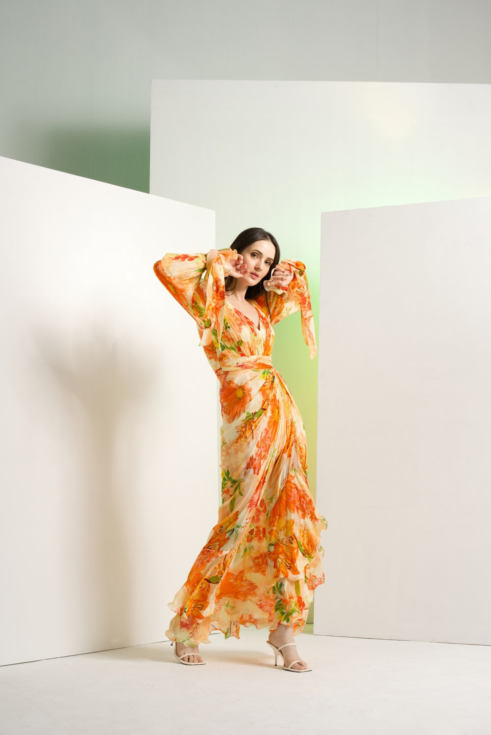 Styling: Exude vibrance and chic style with the orange lilium chiffon dress featuring waist buckle details. This dress is the perfect choice for adding a pop of color to your daytime outings and evening events, ensuring you radiate charm and sophistication.