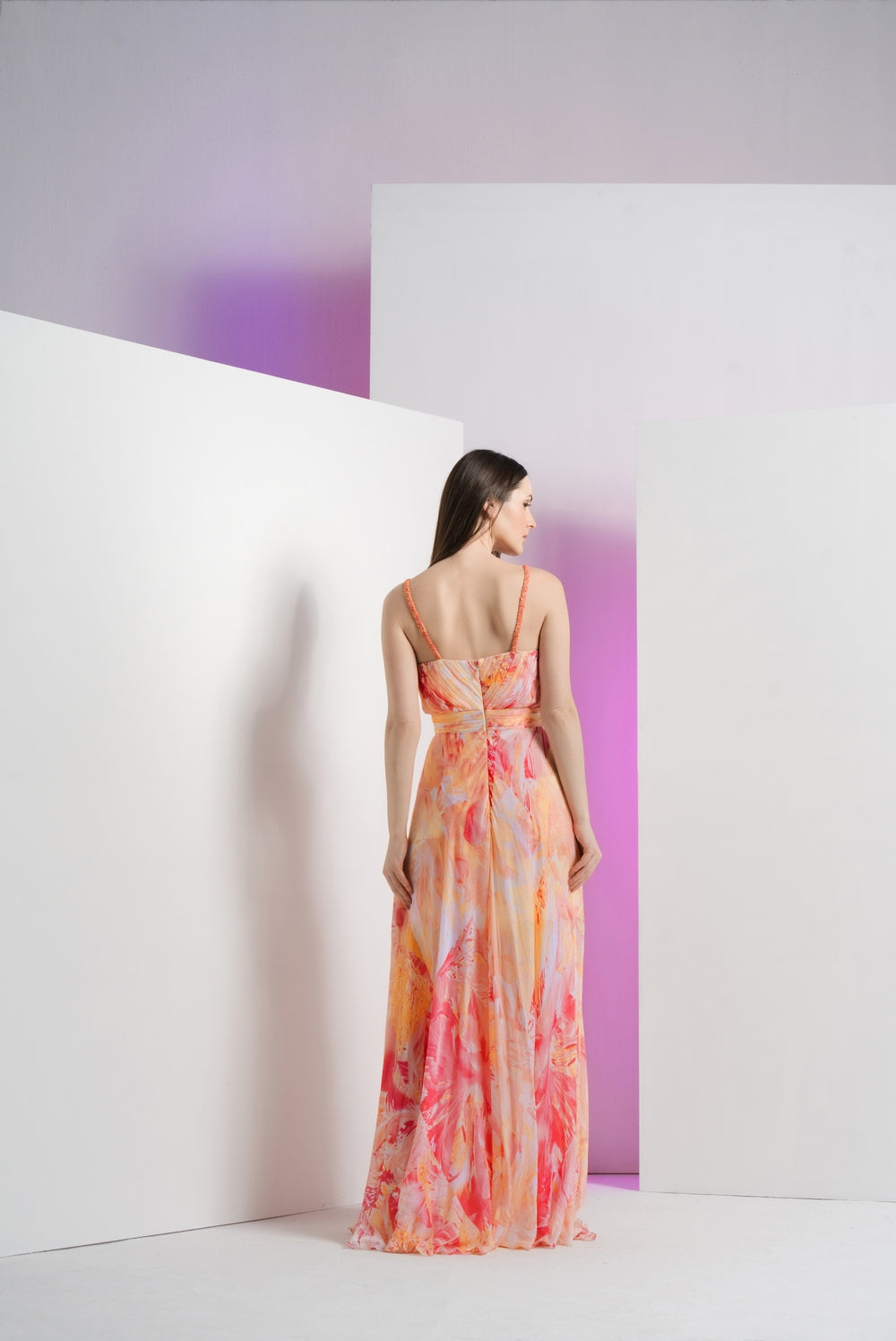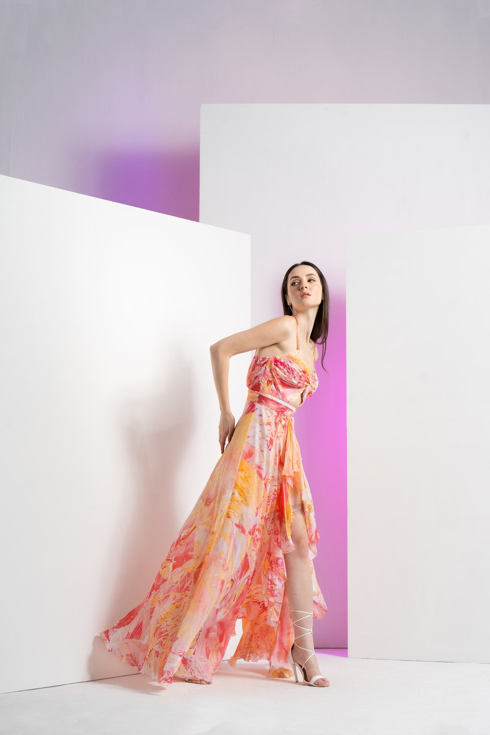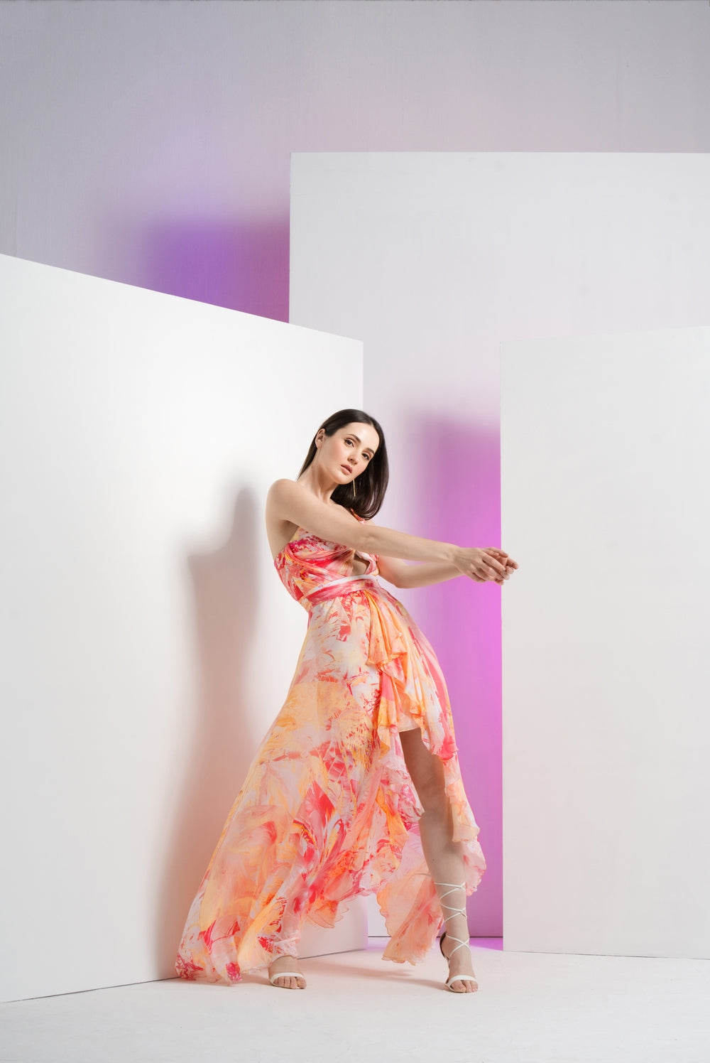 Styling: Embrace asymmetrical elegance with the peach raw crystal asymmetric dress, featuring an embroidered strap for a touch of charm and flair, making it an ideal choice for upscale events and special occasions.