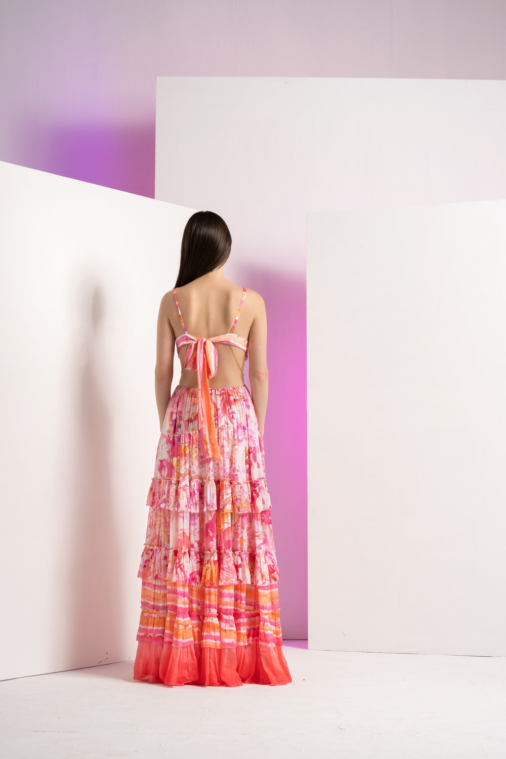 Styling: Make a bold fashion statement with the pink fancy fusion full-length dress, adorned with a stylized chain detail at the waist and a tie-up back, ideal for turning heads at upscale events or stylish soirées.