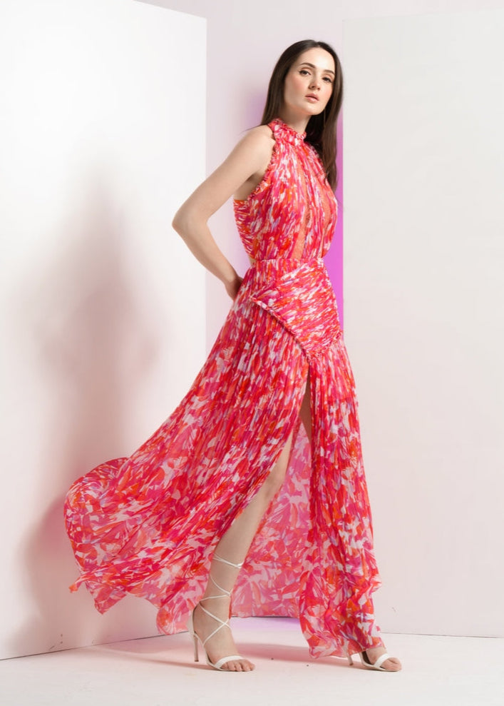Styling: Make a bold fashion statement with the pink geometric chaos full-length dress, featuring a stylized back design. This dress is ideal for upscale events, galas, or stylish soirées, ensuring you captivate attention with its unique charm and flair.