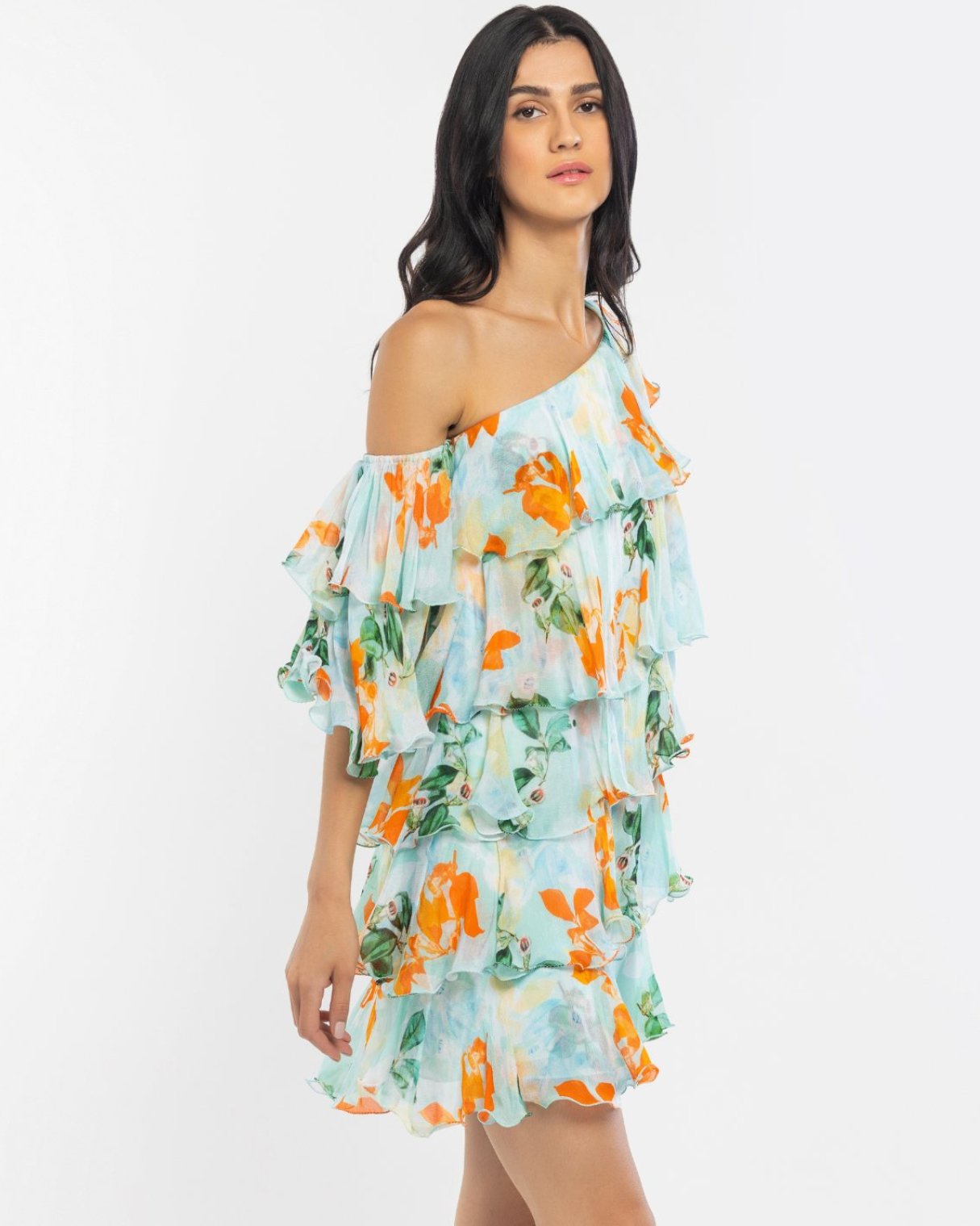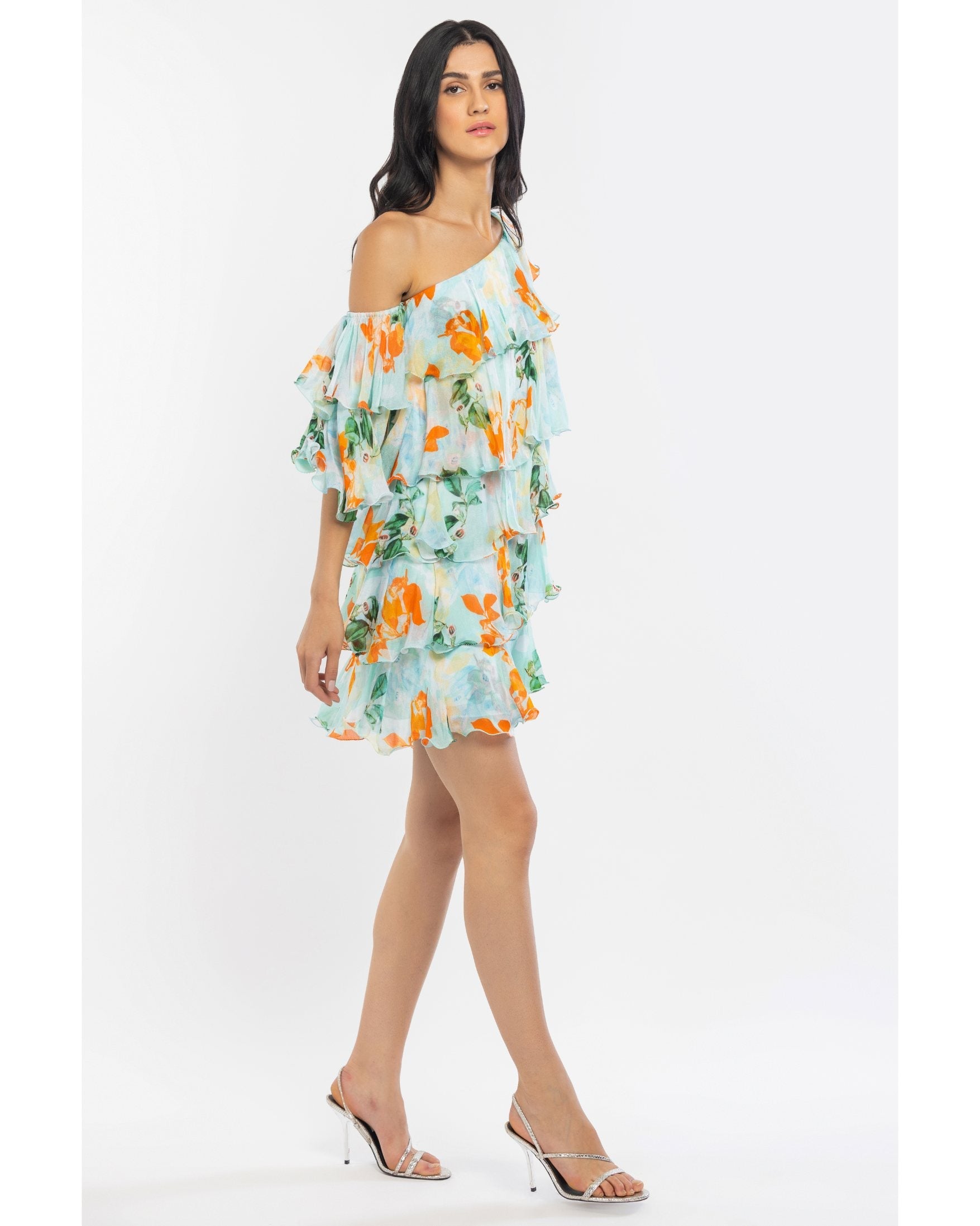 Crafted with the finest chiffon fabric, this dress boasts a mesmerizing floral print that dances with every step, leaving a trail of elegance wherever you go. The one-shoulder design adds a touch of sophistication, while the short tiered silhouette lends a playful charm to the overall look.