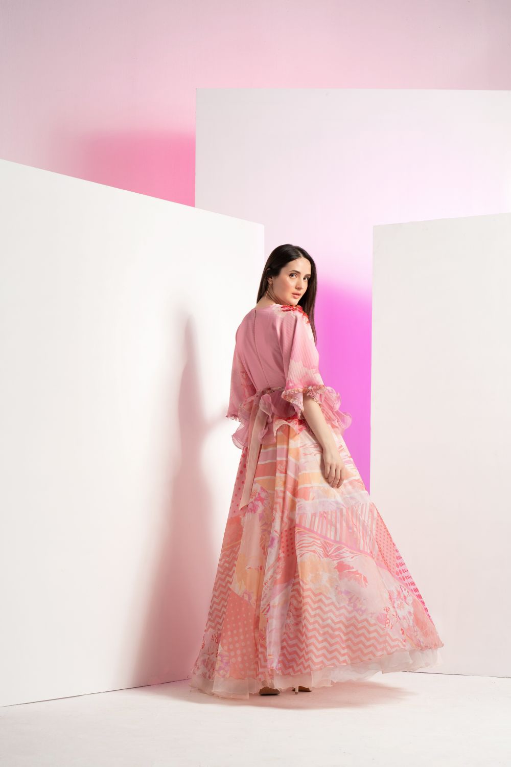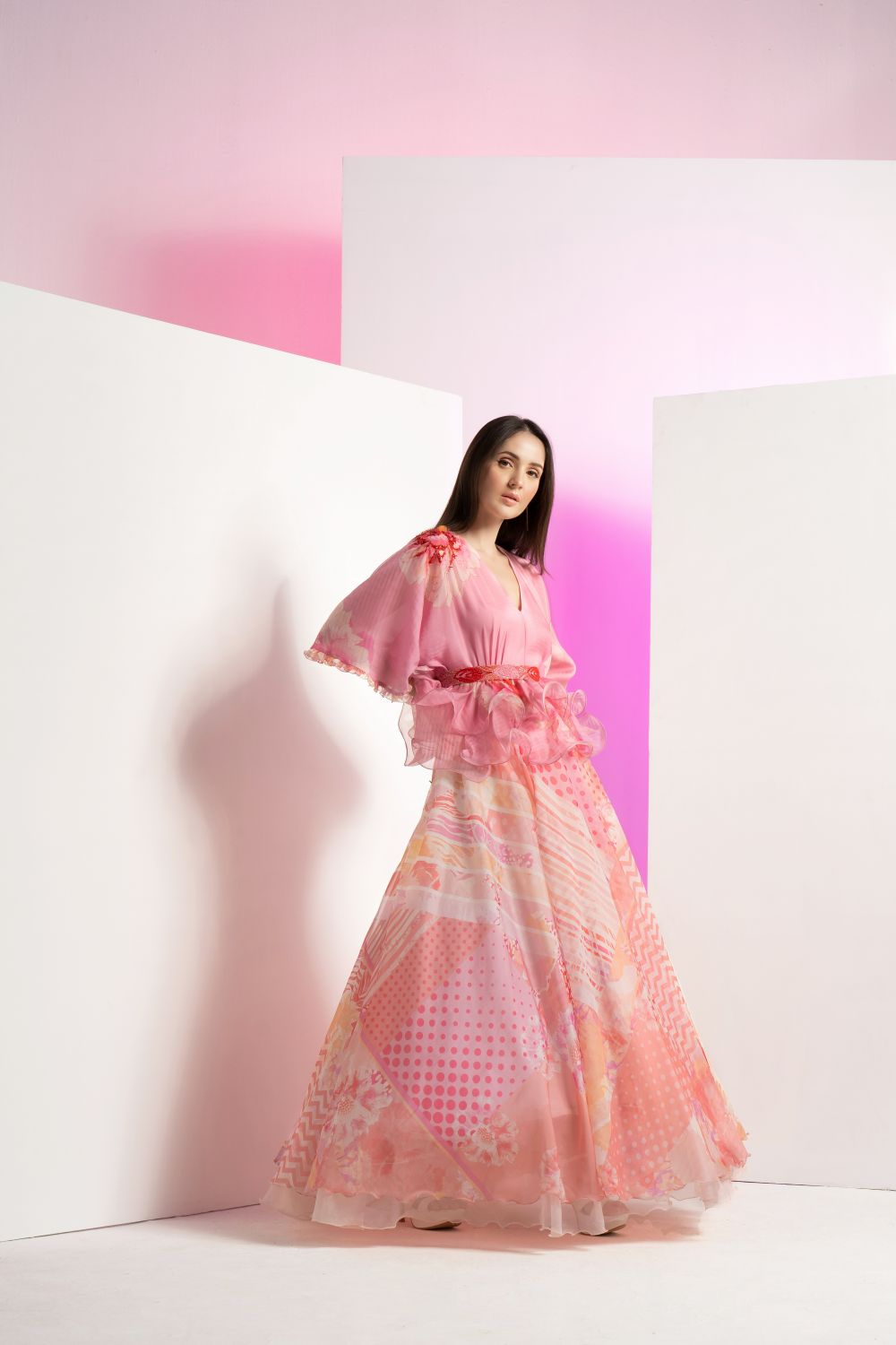 The peplum design adds a modern and flattering silhouette, enhancing your grace and style. The gown is cinched at the waist with an embroidered belt, creating a perfect balance of sophistication and contemporary chic.