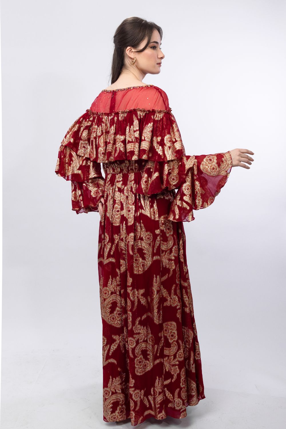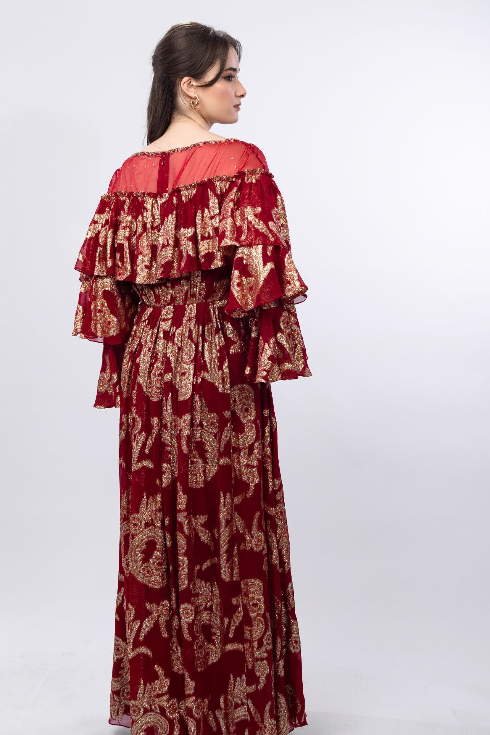 STYLING: Pair with statement earrings to amplify the allure of the Radiant Red Gold Brasso Ruffled Embroidered Organza Shoulder Dress, highlighting its unique side cut and layered sleeve.