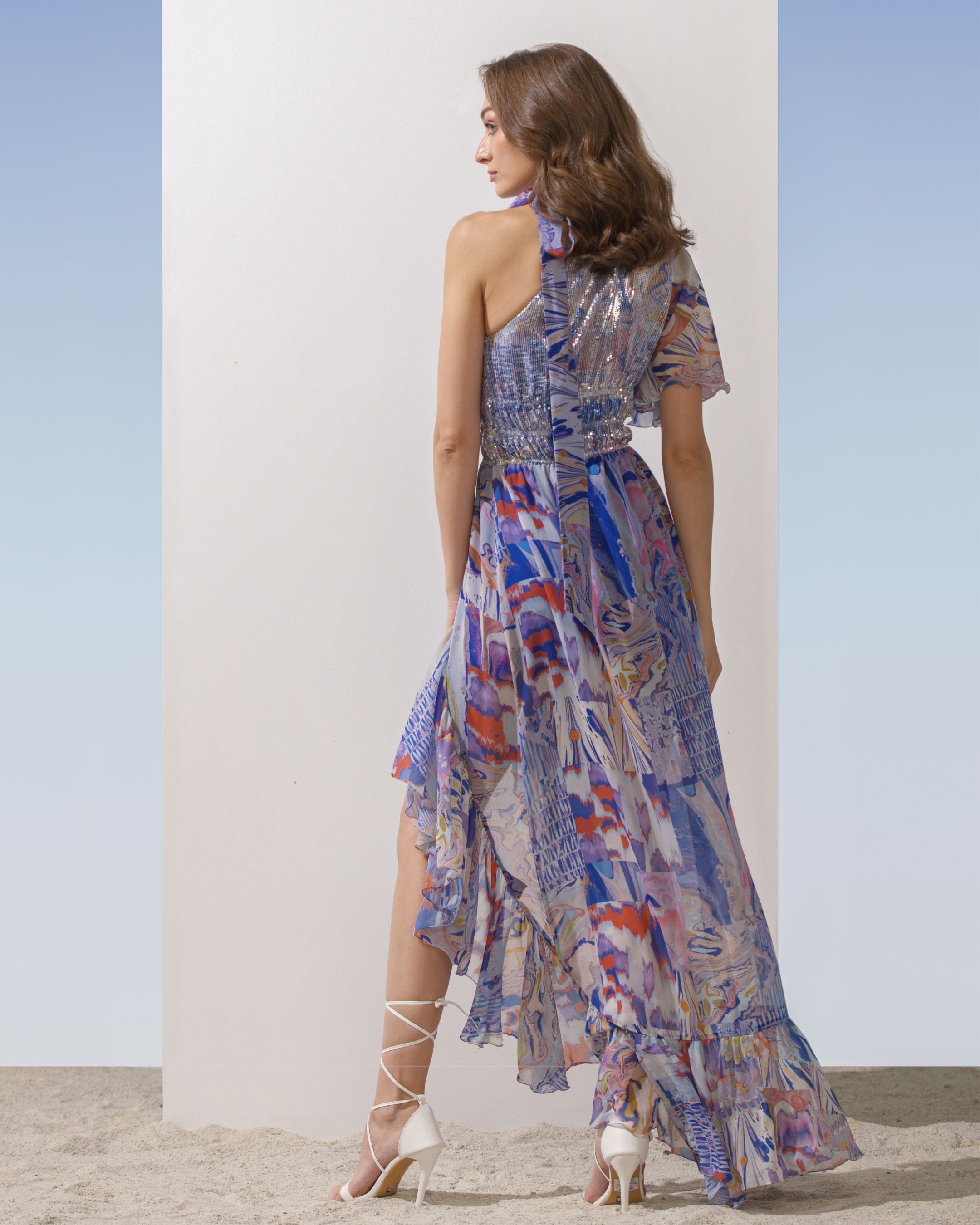 STYLING: Ideal for an art gallery opening or an evening soirée, the Chiffon Blue Printed Asymmetric Fall Dress combines artistic flair with graceful style