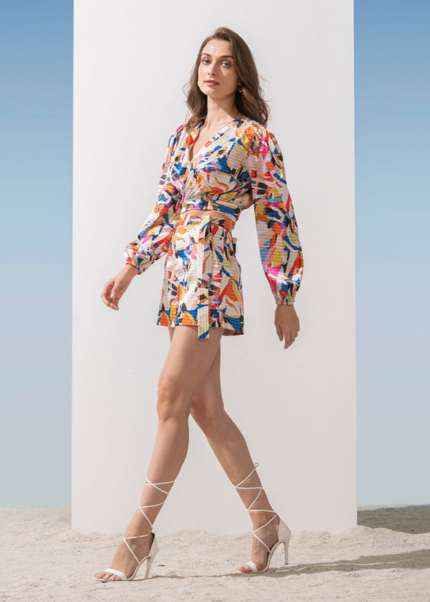 Elevate your style with our Satin Geometric Printed Wrap Top paired with Printed Shorts, a two-piece ensemble that effortlessly blends chic and comfort. Crafted from luxurious Satin in a captivating Multi-Color palette, this set is a testament to modern sophistication.