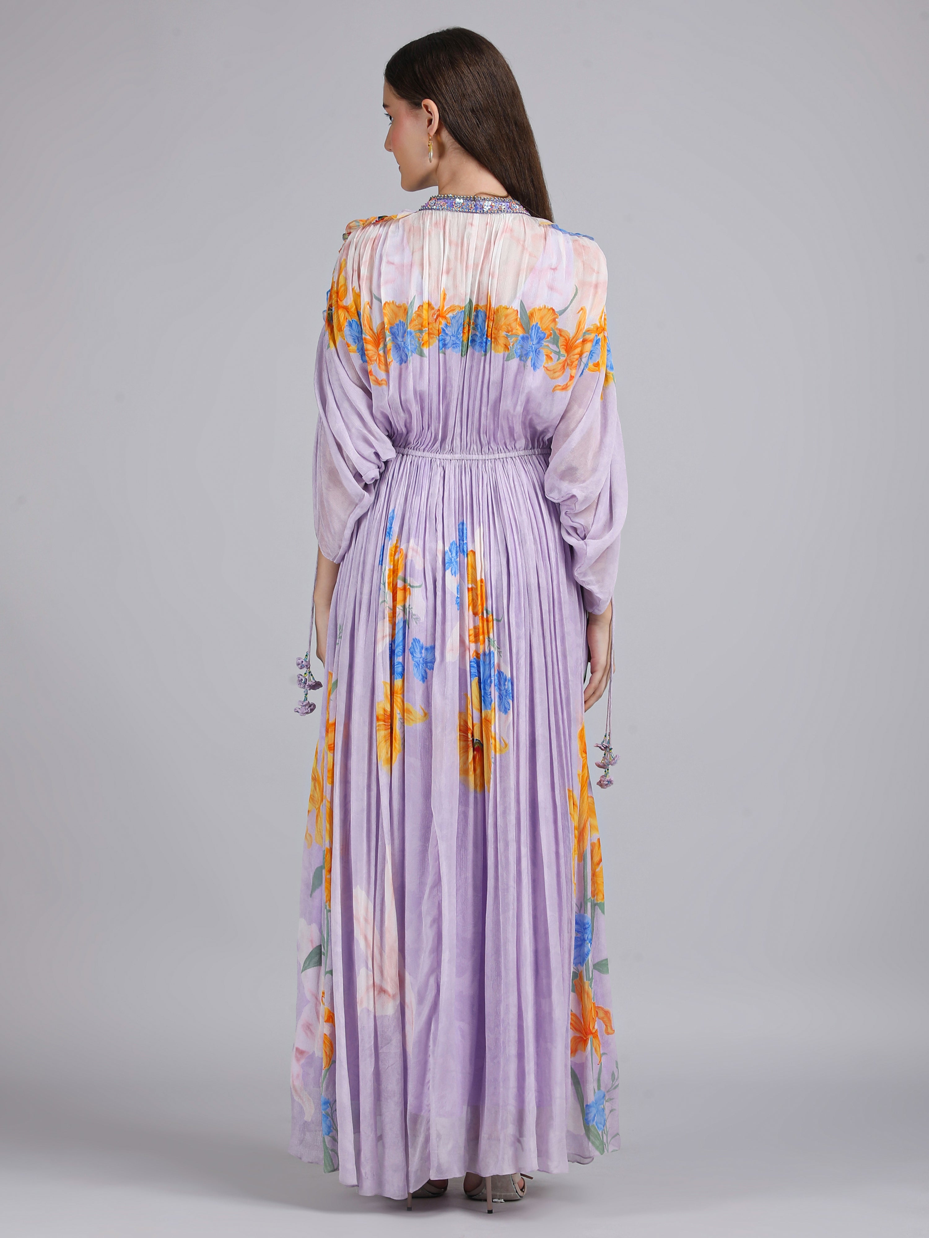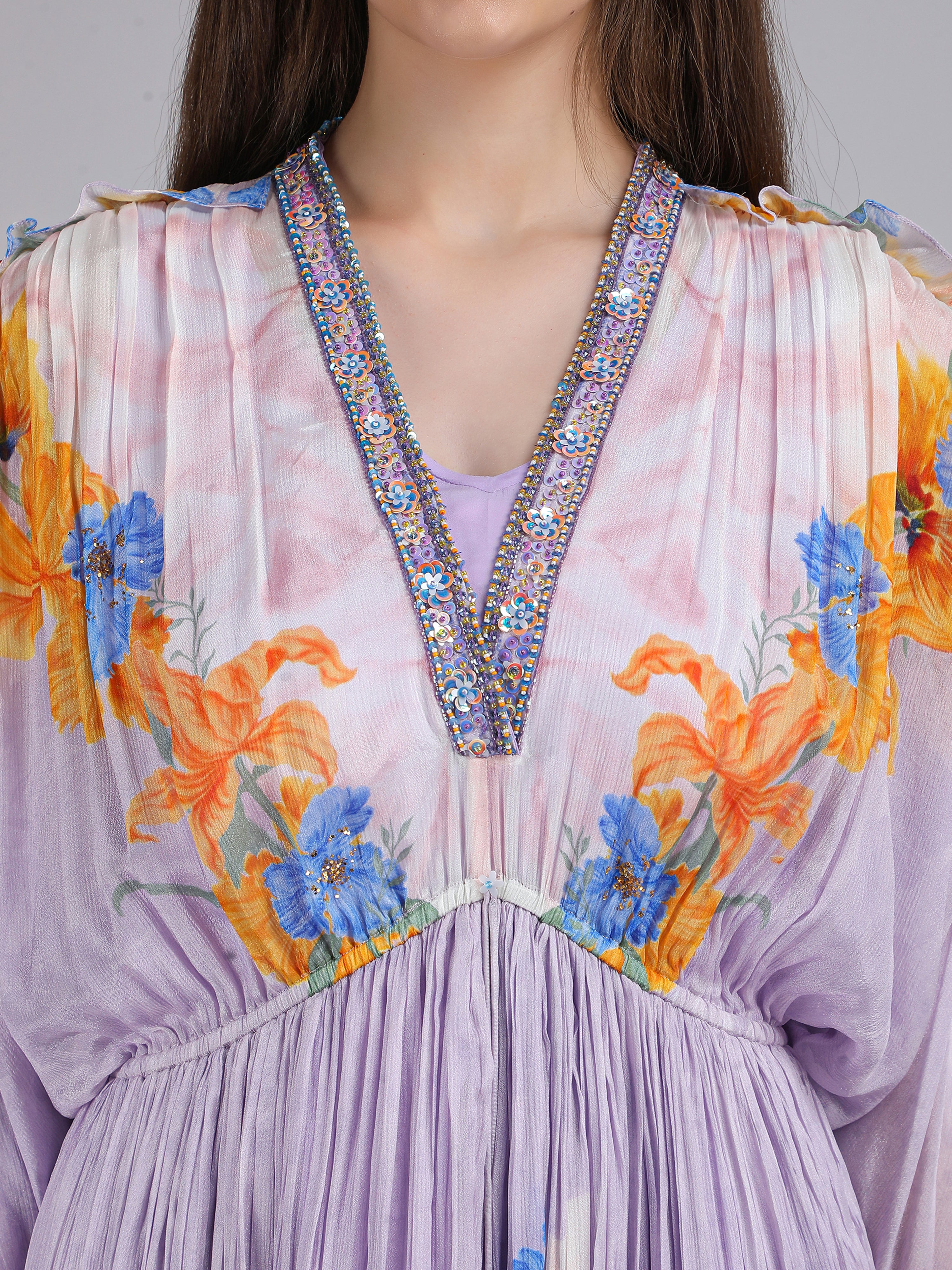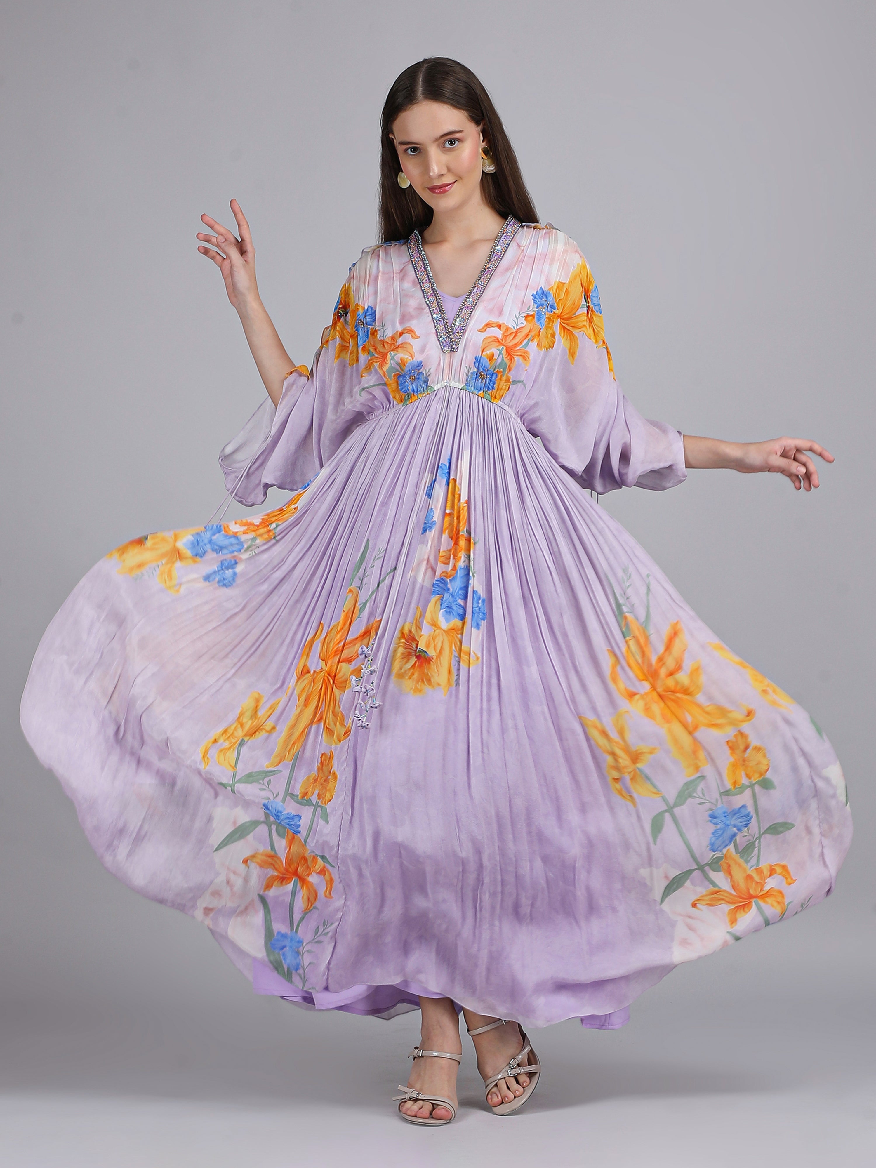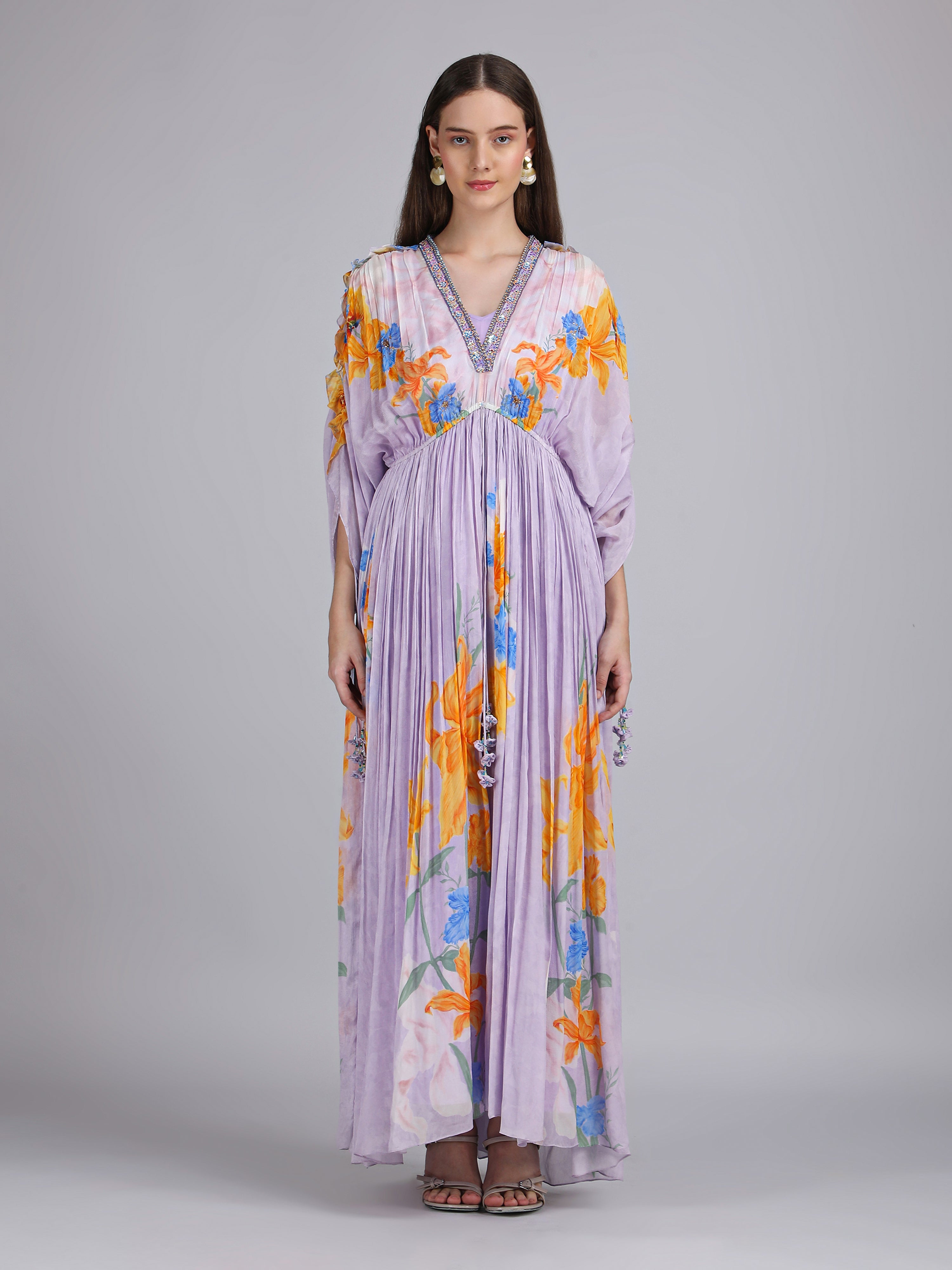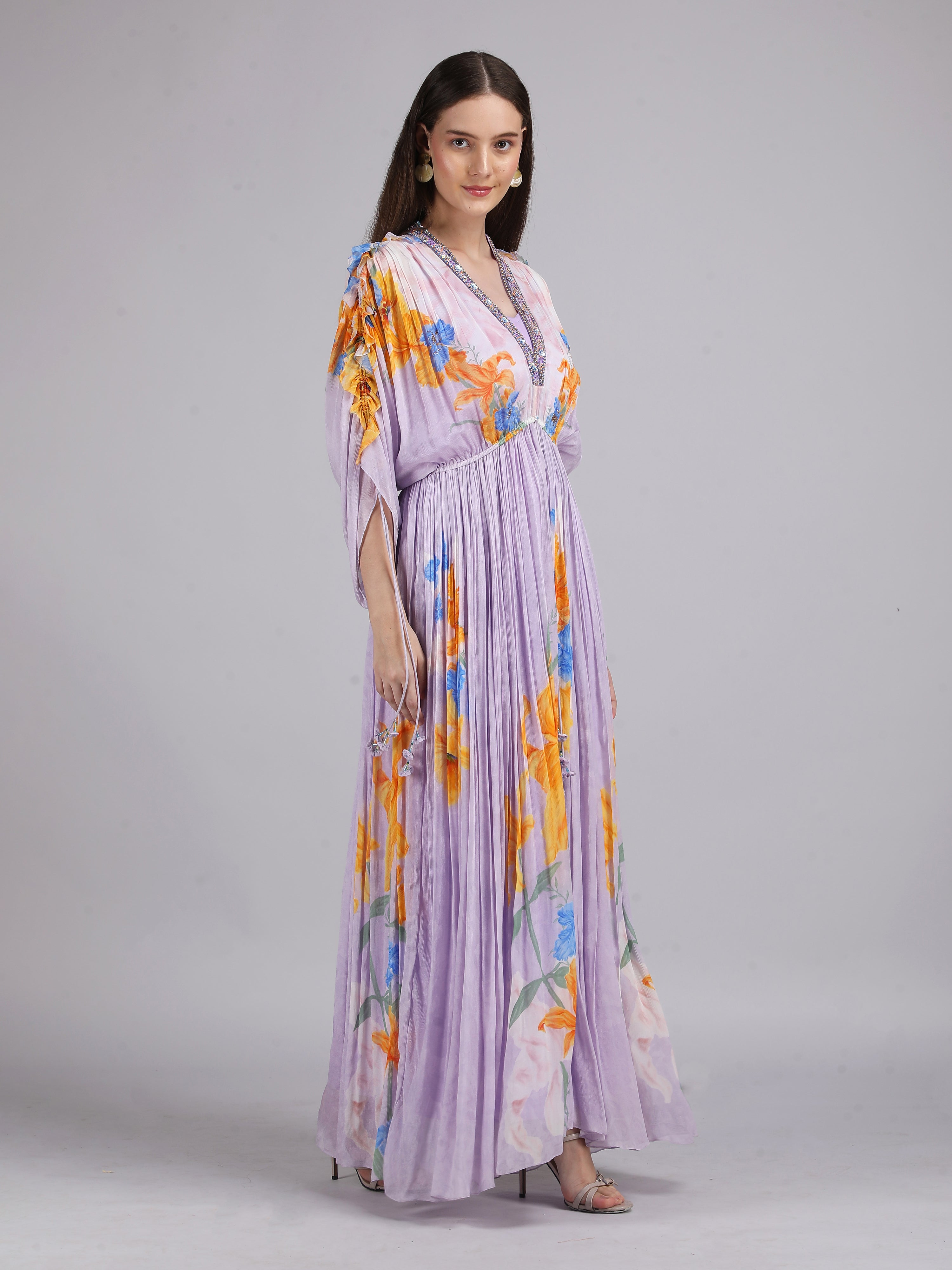 Stand apart in this muted lavender placement print kaftan, finished with subtle embroidery and soft ruffle detailing for modern, understated elegance.