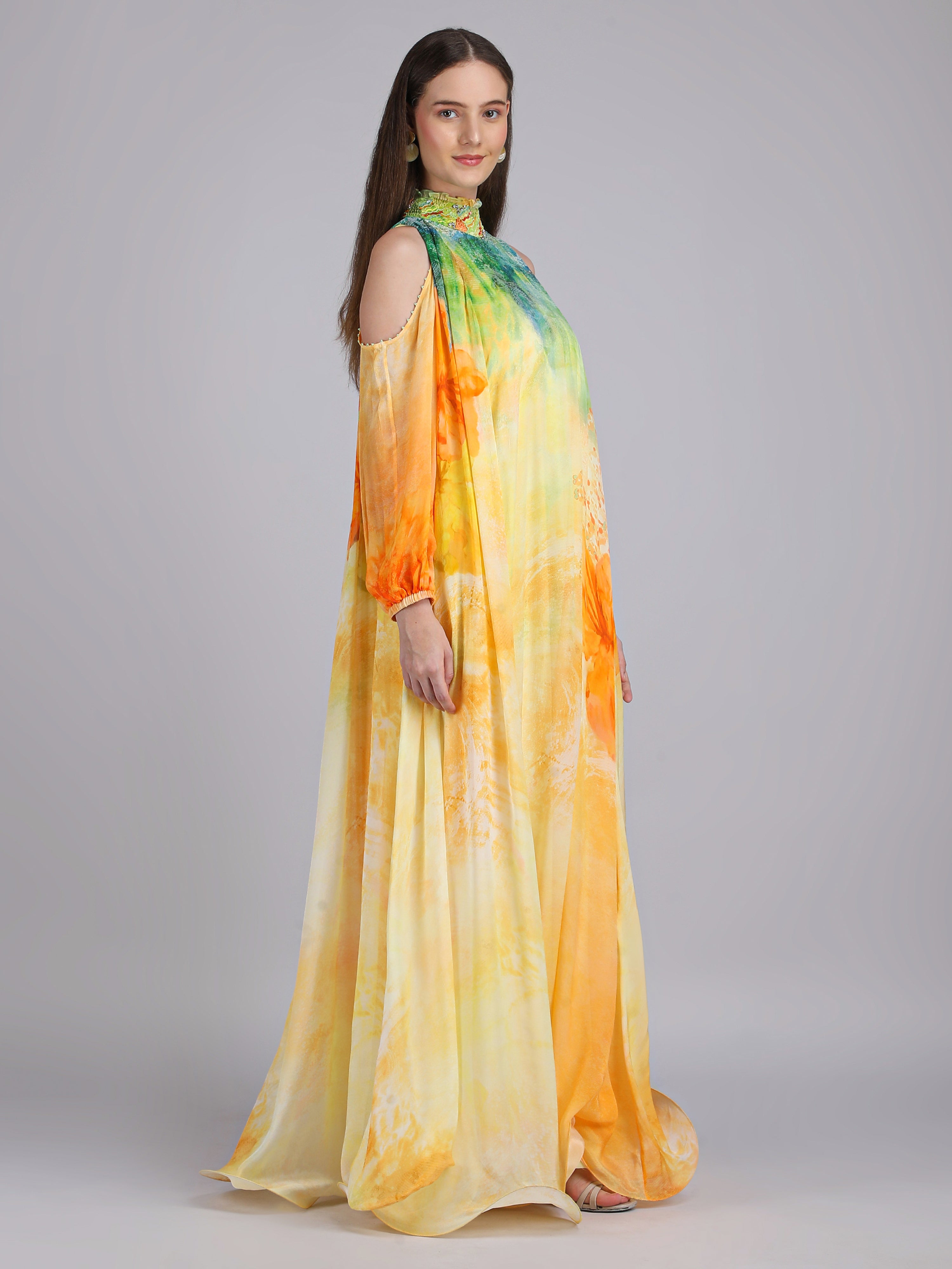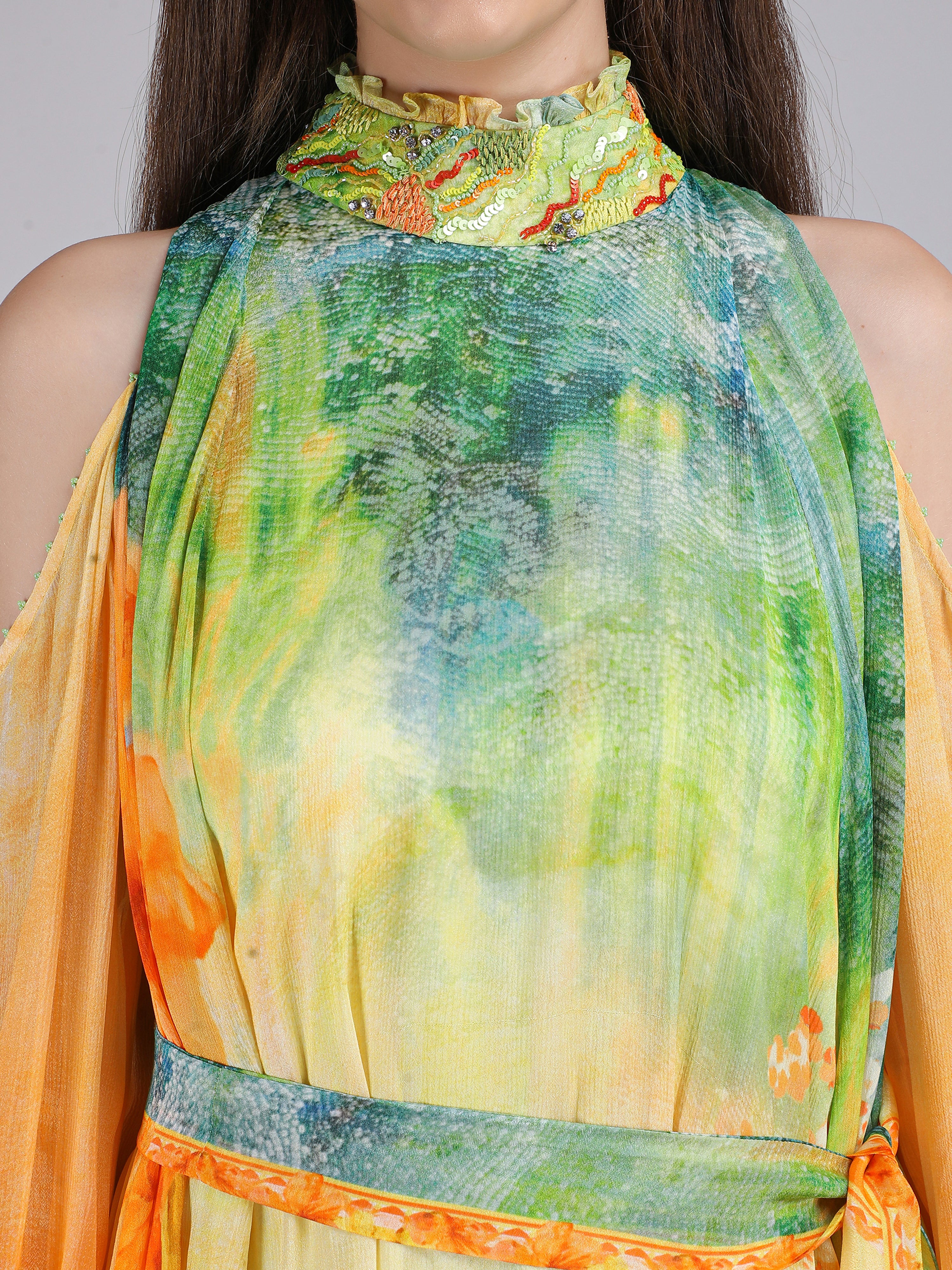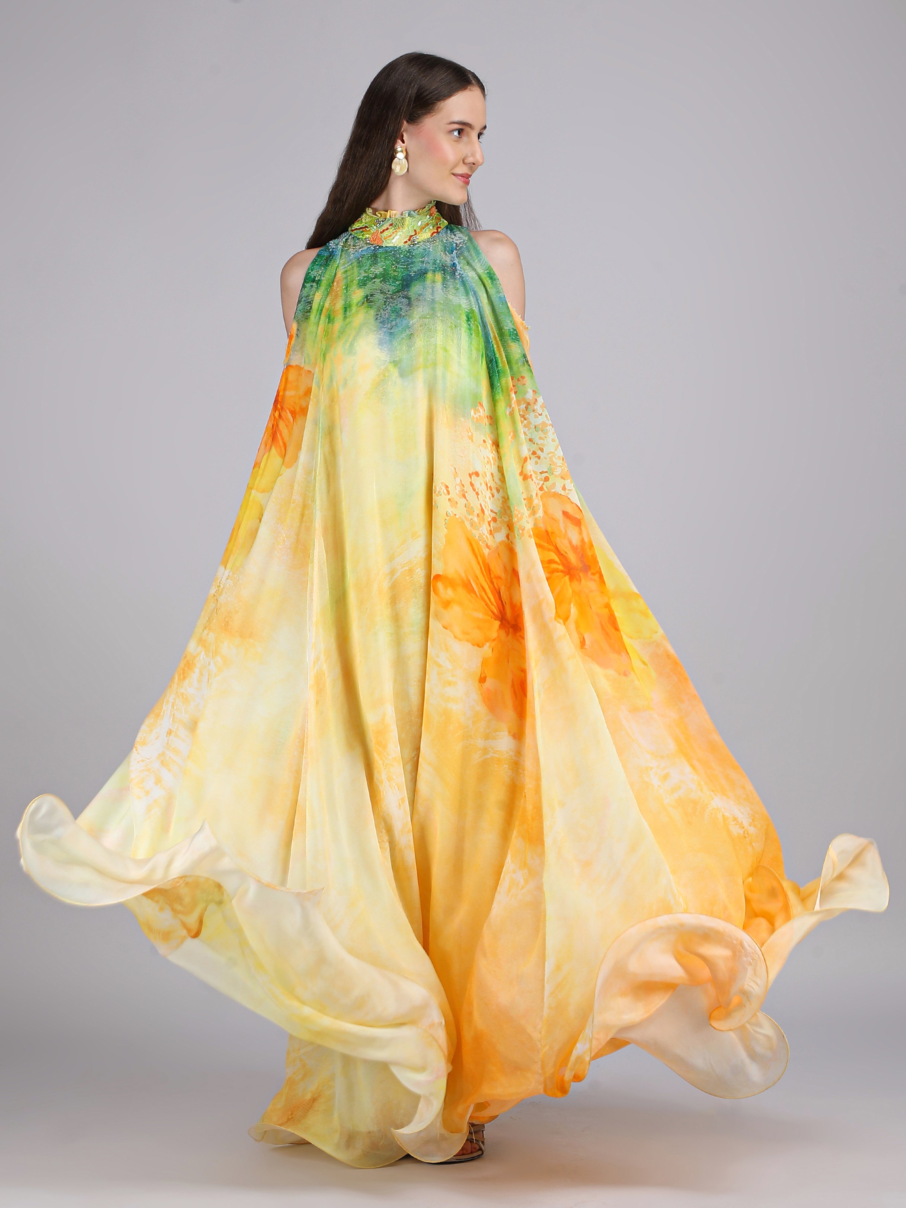 Vibrant floral dress with wired hemline, embriodred collar offer a touch of elegance.