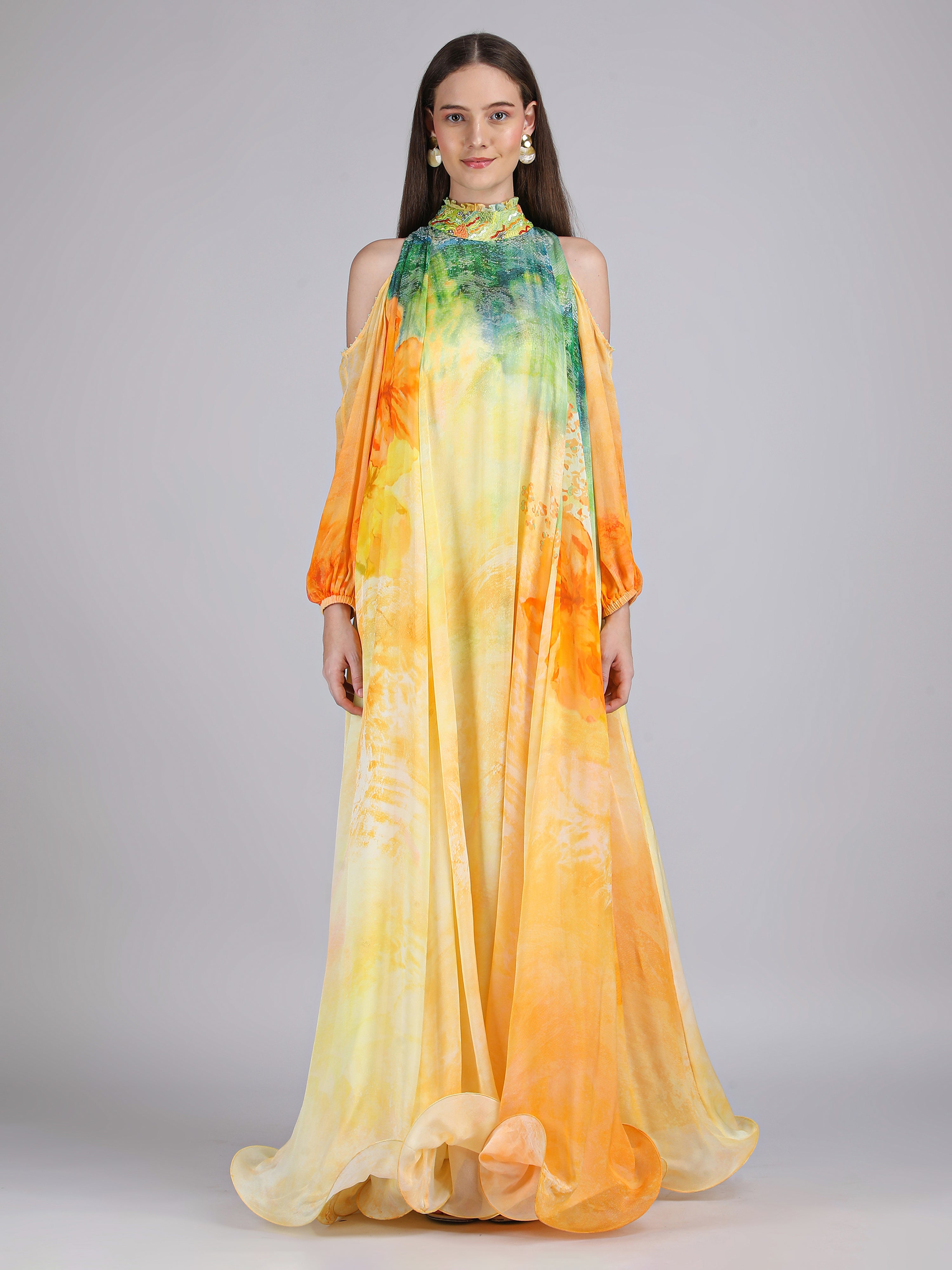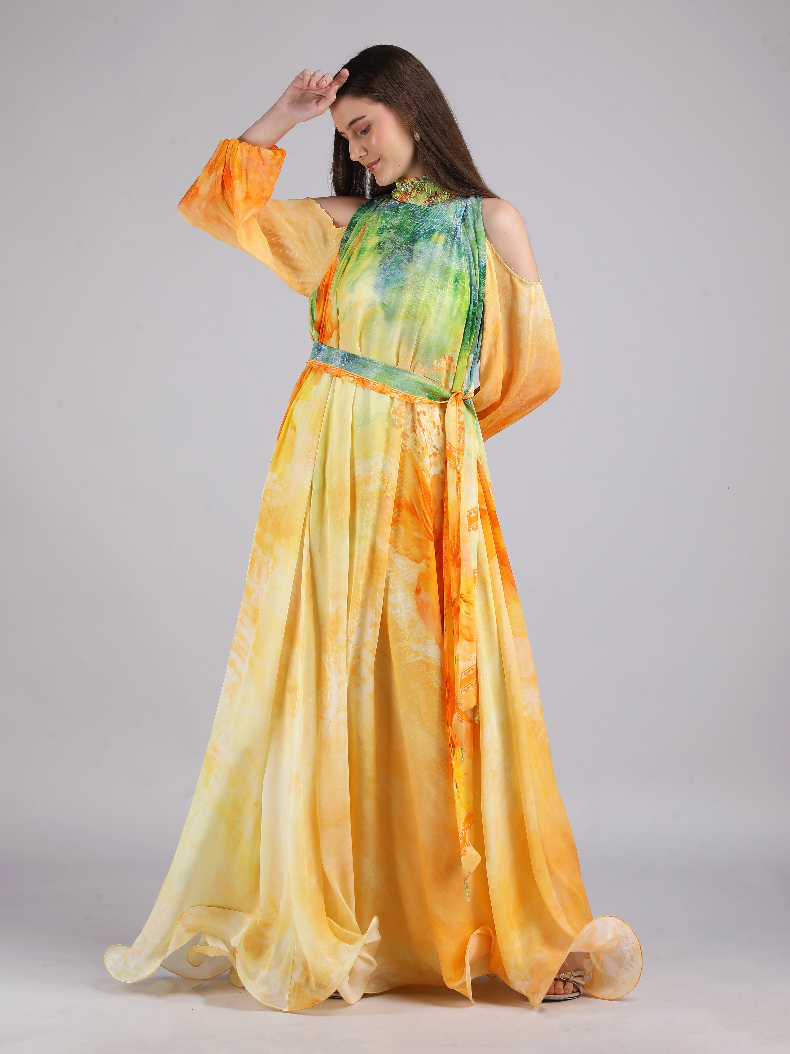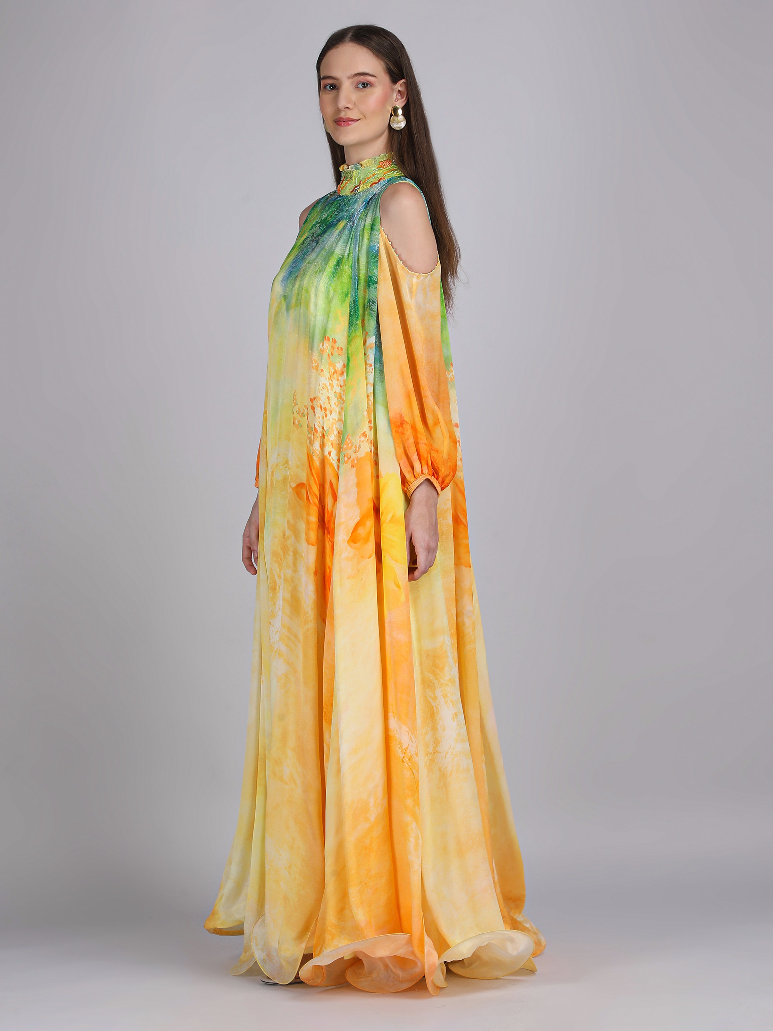 Vibrant floral dress with wired hemline, embriodred collar offer a touch of elegance.