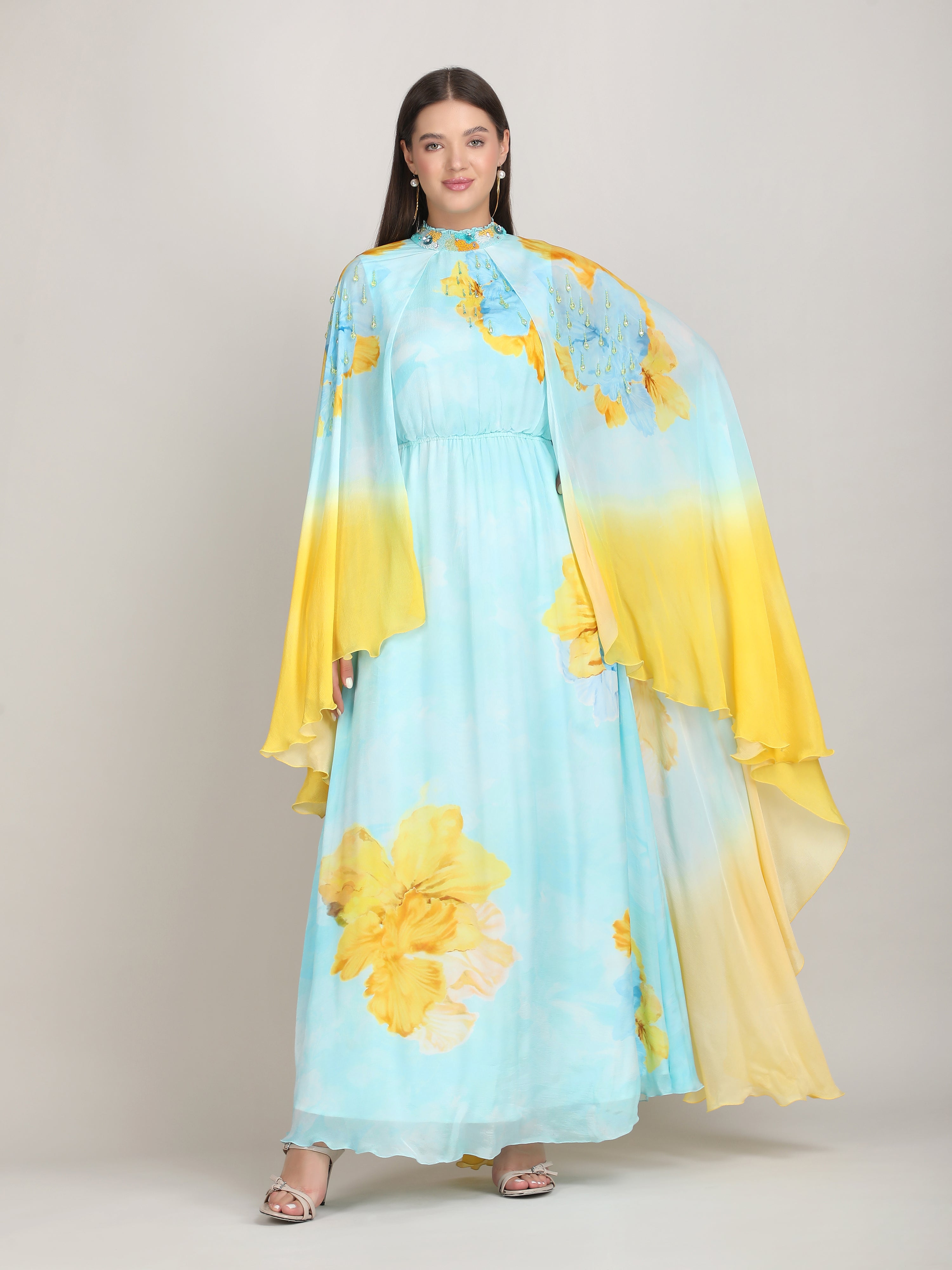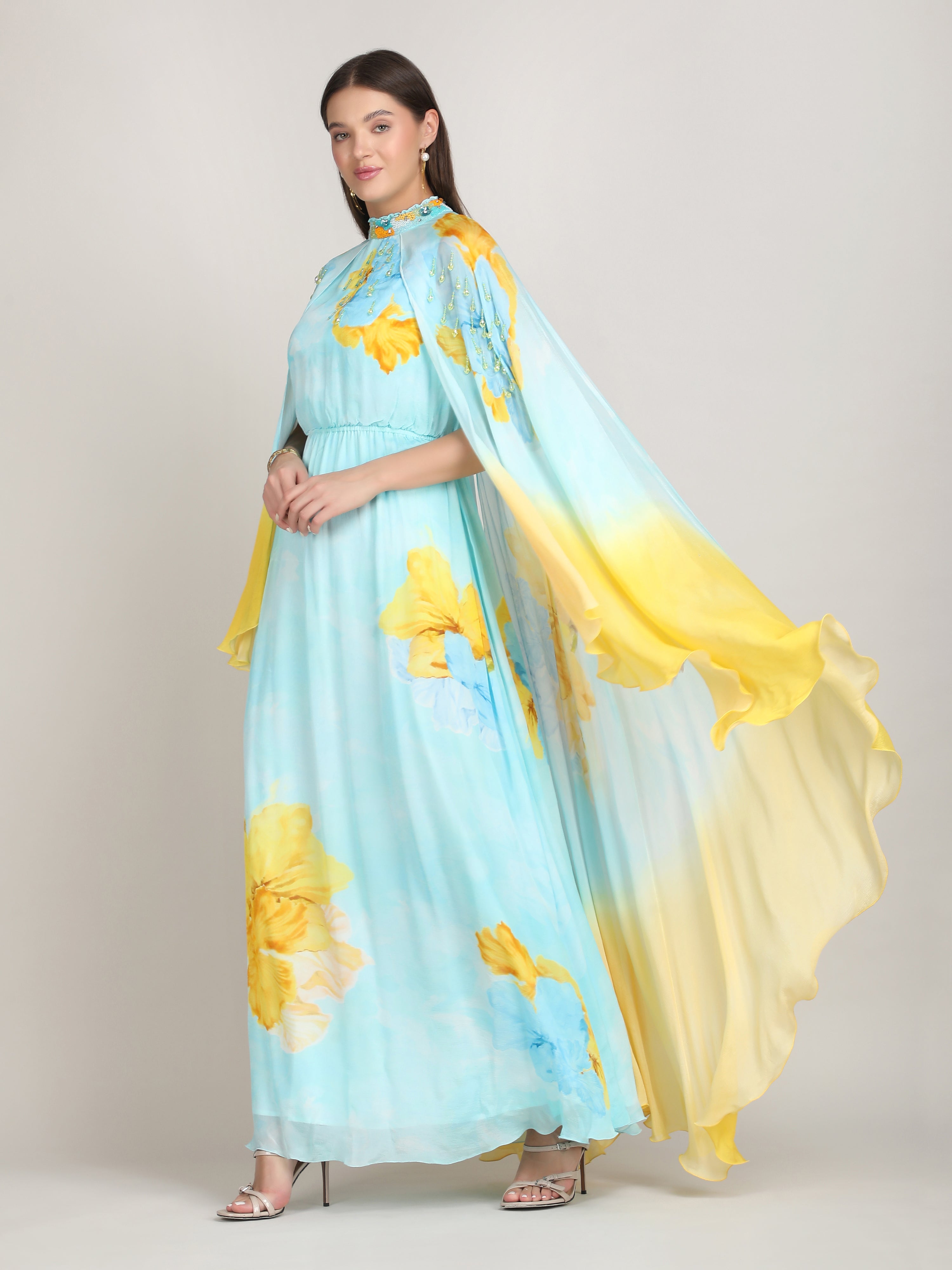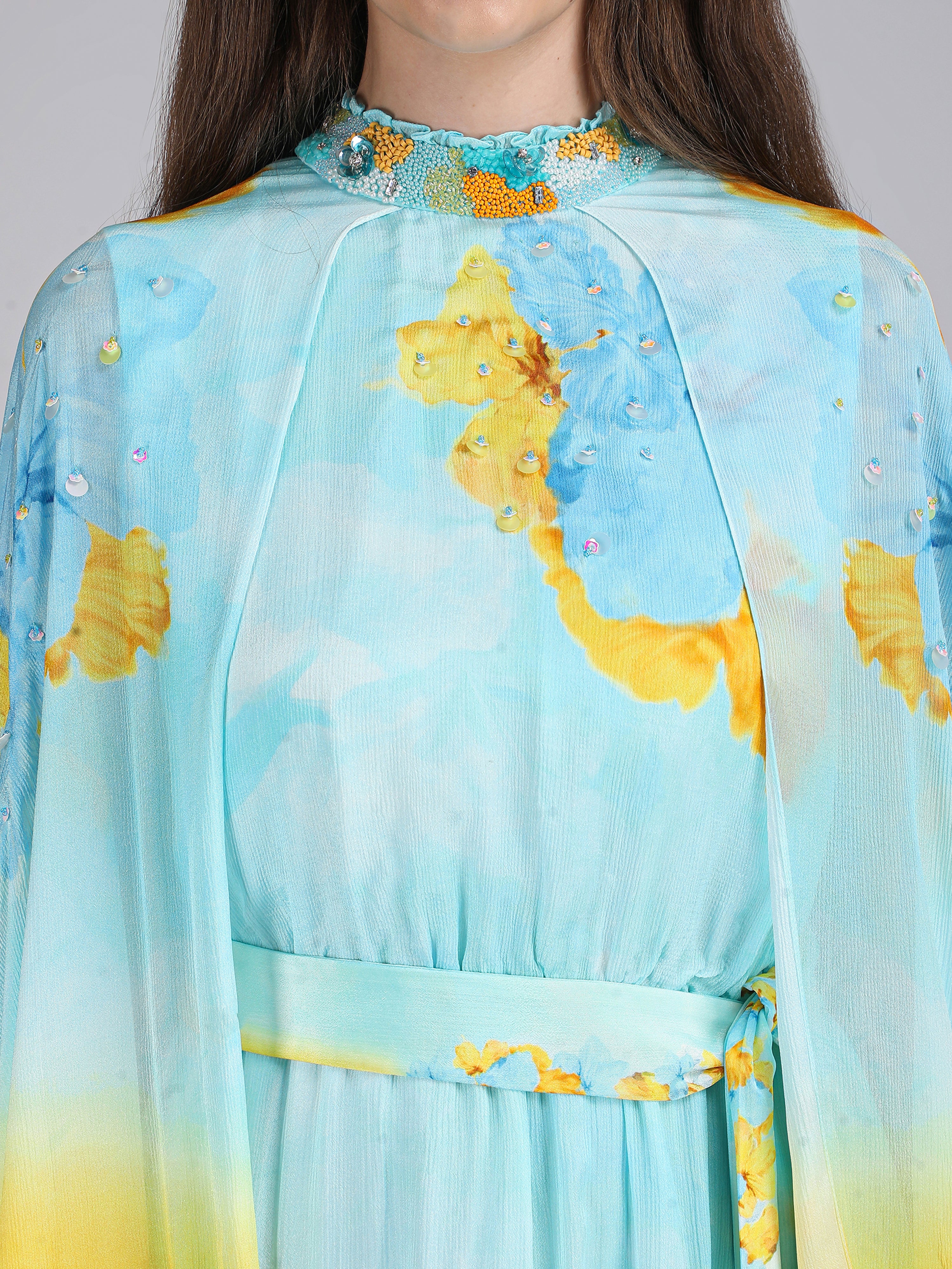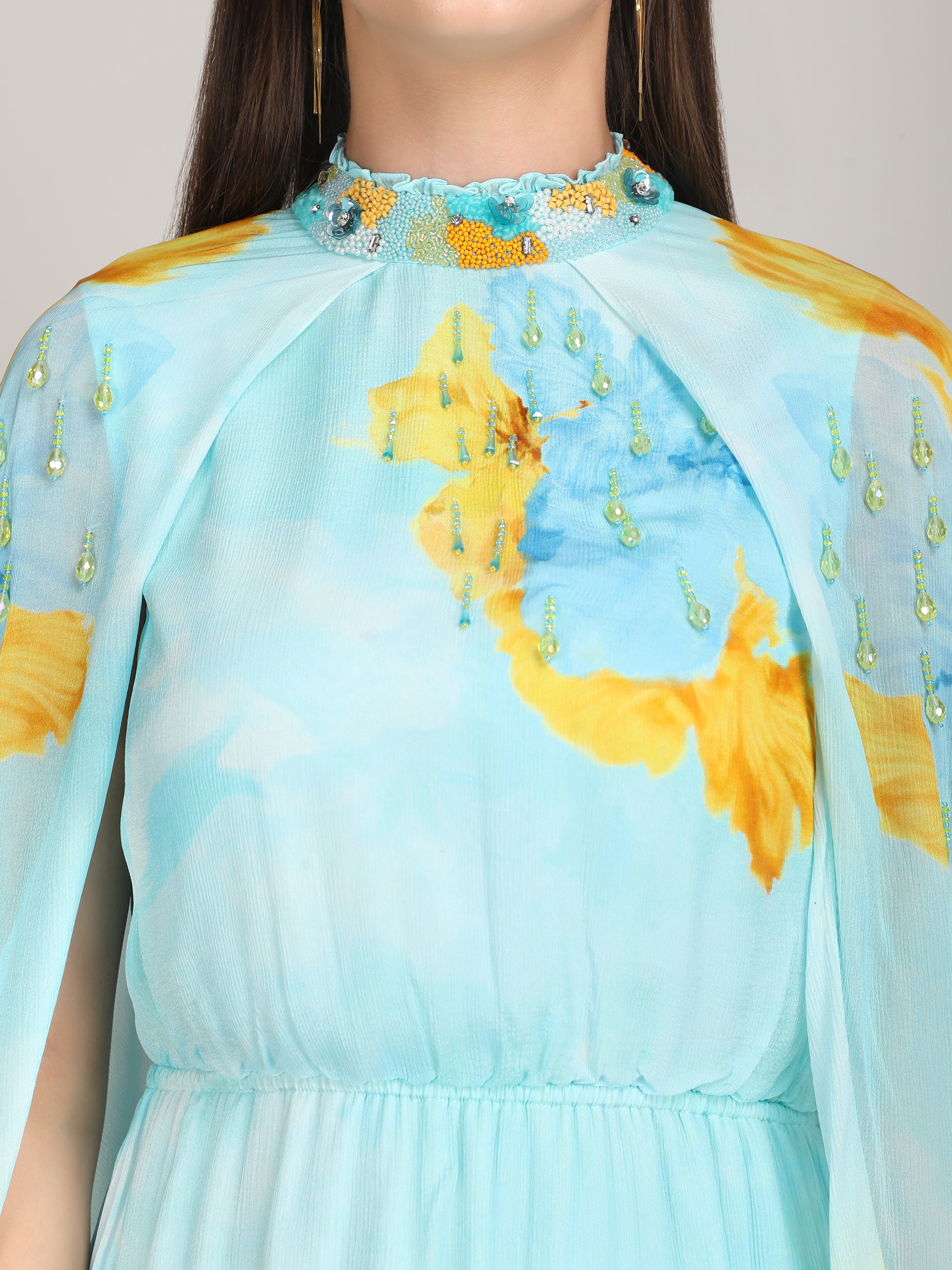 Radiate elegance in this vibrant dress featuring a captivating placement print, embriodery collar and cape sleeves. Perfect for breezy beach escapes.