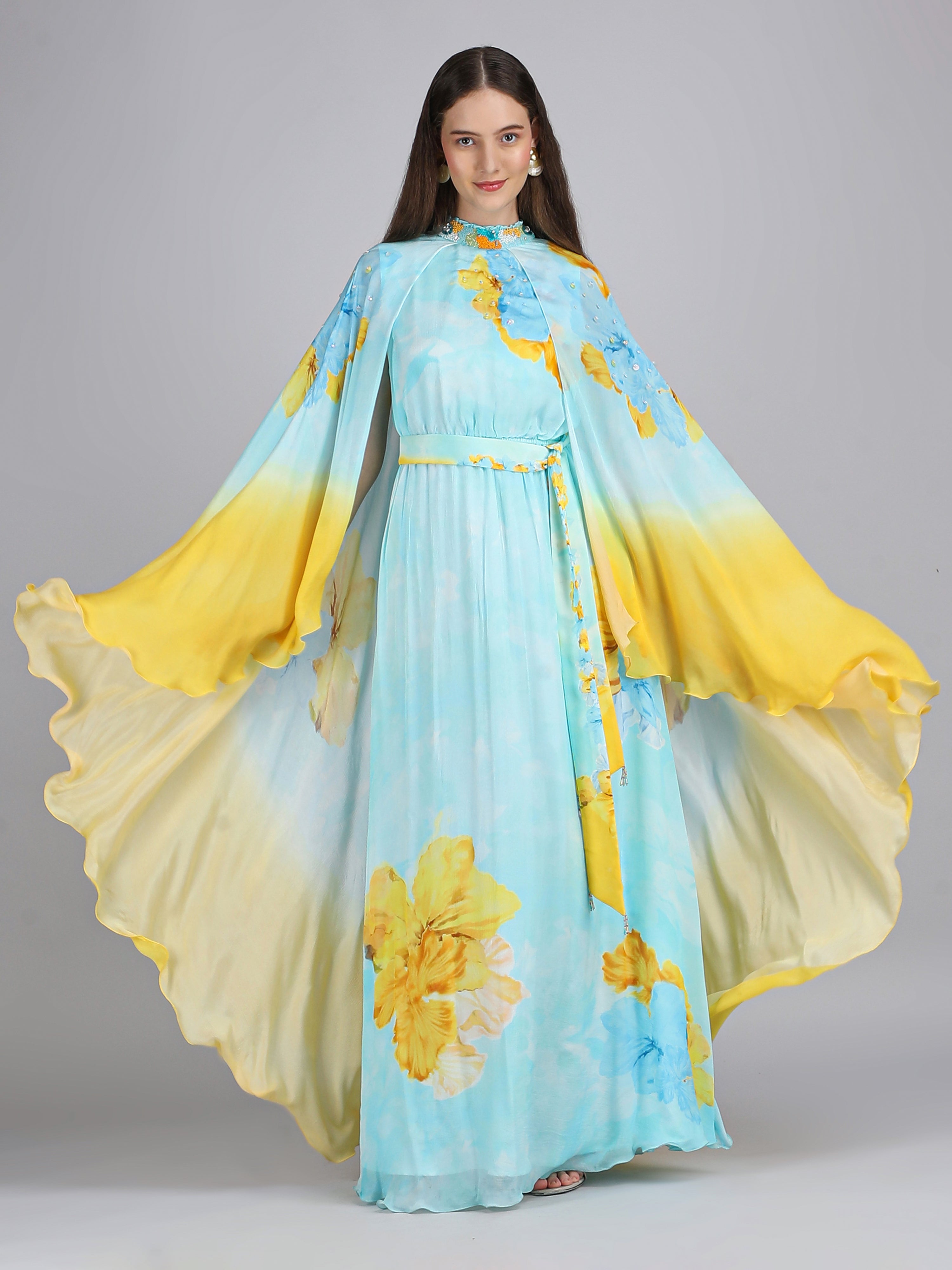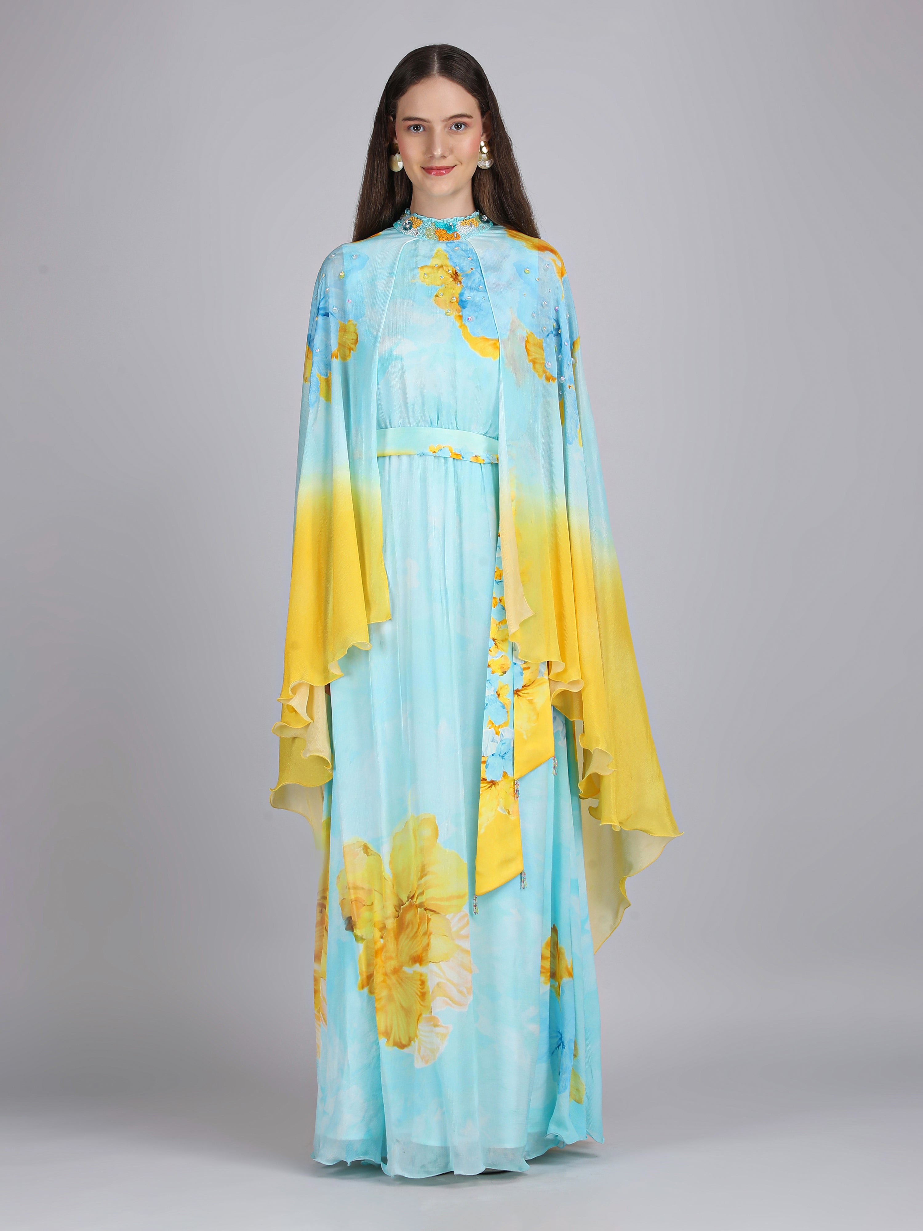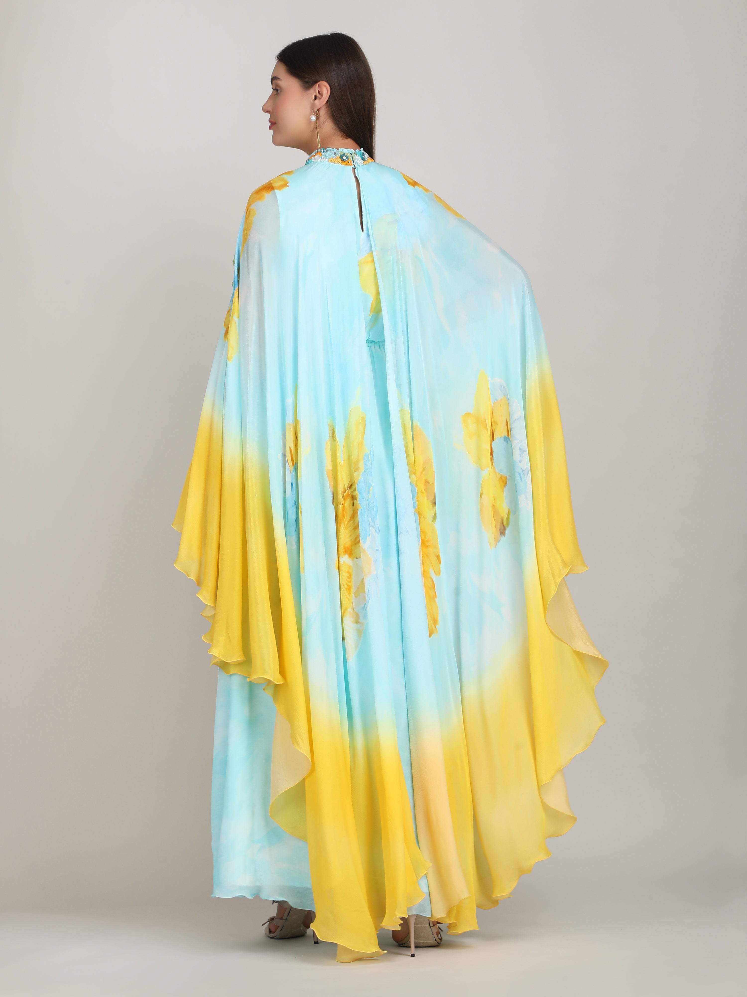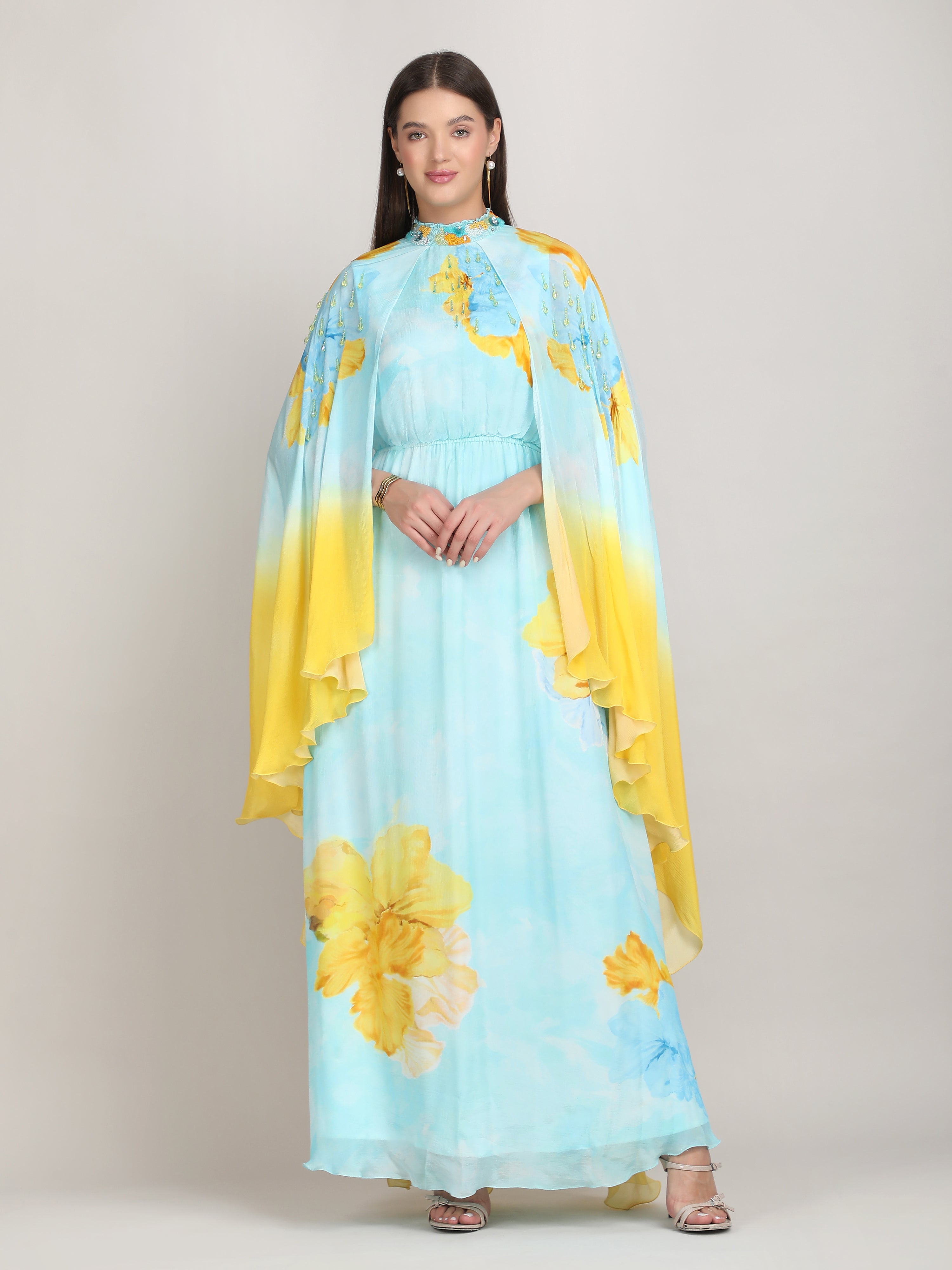 Radiate elegance in this vibrant dress featuring a captivating placement print, embriodery collar and cape sleeves. Perfect for breezy beach escapes.
