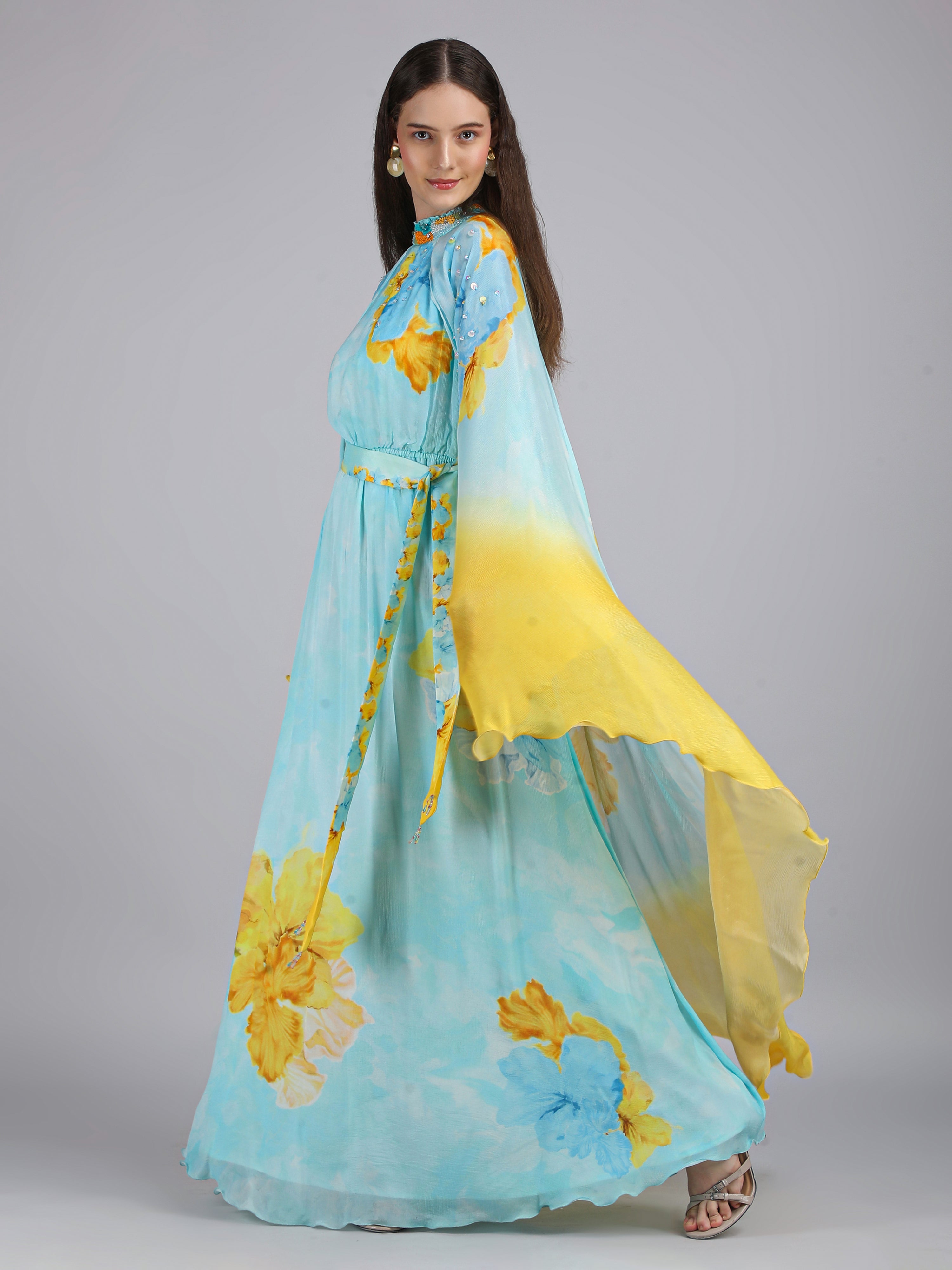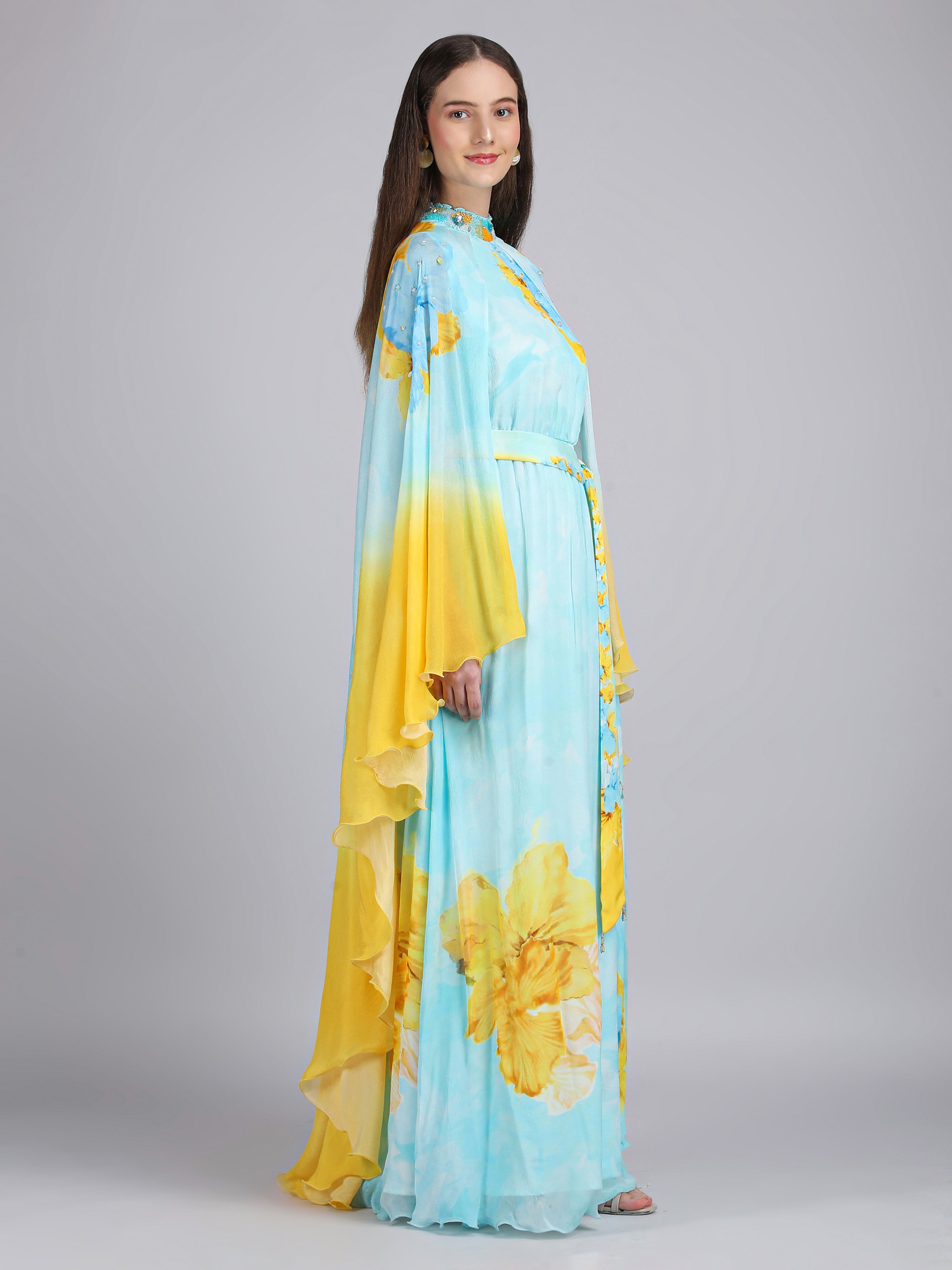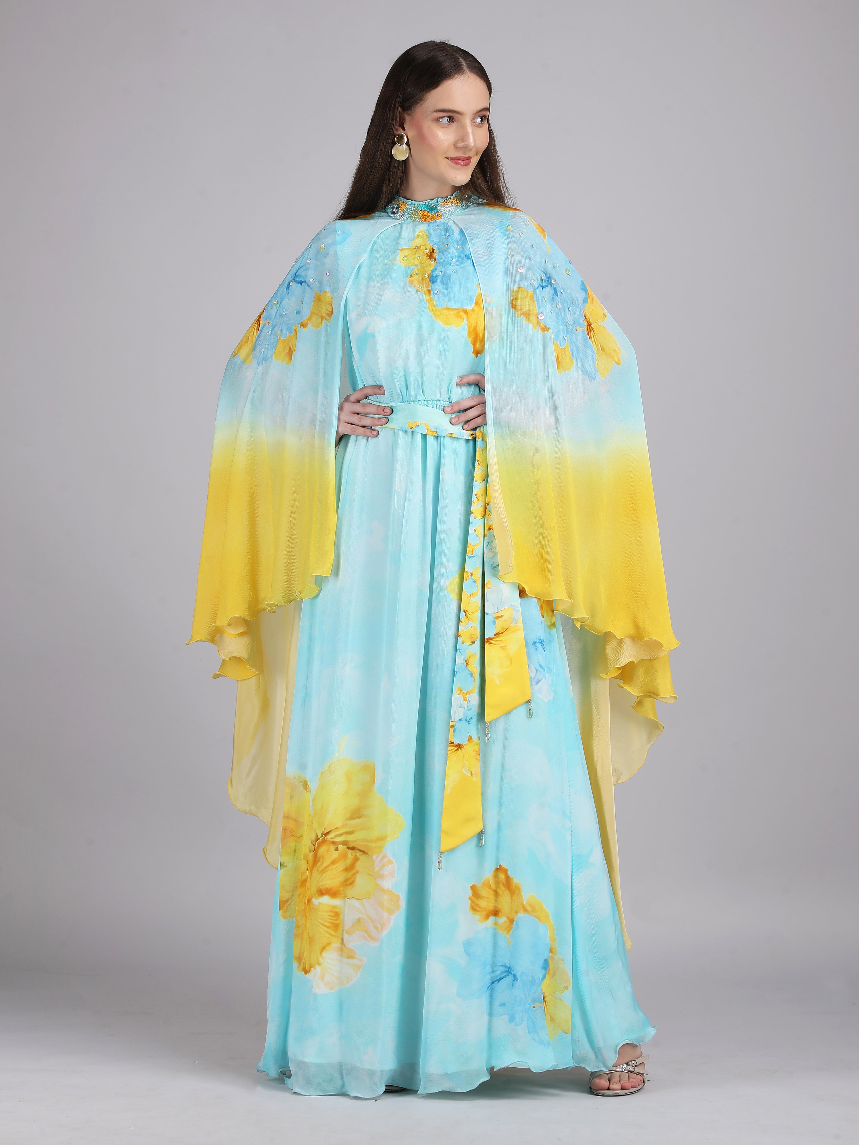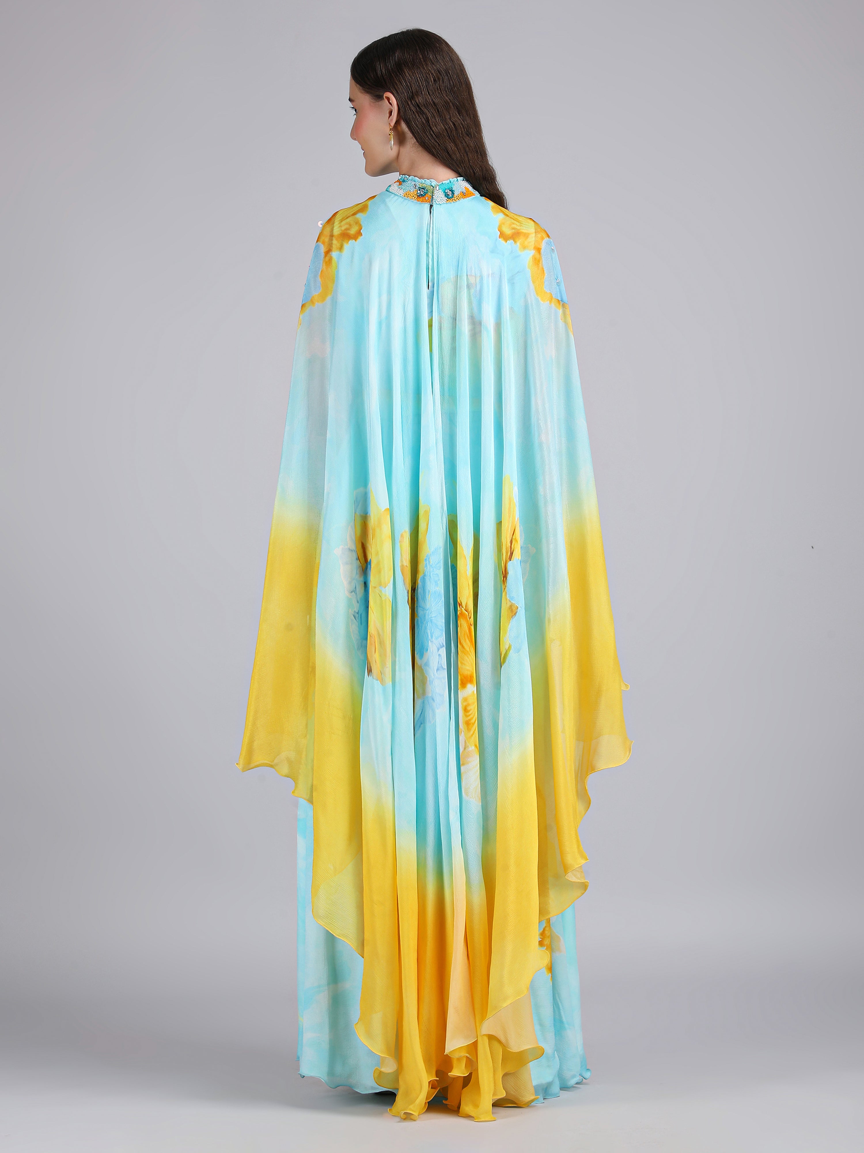 Radiate elegance in this vibrant dress featuring a captivating placement print, embriodery collar and cape sleeves. Perfect for breezy beach escapes.