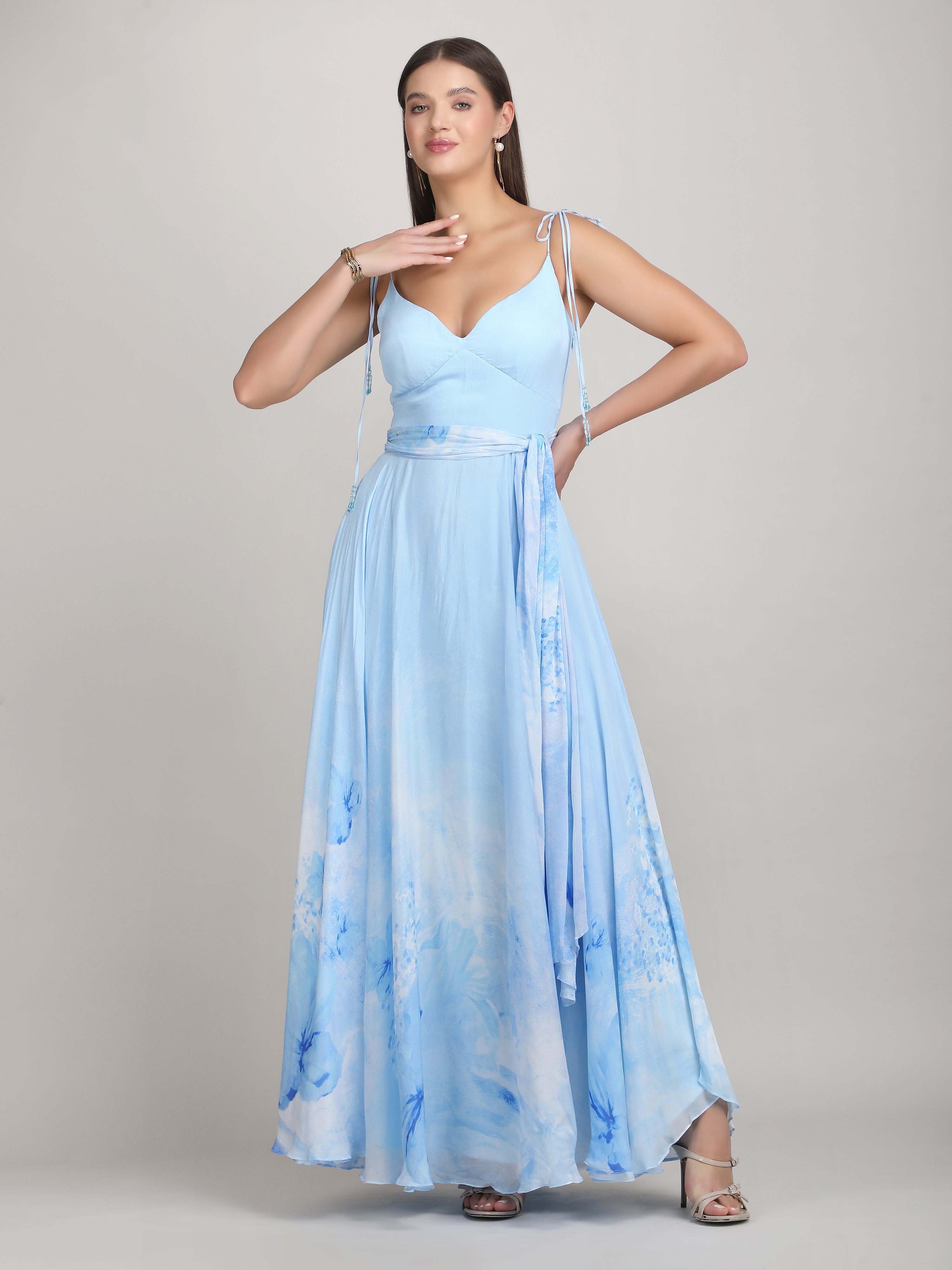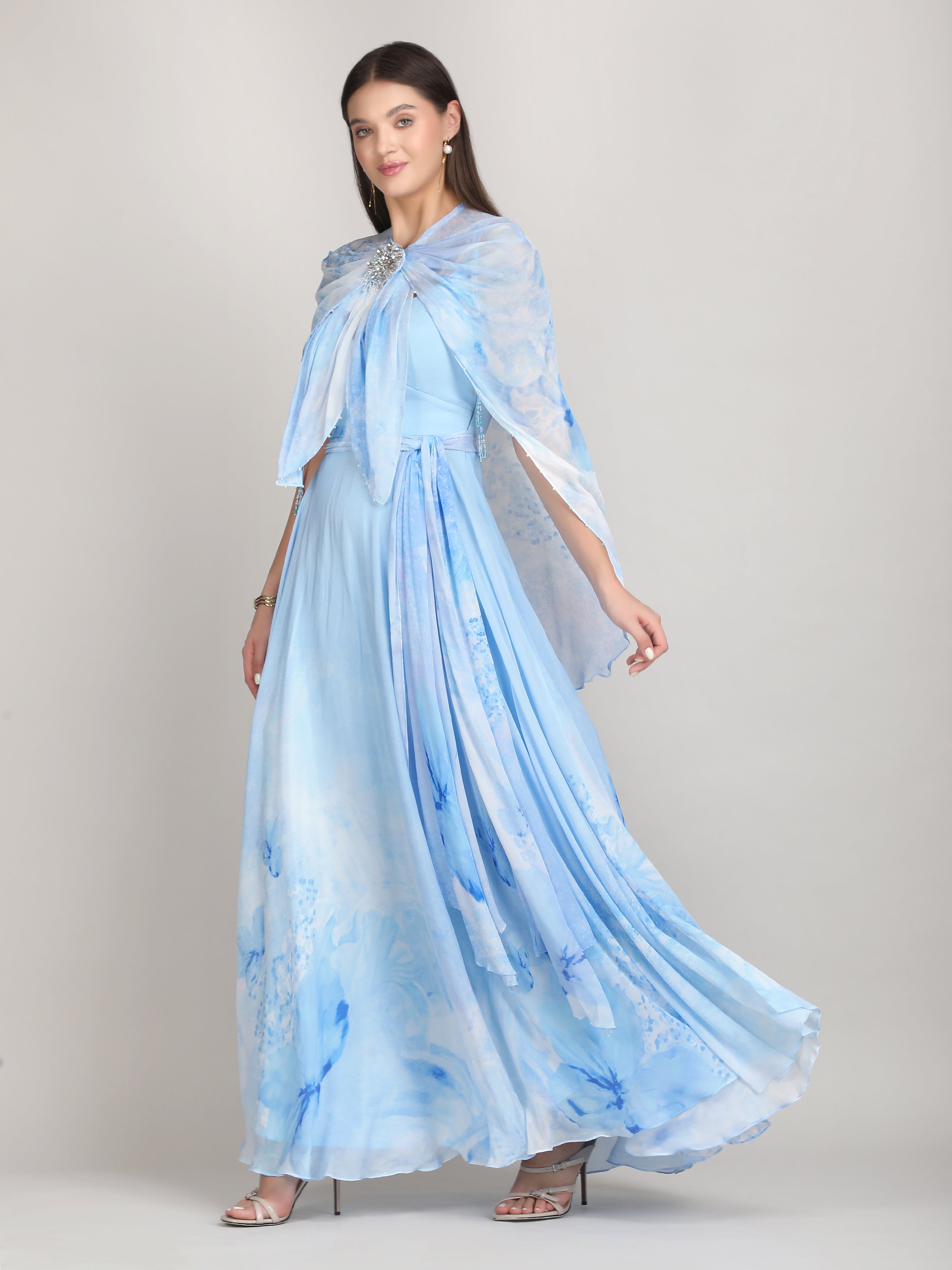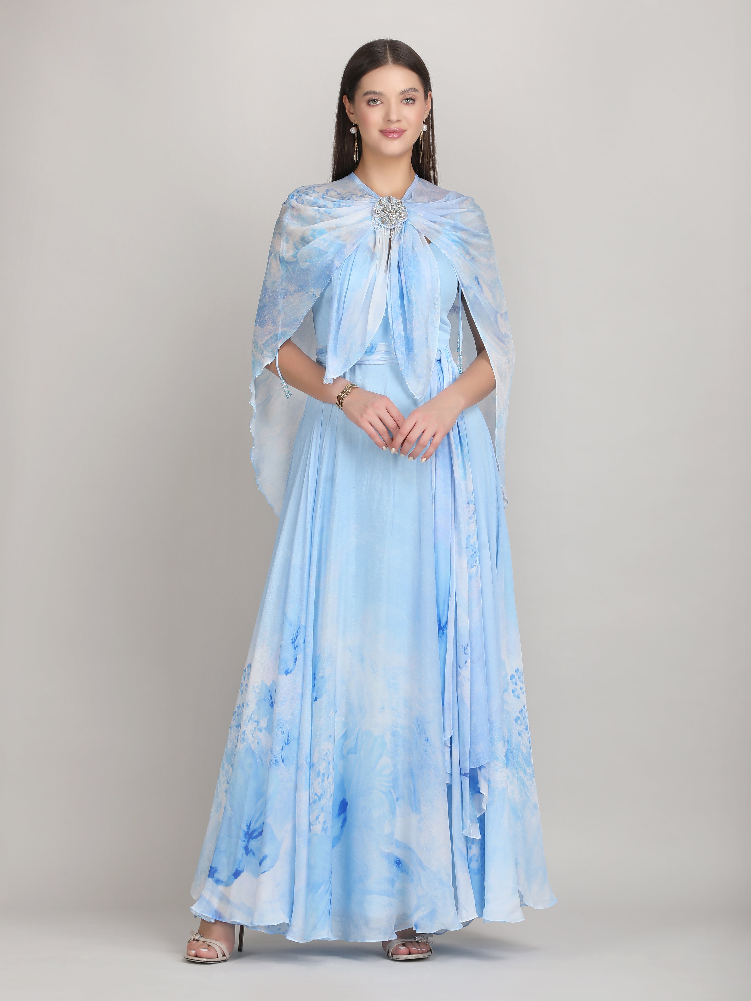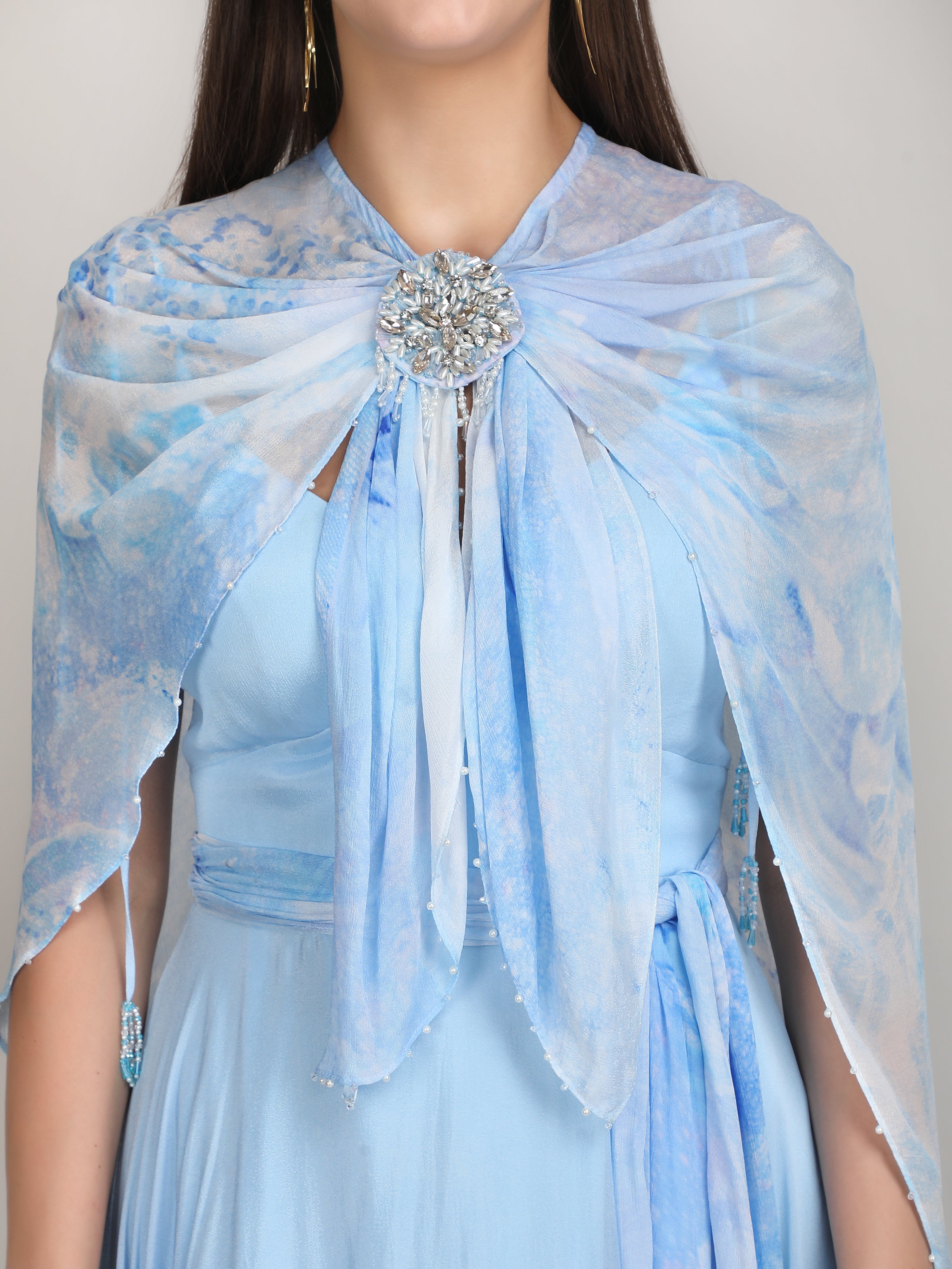 Gracefully ethereal, the Aurora Tone Ice Blue Cape Dress features an embroidered brooch and a detachable cape for versatile elegance. Fluid lines and delicate detailing make it a statement piece for elevated evening or resort occasions.