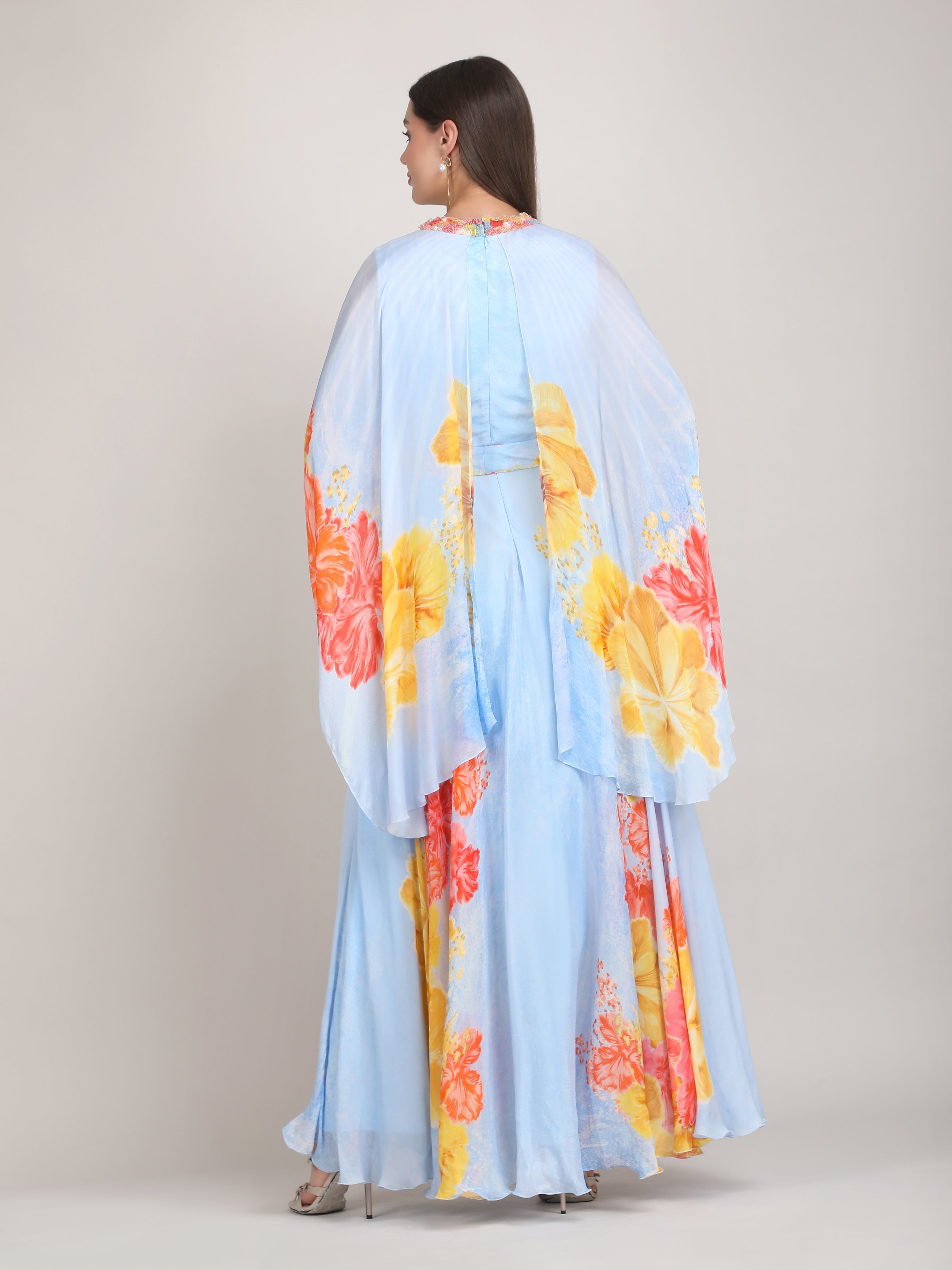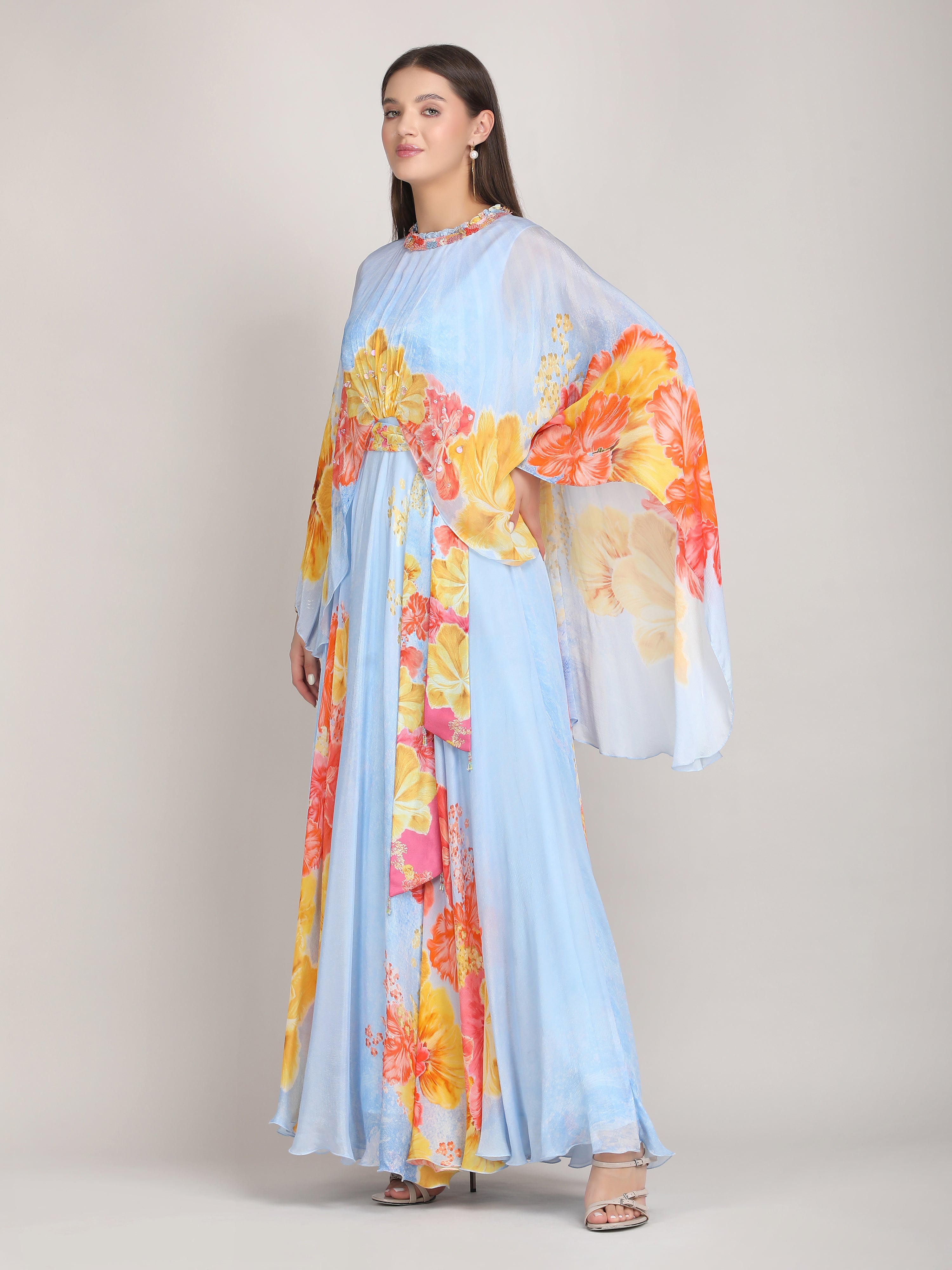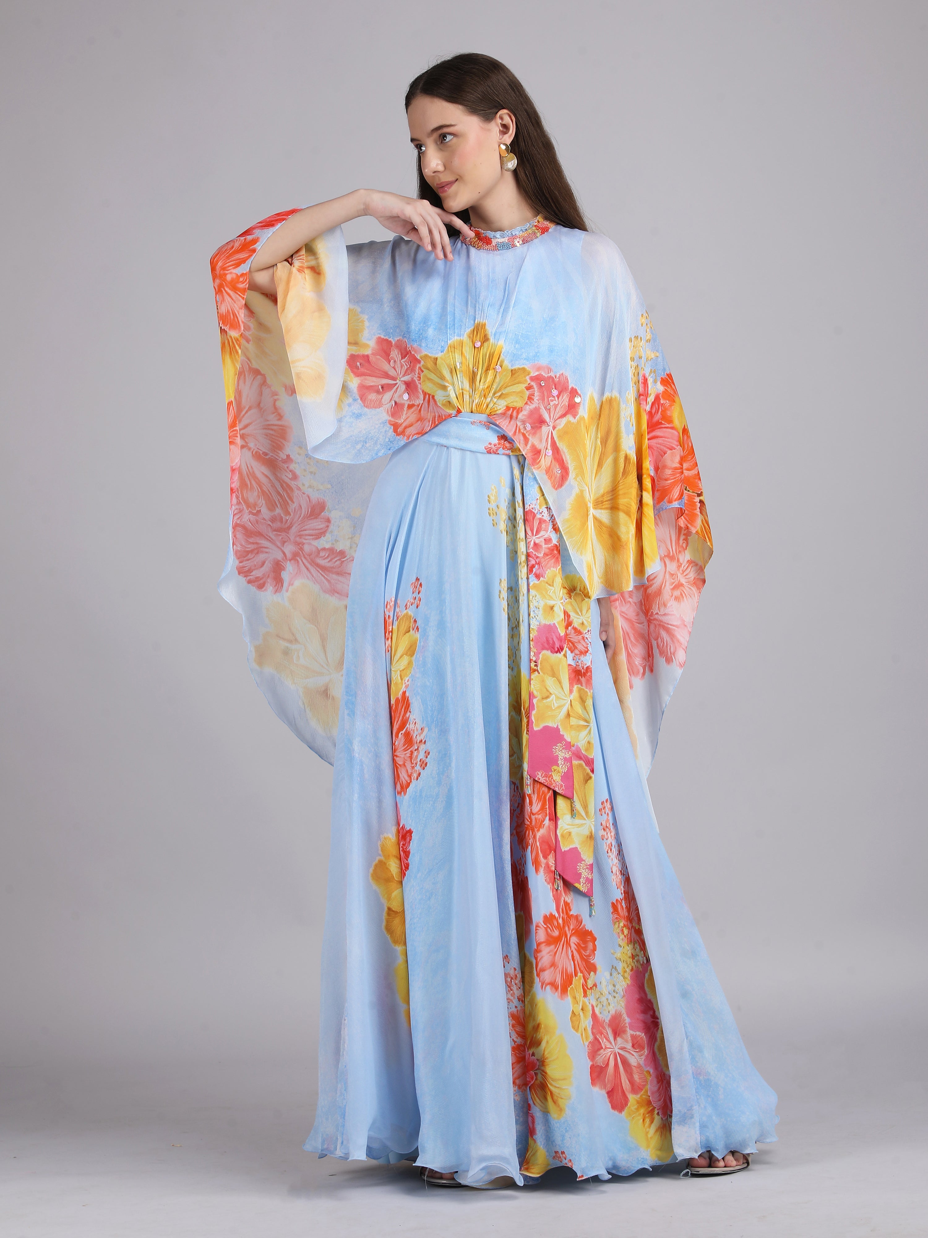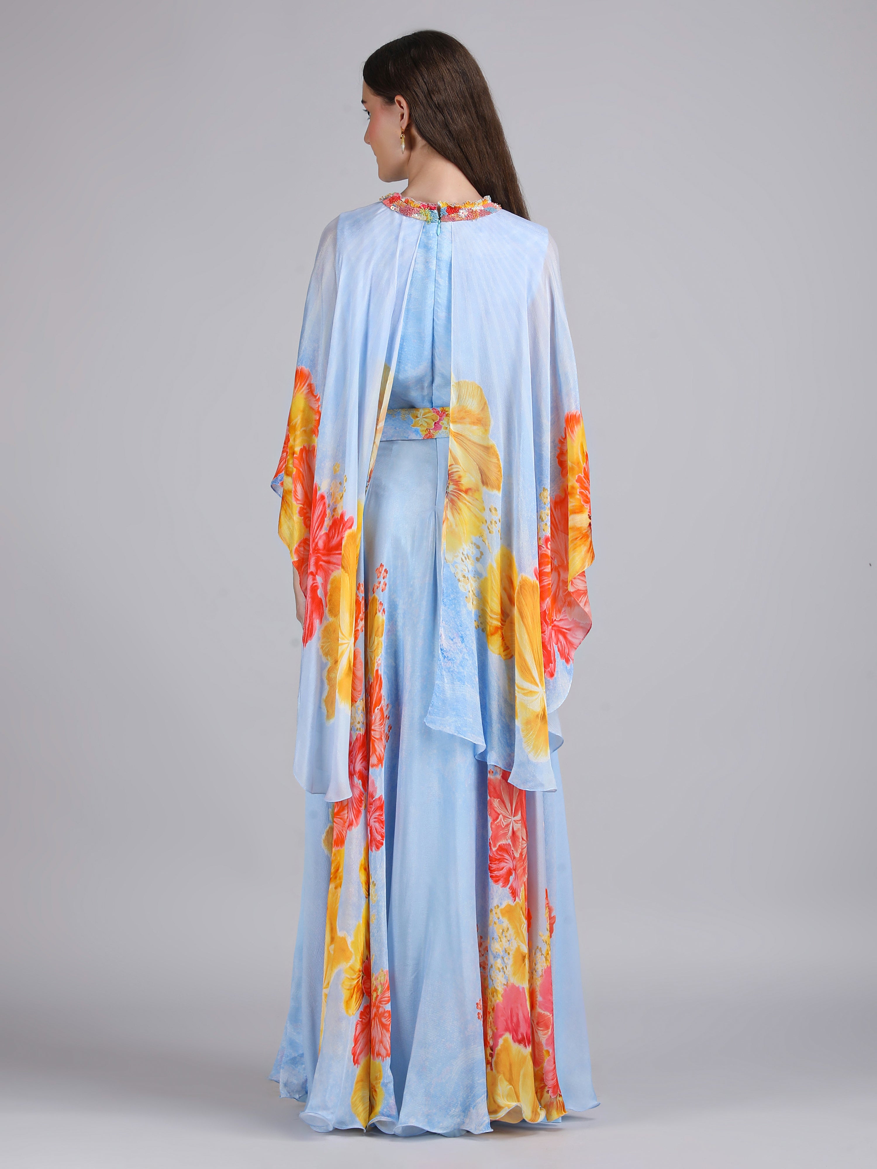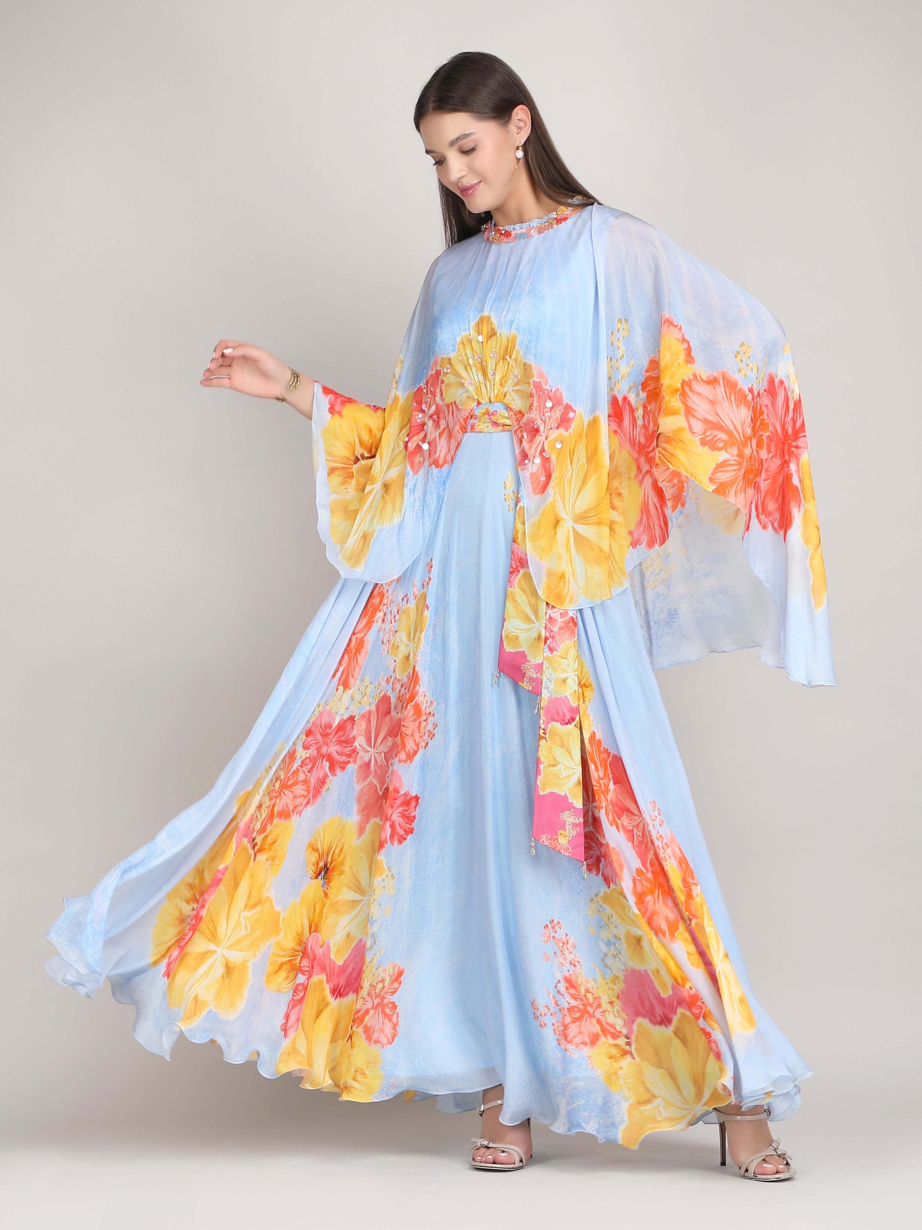 Stand out in this Faux Cosmos Sky base printed cape dress, elevated with intricate embroidery detailing for a refined, statement-making silhouette.