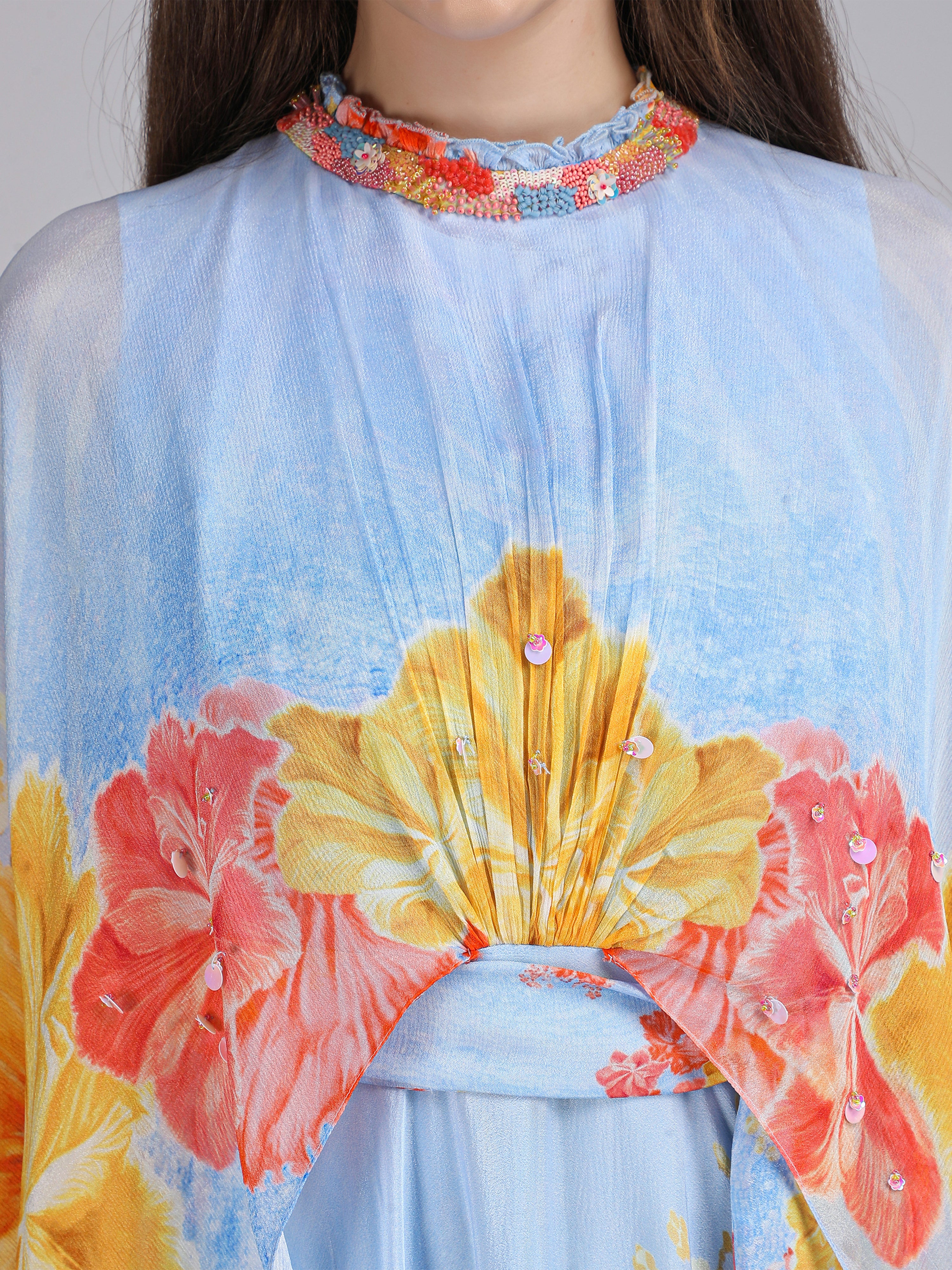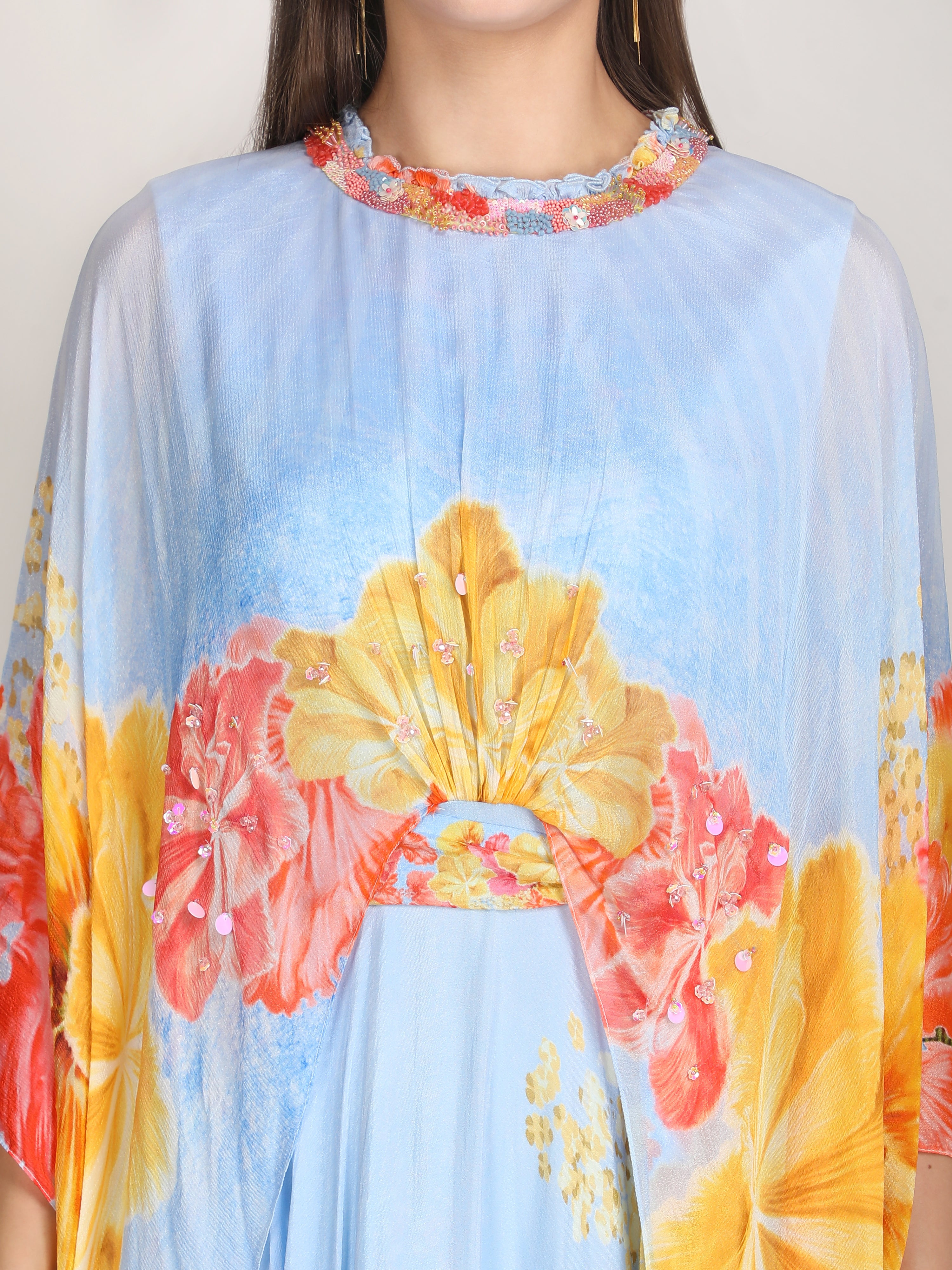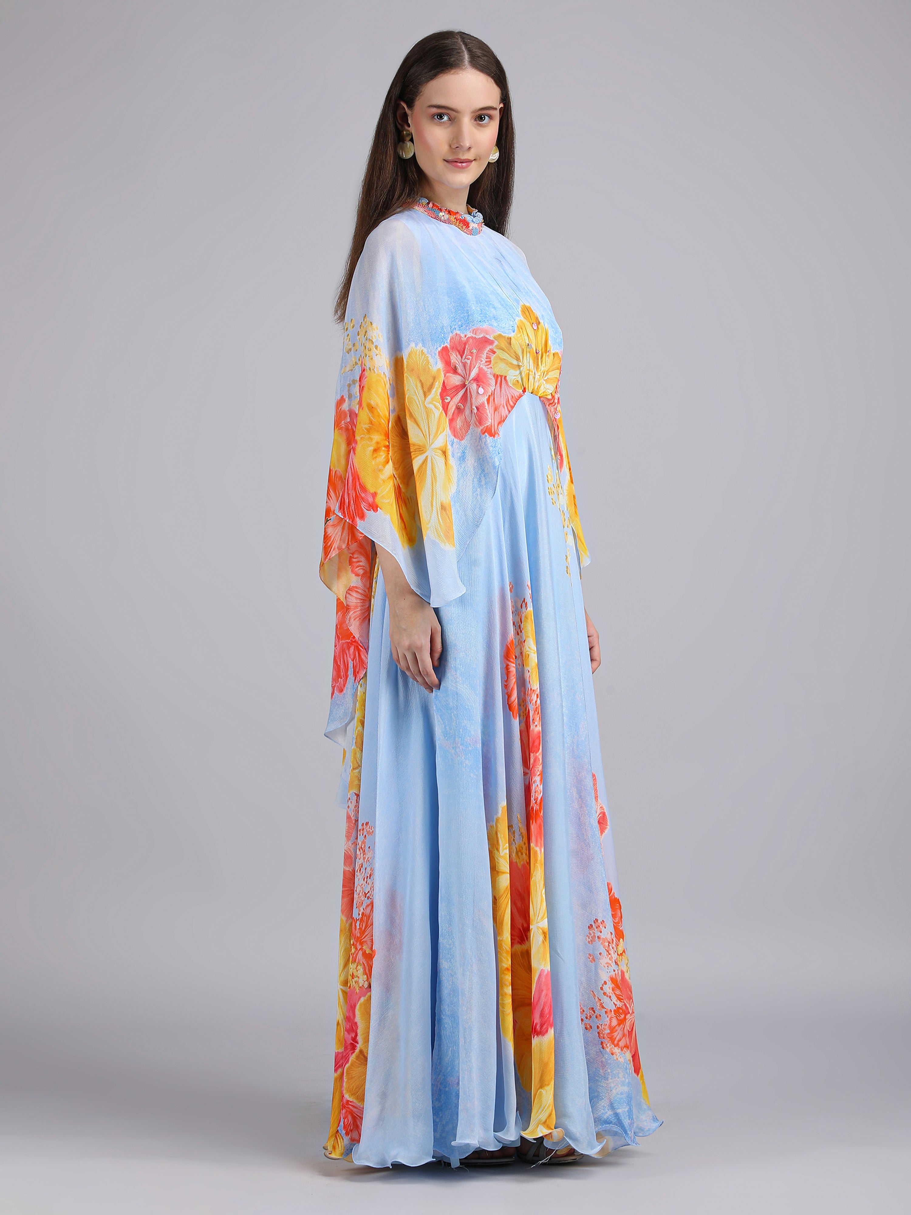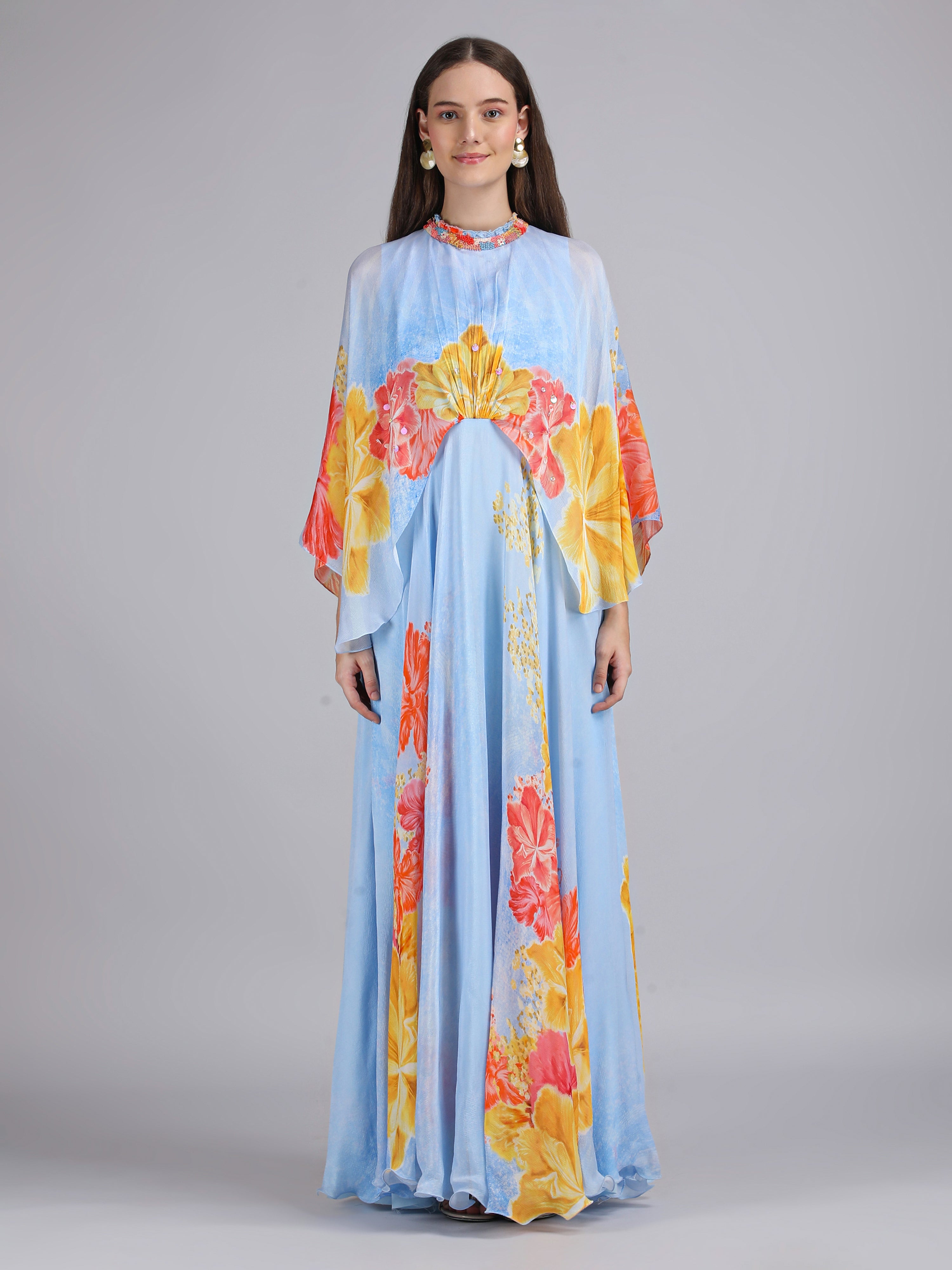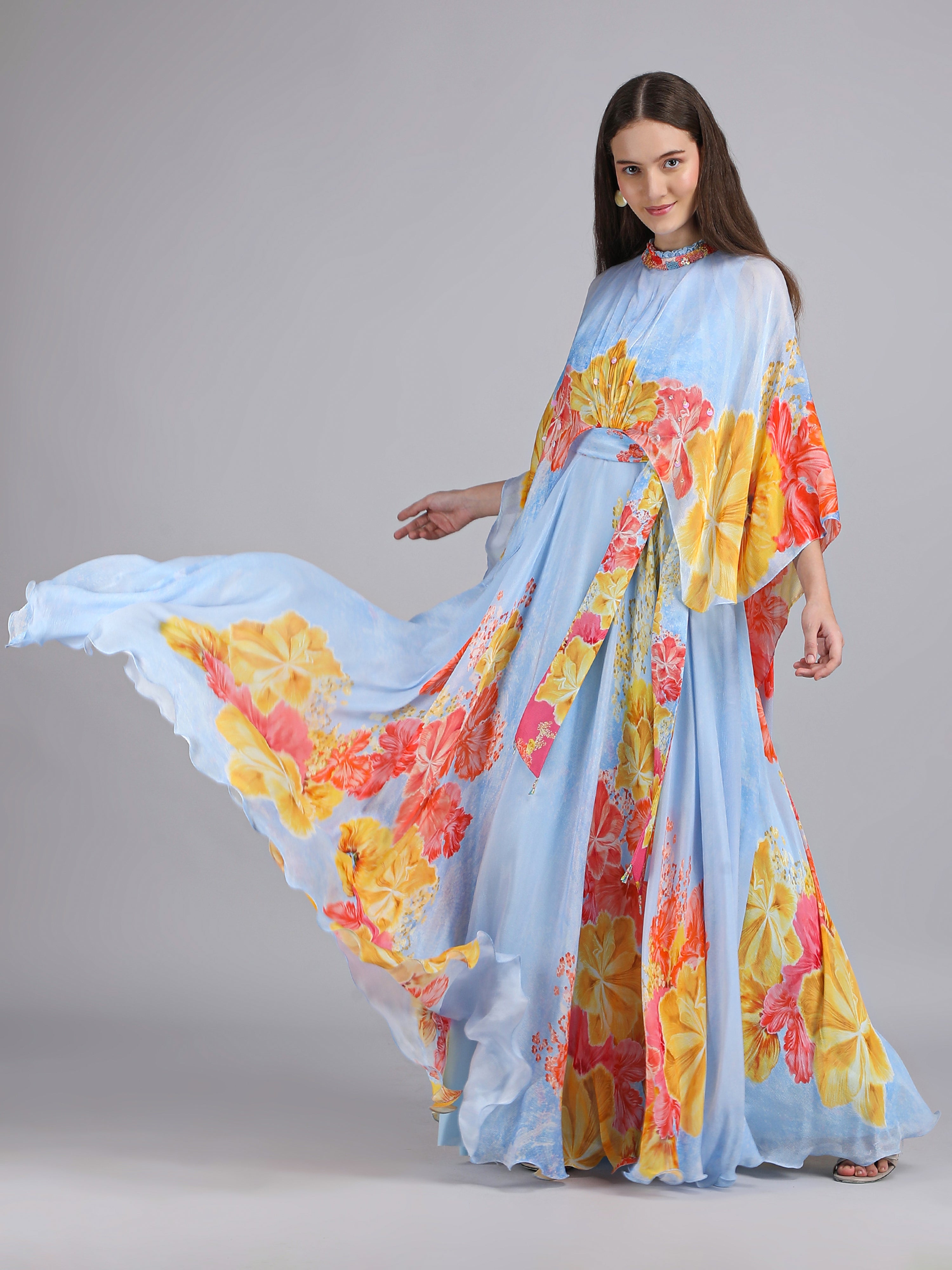Stand out in this Faux Cosmos Sky base printed cape dress, elevated with intricate embroidery detailing for a refined, statement-making silhouette.