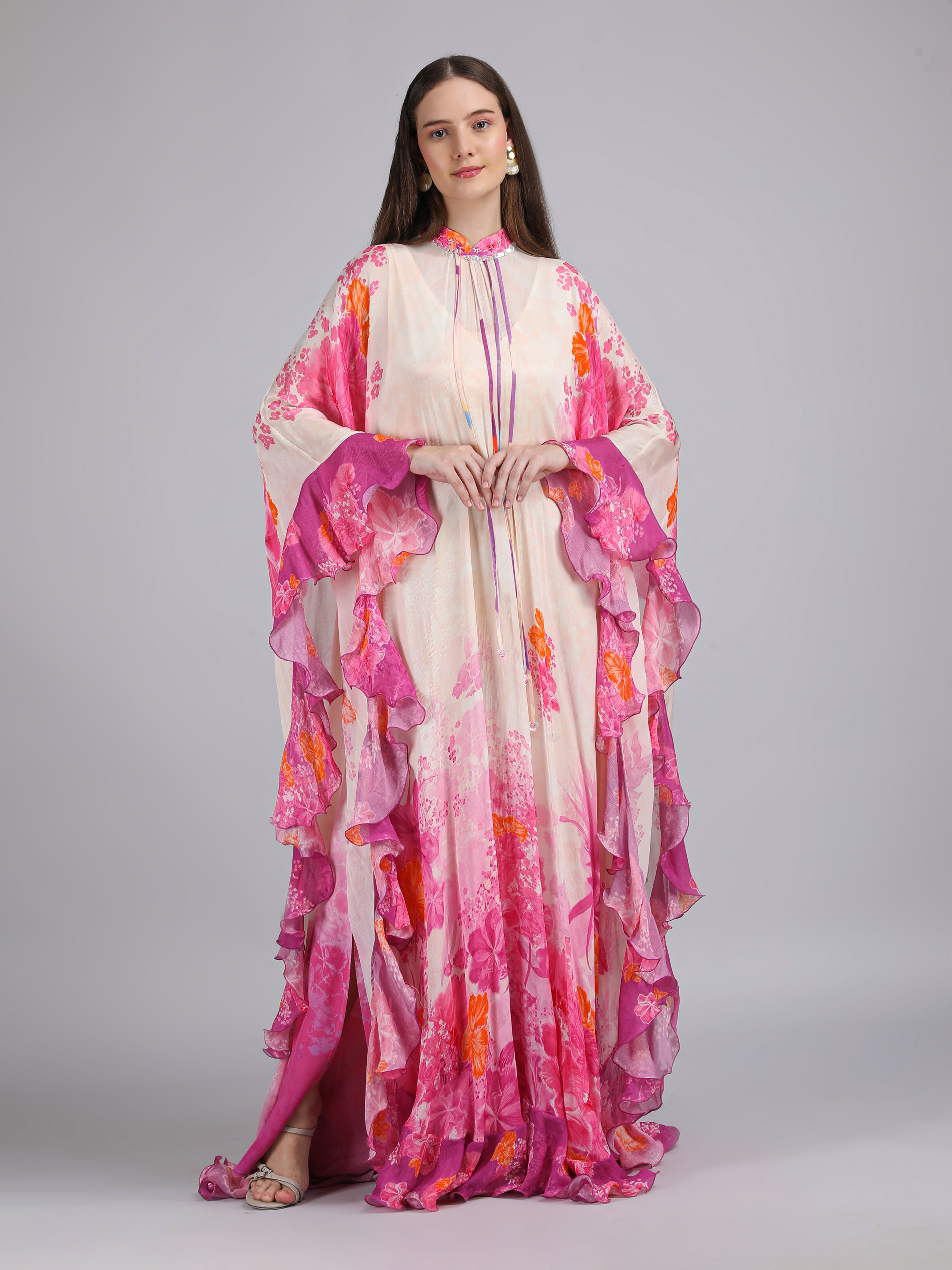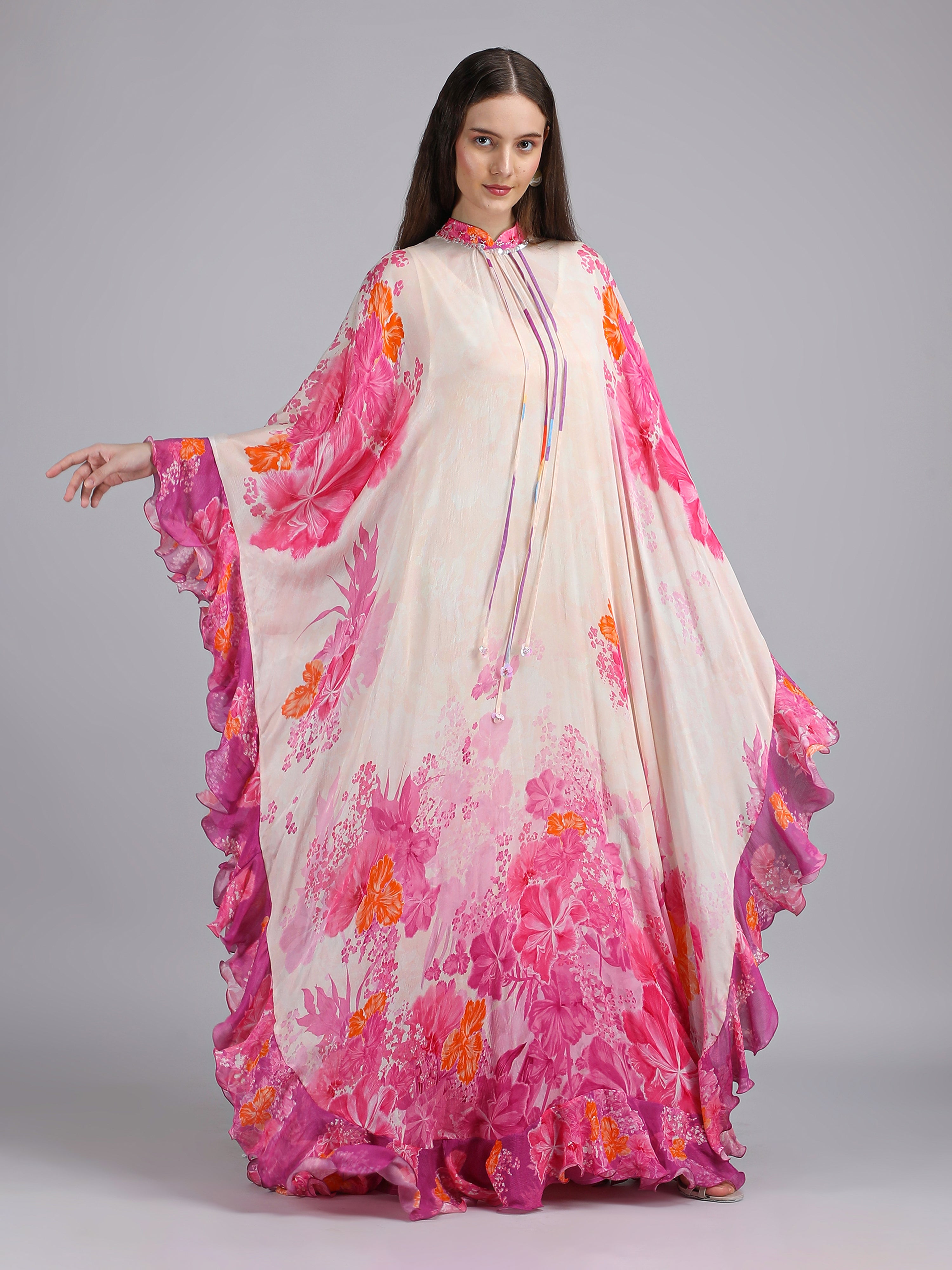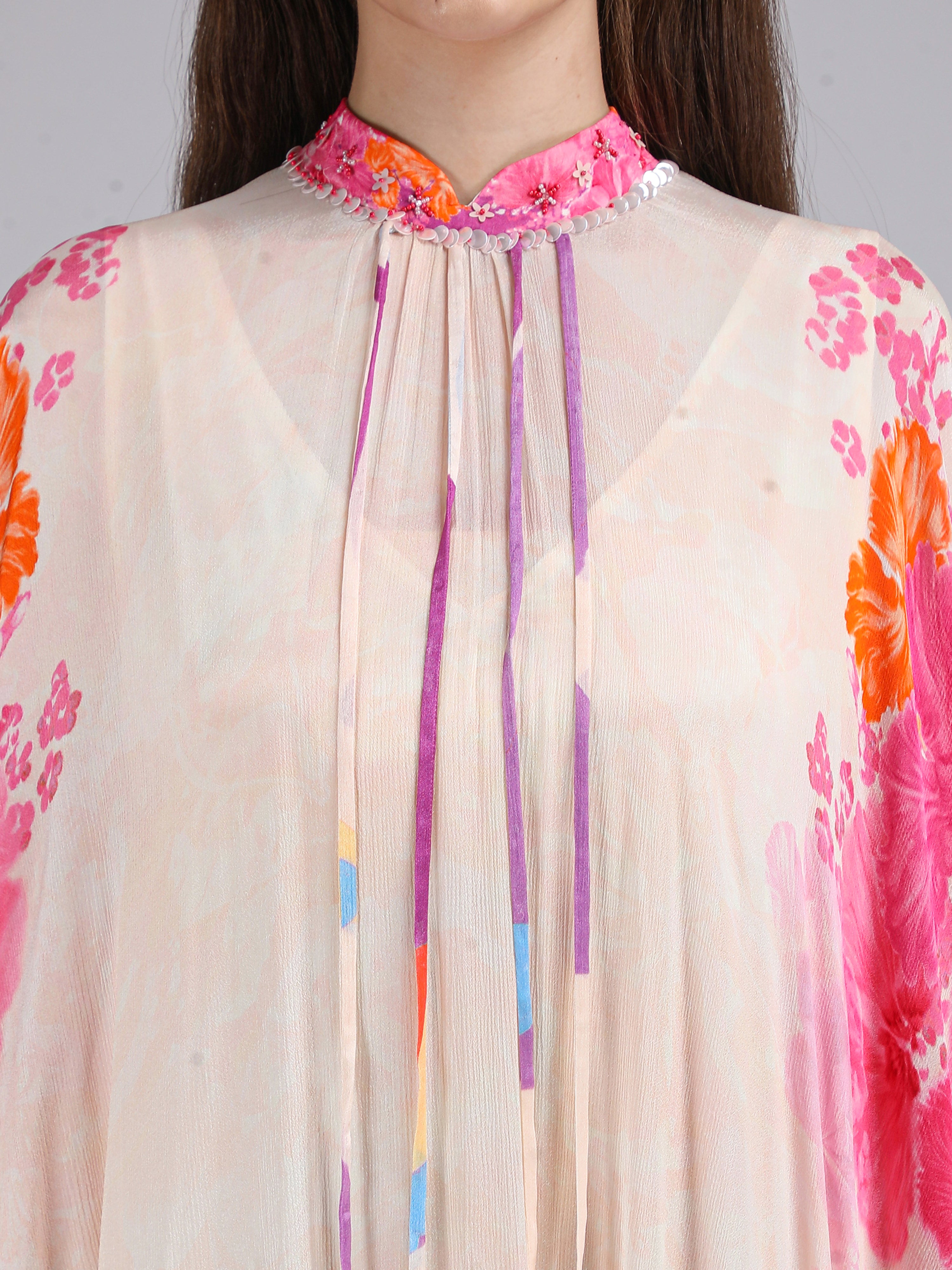 Stand out in this Floral Fantasy placement print kaftan, layered over a printed slip and finished with delicate embroidery on the collar for a refined statement look.