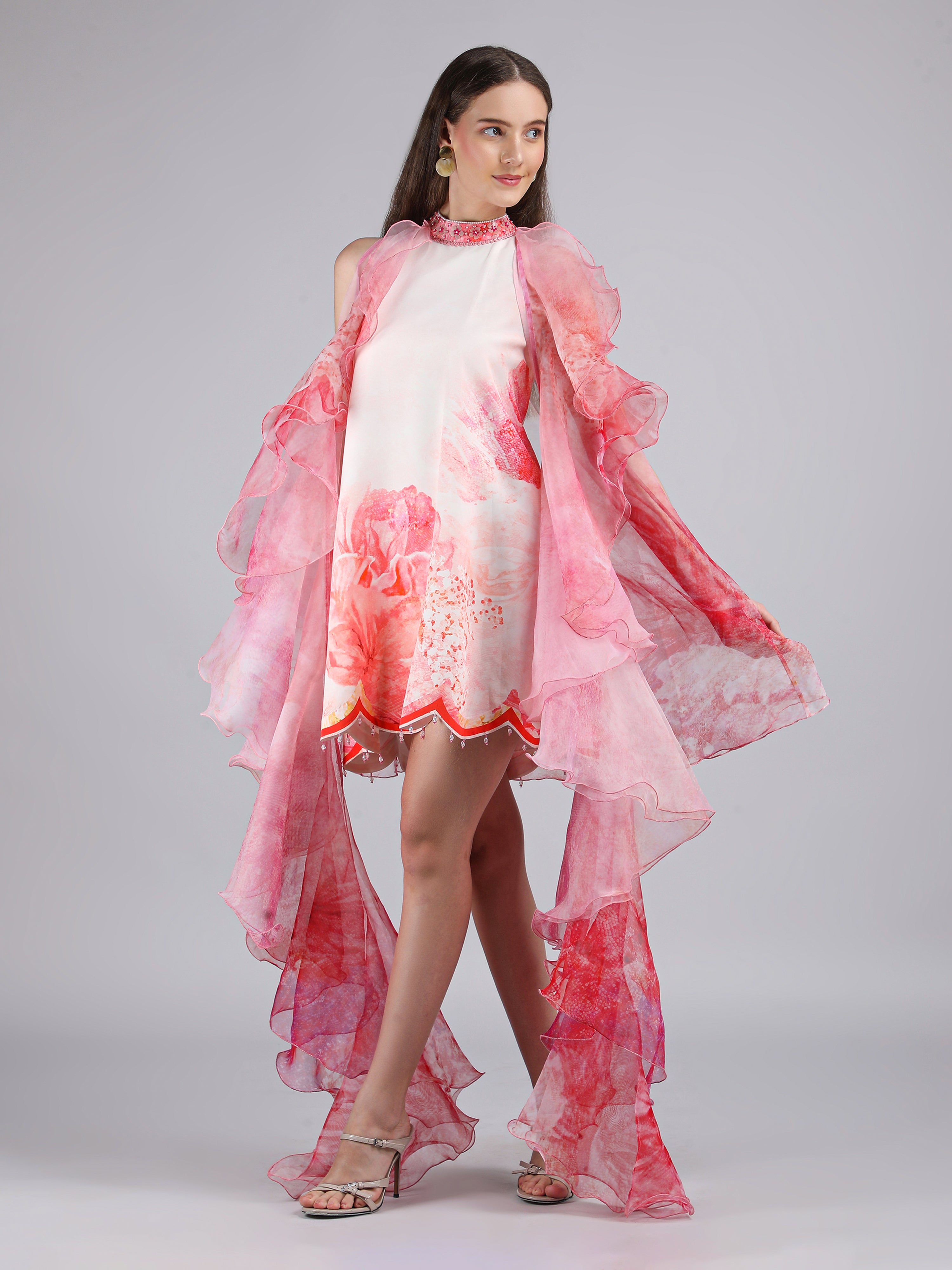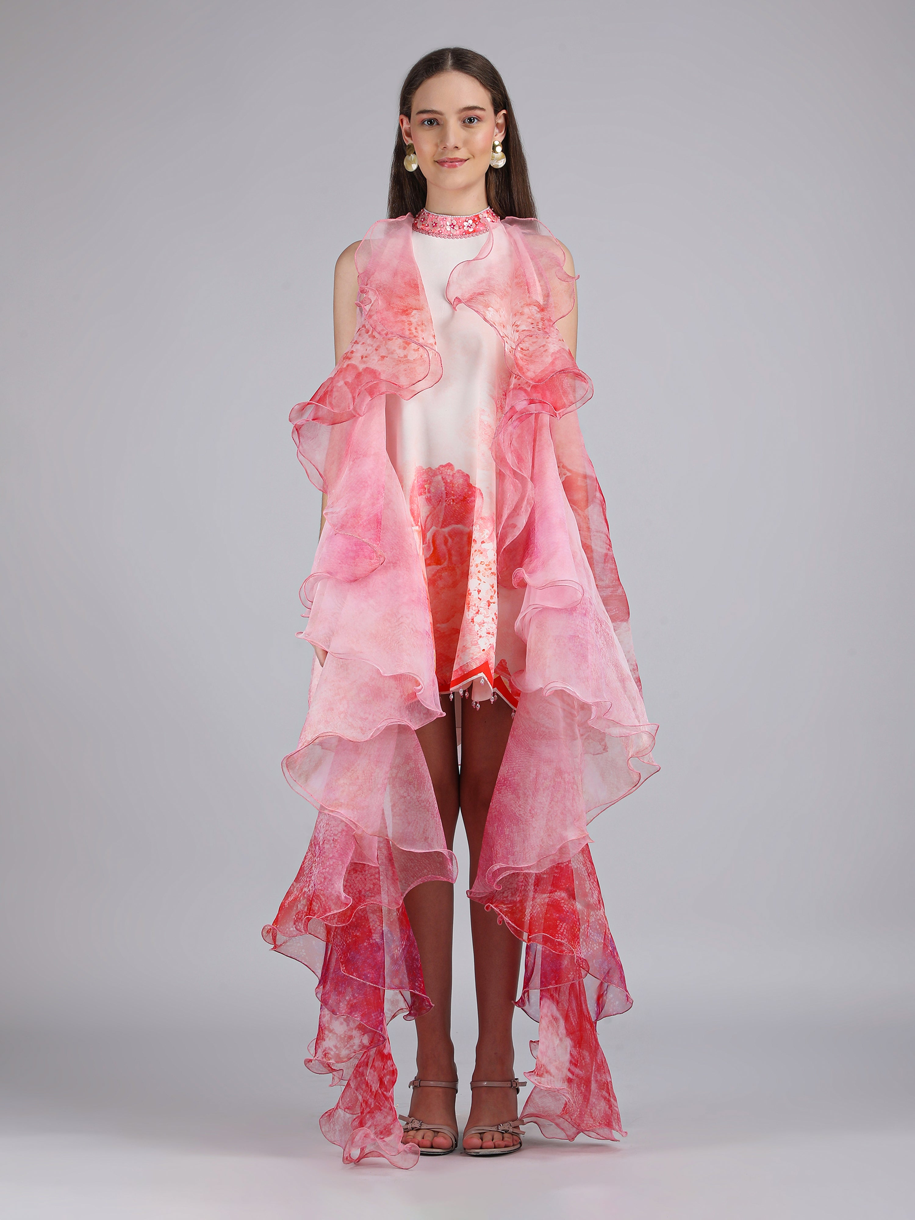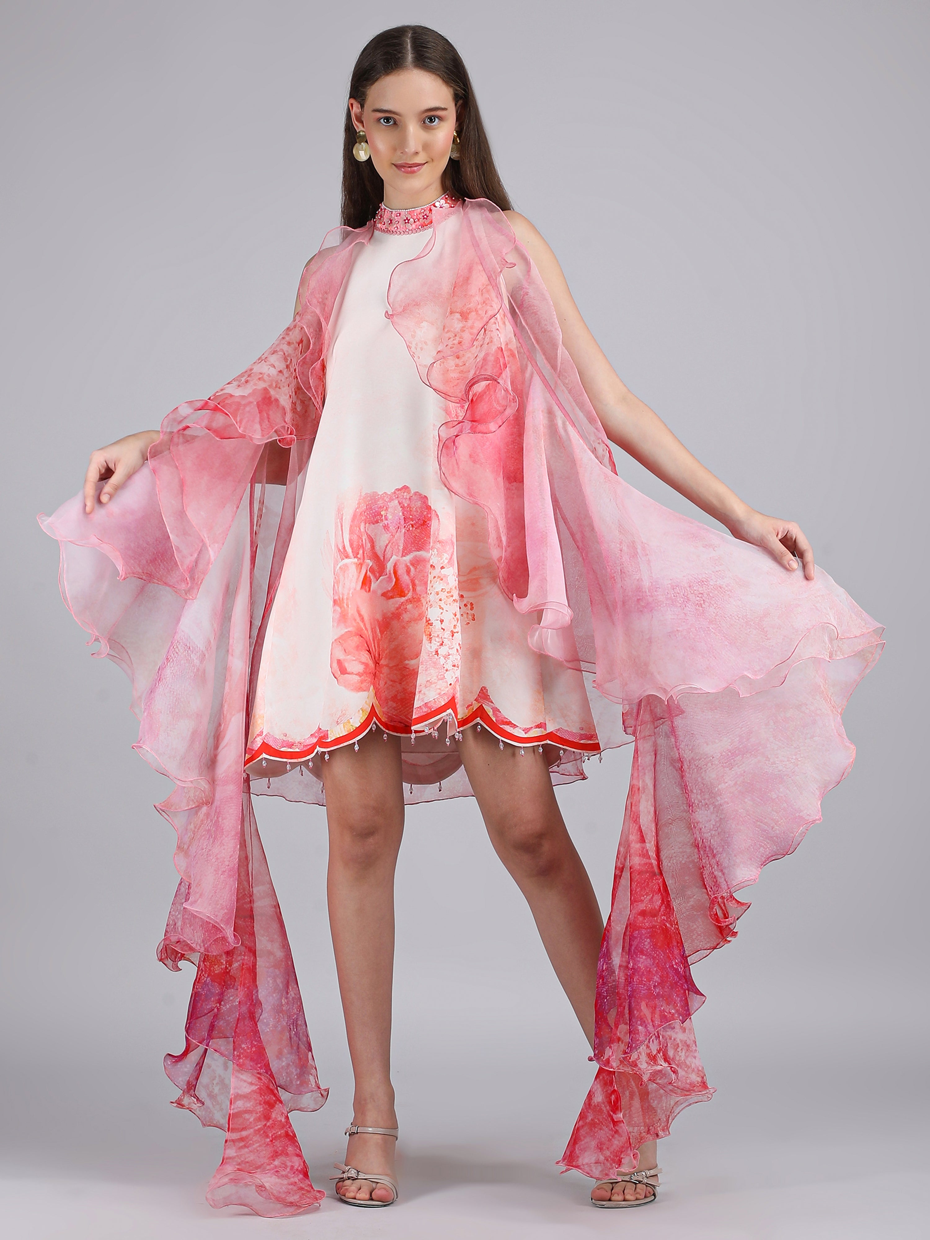Vibrant crepe short printed dress featuring a scalloped hemline, paired with a sheer silk organza frill jacket for an elevated statement look.