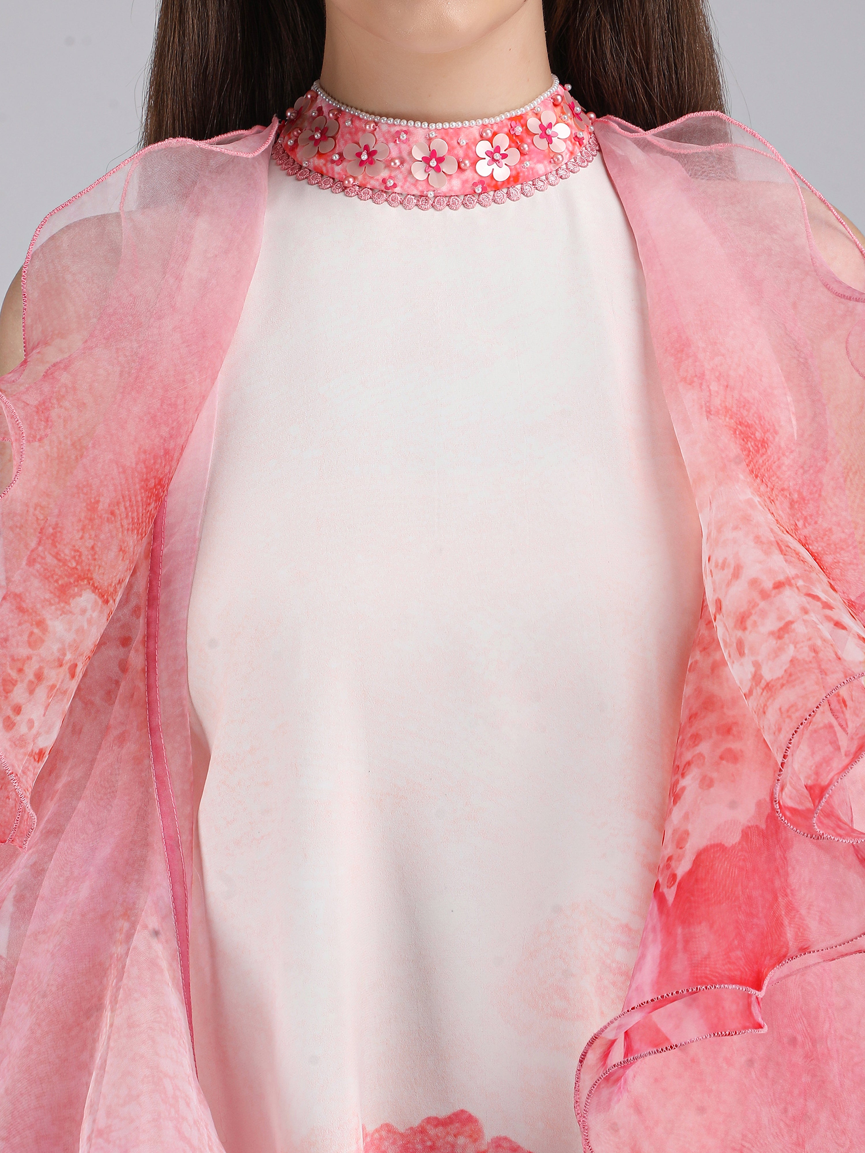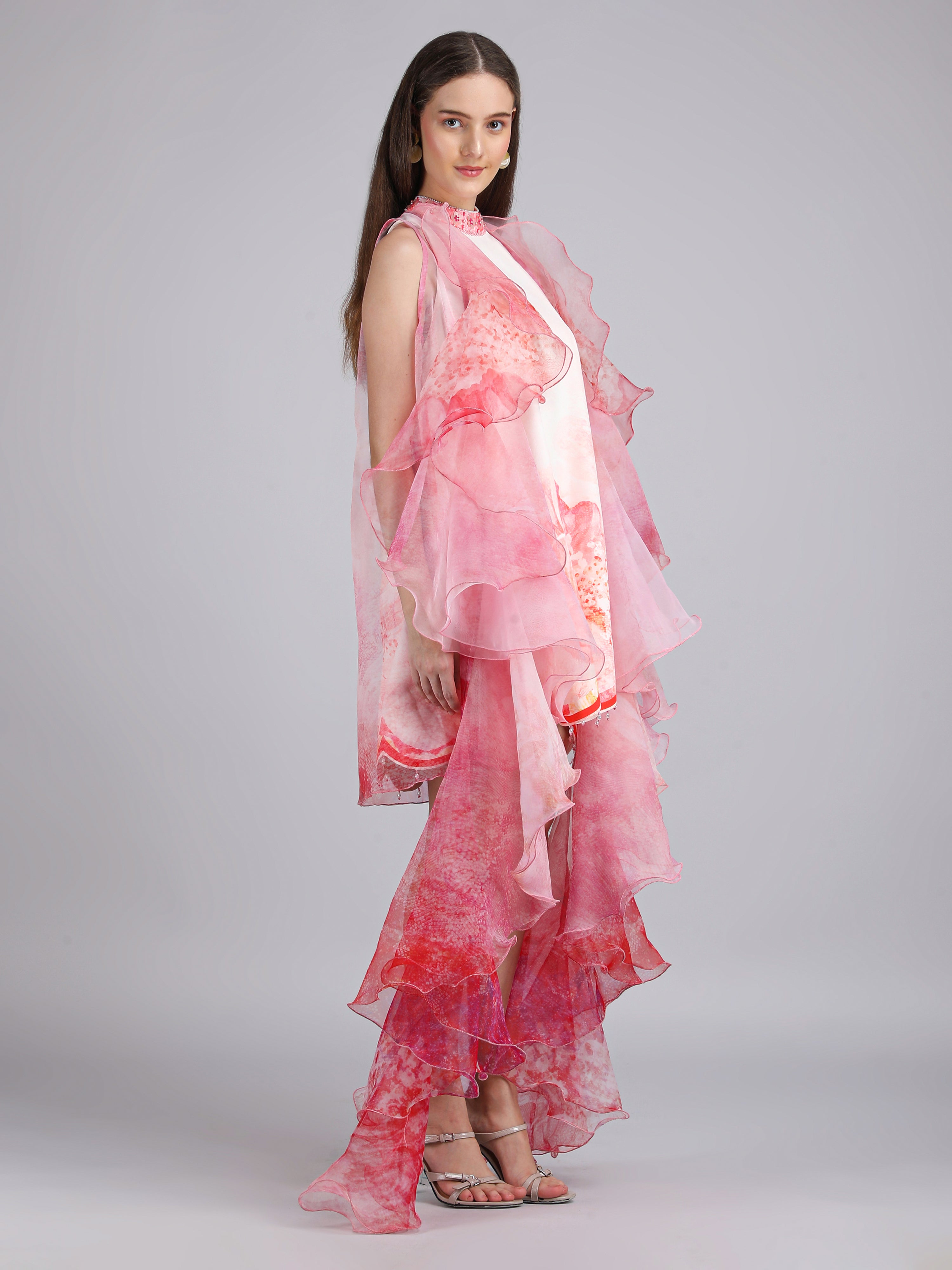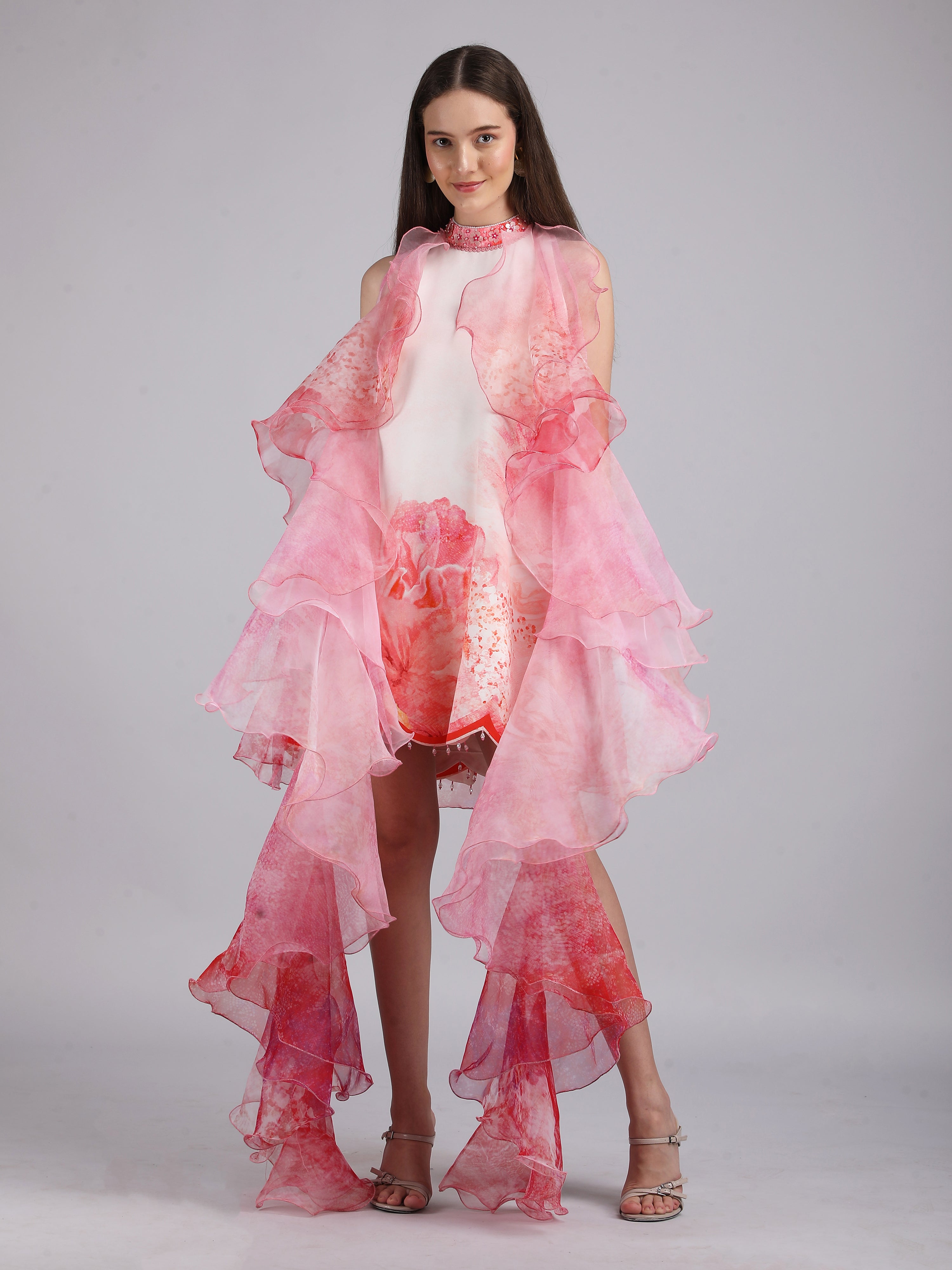 Vibrant crepe short printed dress featuring a scalloped hemline, paired with a sheer silk organza frill jacket for an elevated statement look.