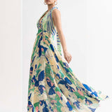Chiffon mystic green placement printed dress with halter neck tie-up turning into an open back, gathered at the waist with loop detail.