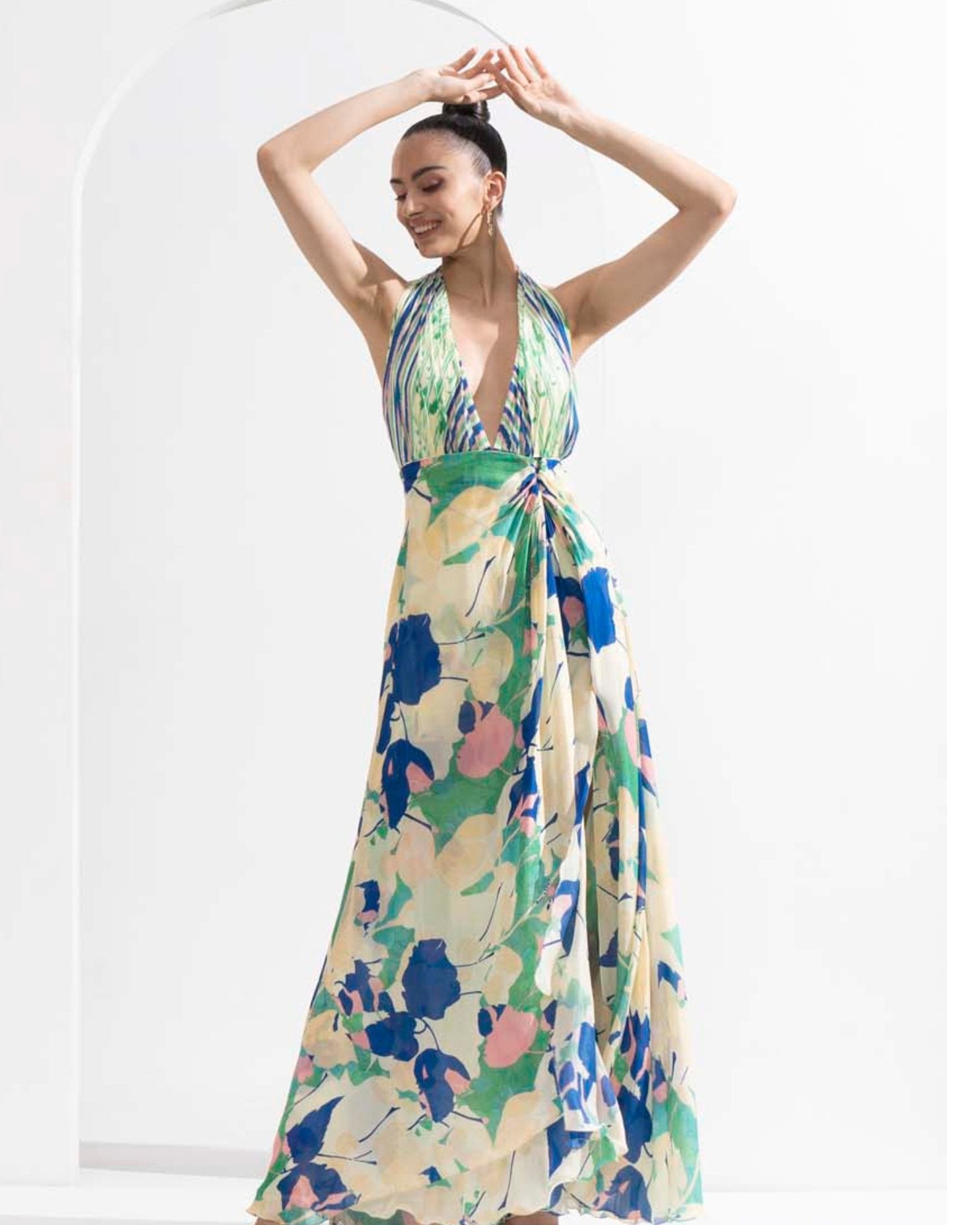Mystic green chiffon placement printed draped halter neck dress with a silver accessory.