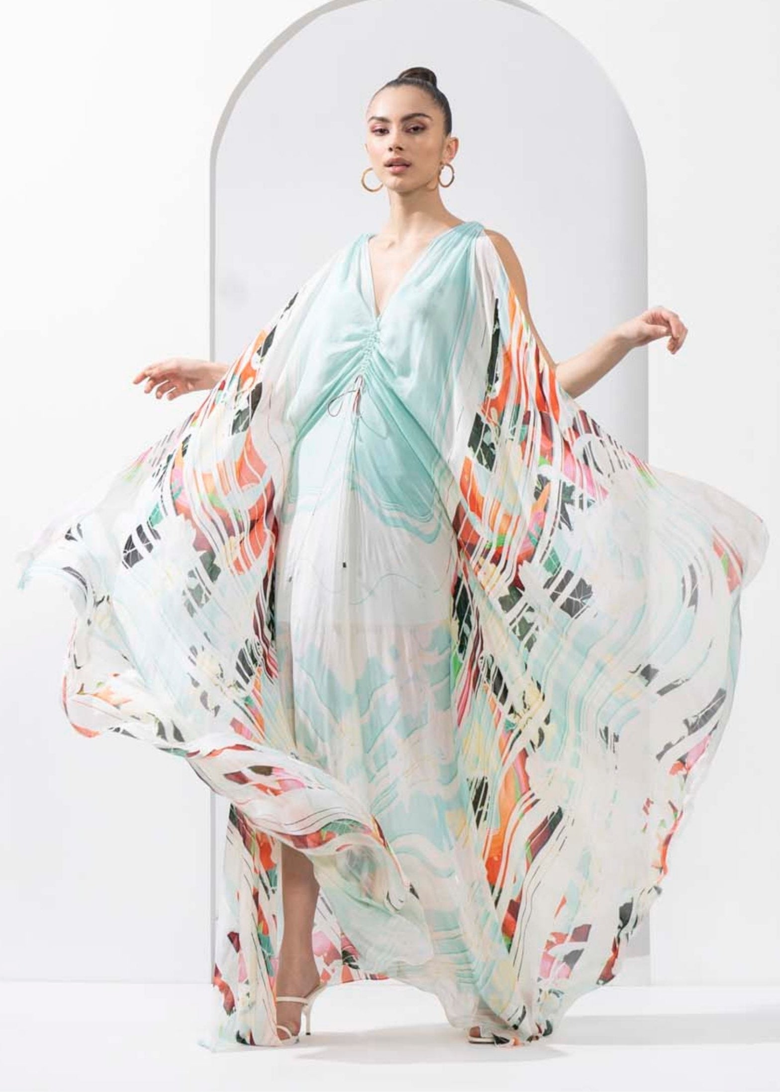 This chiffon kaftan showcases a mesmerizing placement print reminiscent of the ocean's depths. The intricate details come together to create a visual symphony that celebrates nature's beauty. With its A-line hem and ruched detailing, this kaftan effortlessly combines comfort and style.