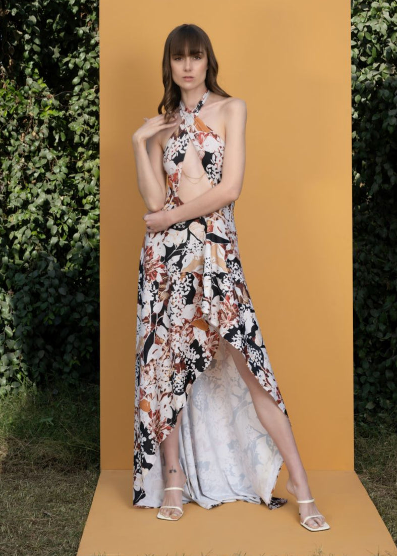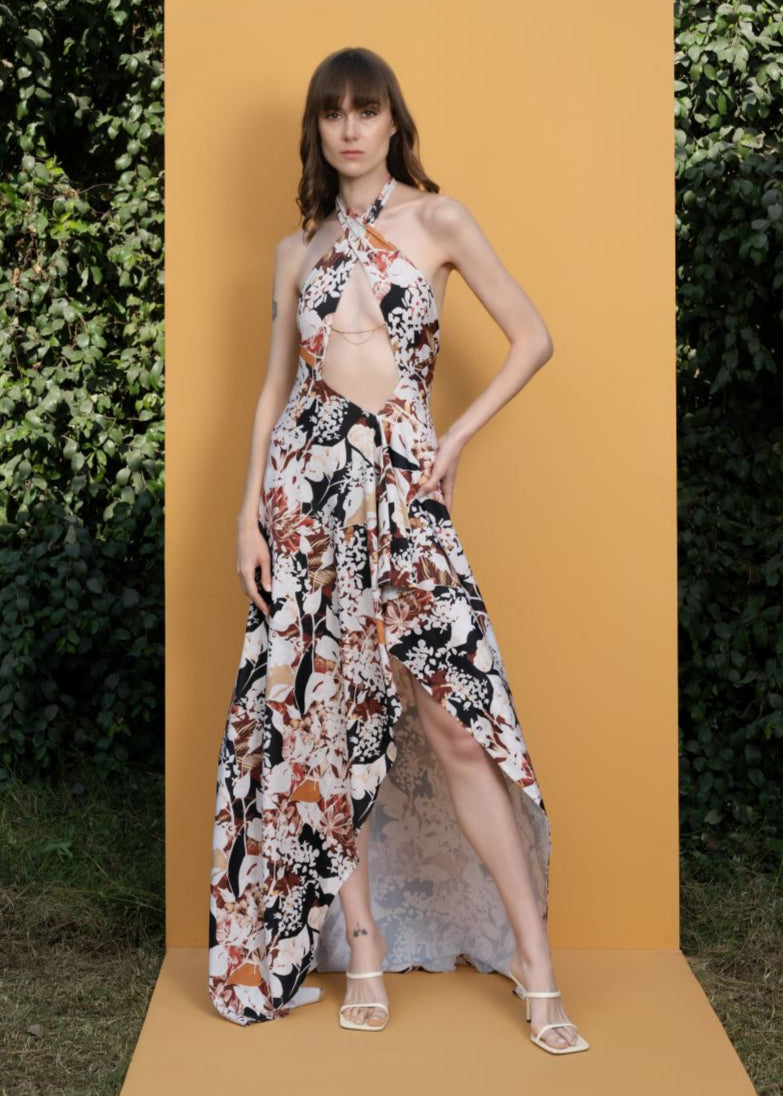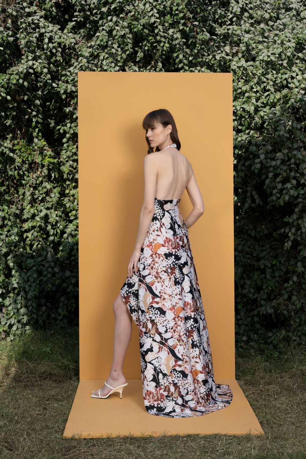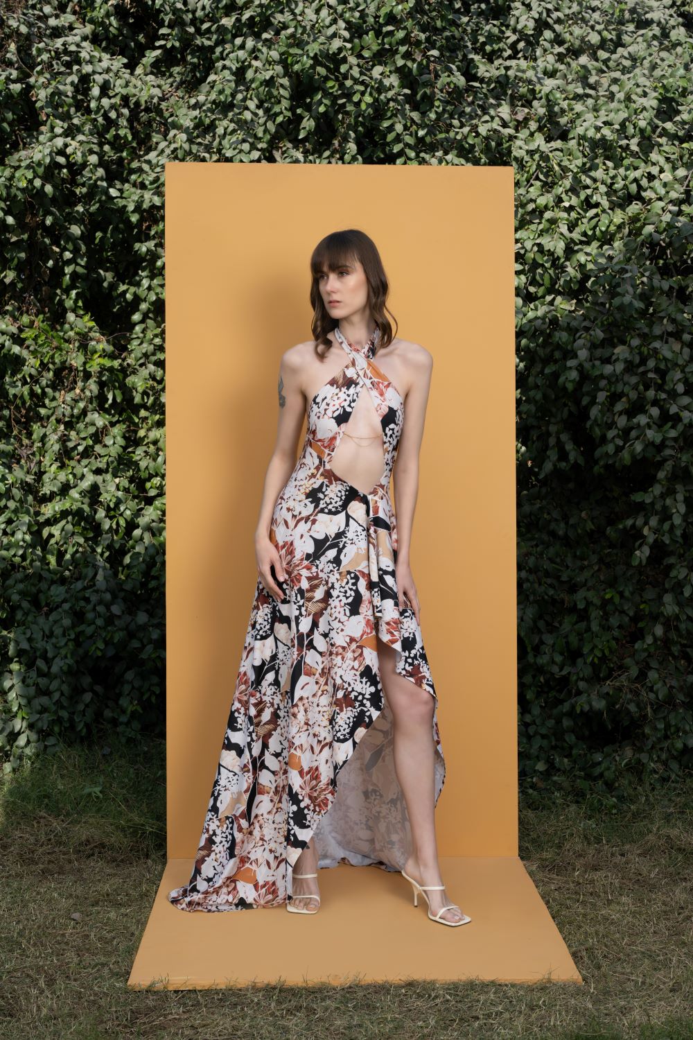 Make a bold statement with Mandira Wirk's Black Rose Printed Spandex Dress with Ball Chain Detail. Crafted from luxurious Spandex fabric and adorned with a captivating rose print in multi black, this dress is a true celebration of style and elegance.