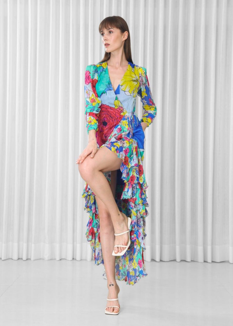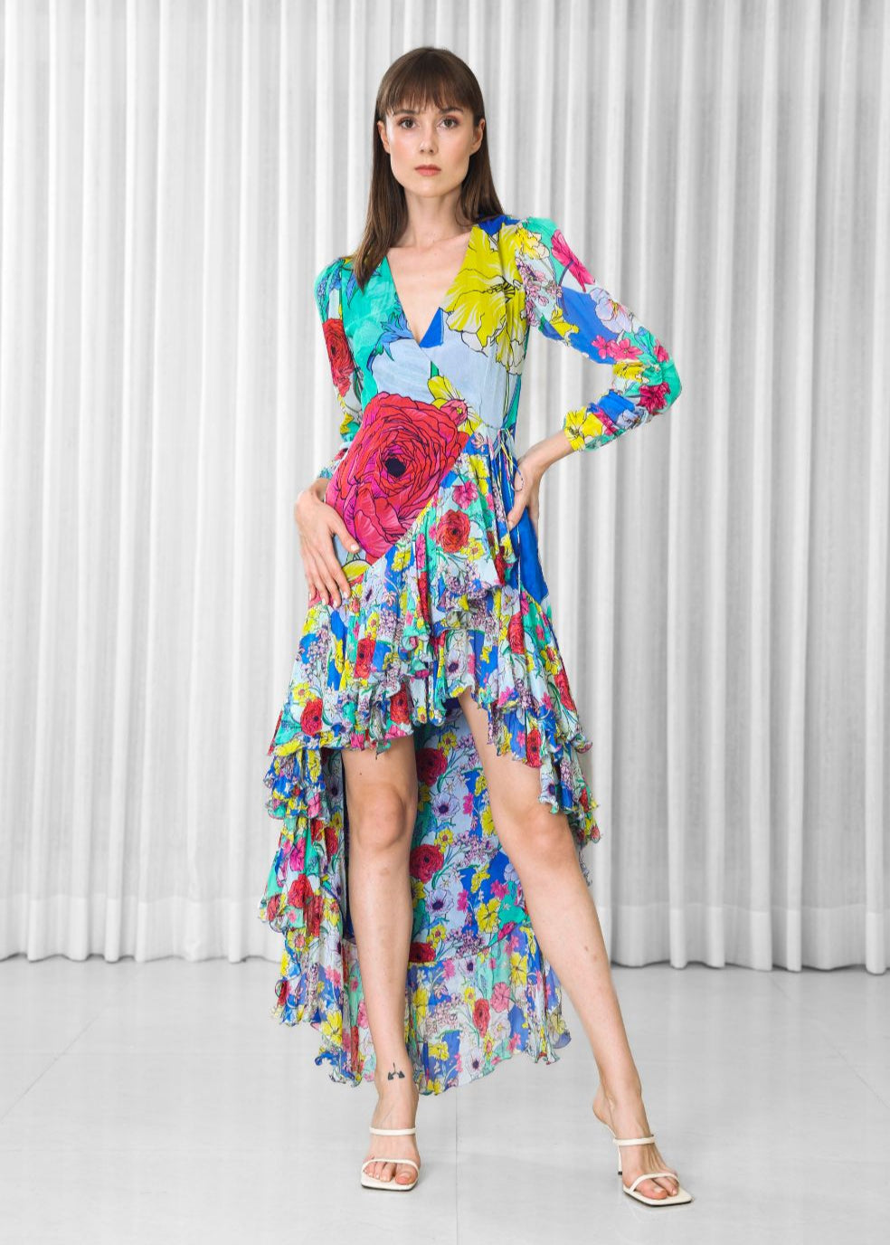 STYLING: Channel a playful and feminine vibe with the Hibiscus Placement Printed Ruffled Dress, an ideal choice for achieving a fresh and charming look suitable for various occasions.
