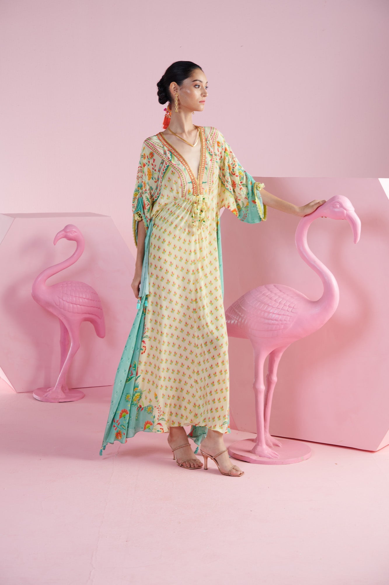 Lemon Glow Iznik Print Kaftan with Jade Accents