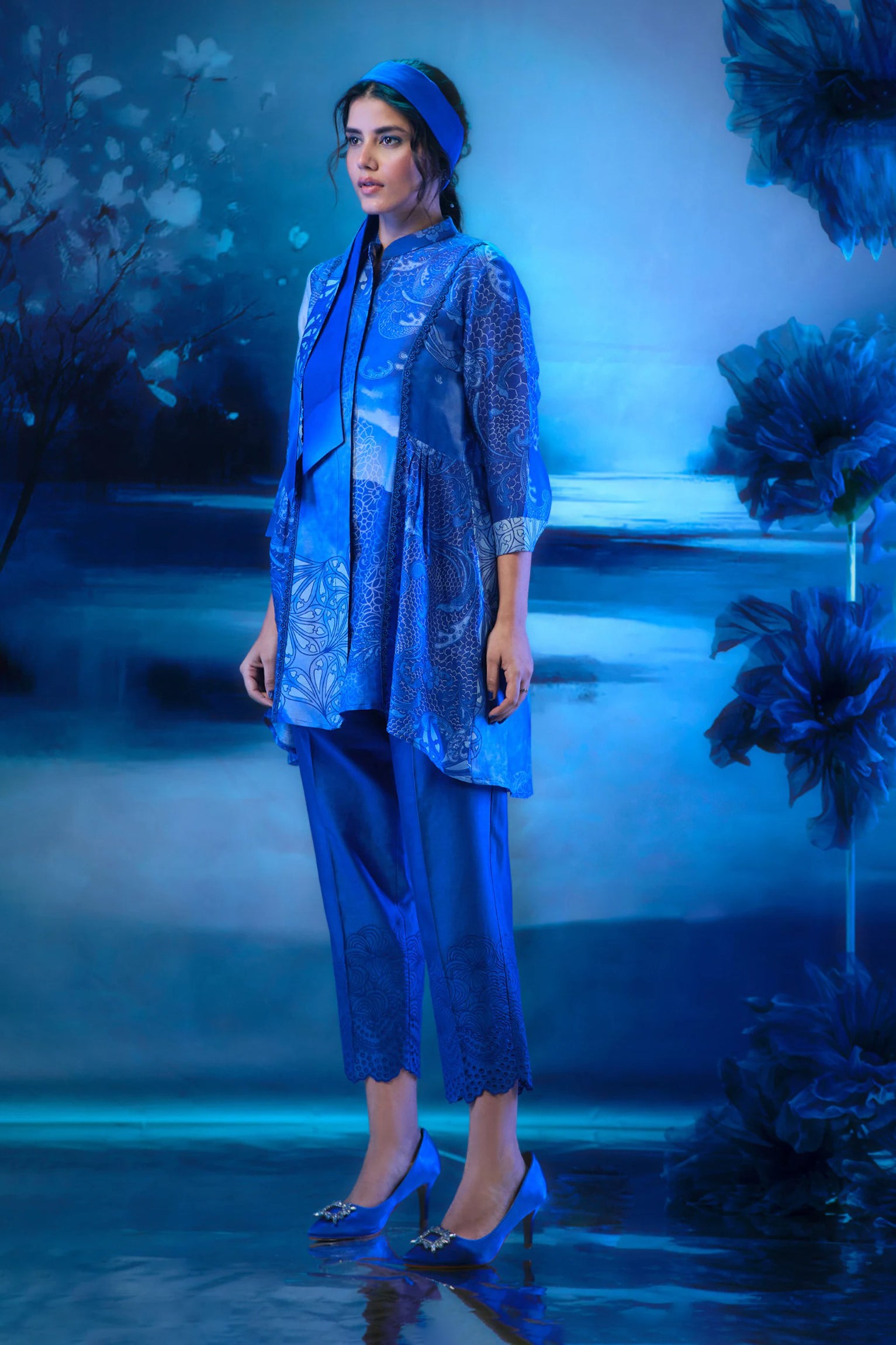 Bold meets beautiful in the indigo ensemble, featuring a flowy, blue printed co-ord ensemble crafted in luxurious chanderi, paired effortlessly with a cutwork pant and a printed scarf. The relaxed silhouette of the co-ord ensemble creates a look that’s both modern and rooted in tradition.