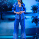 Make a statement in this elegant indigo scallop-edge jacket set, crafted from lightweight and luxurious chanderi fabric. The set features a beautiful printed jacket with delicate scalloped edges, bringing a soft yet structured silhouette to your look. Paired with matching printed scallop-trimmed pants, adding a touch of coordinated charm. An understated inner top completes the ensemble, making it effortlessly chic and perfect for day-to-evening transition.