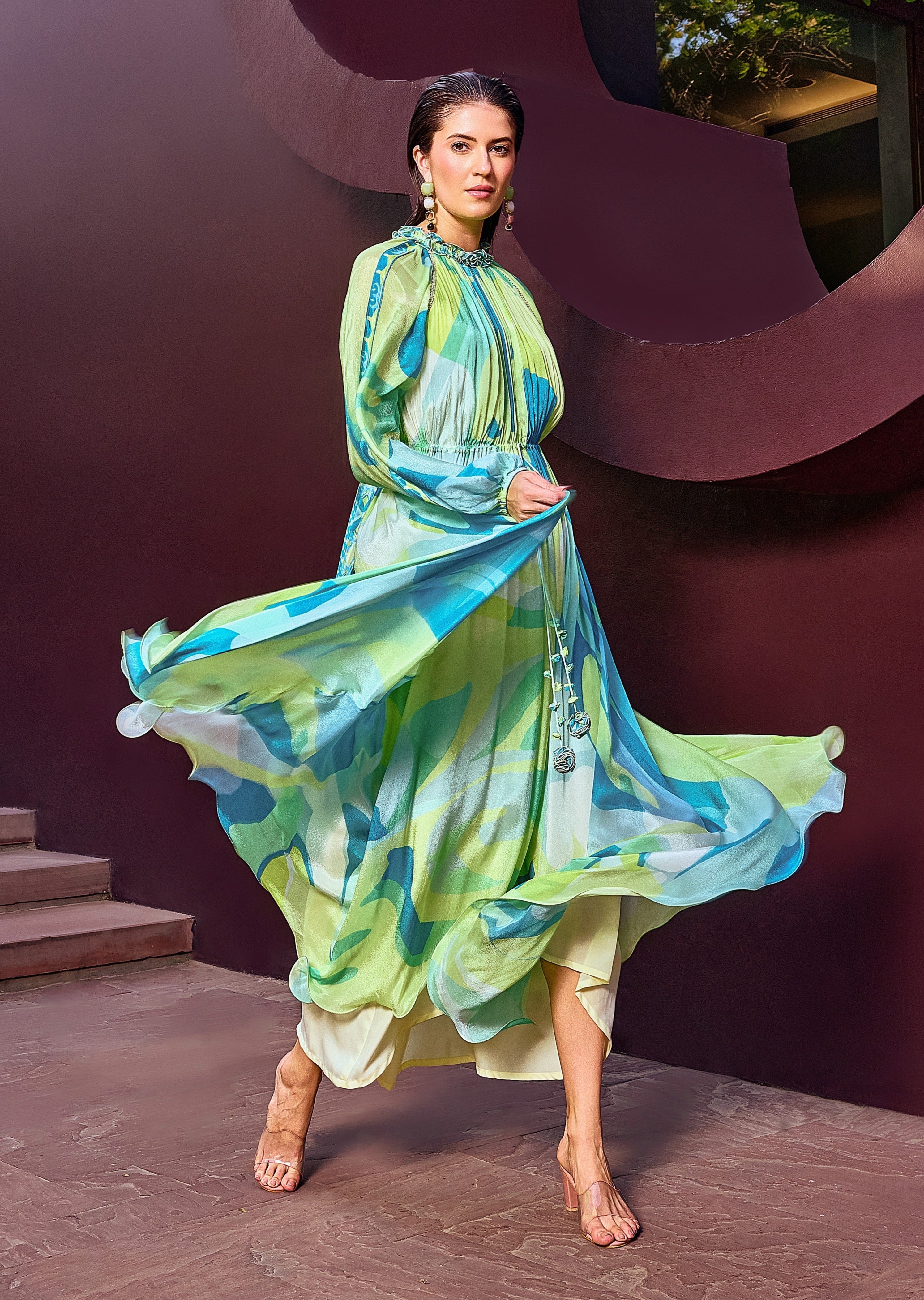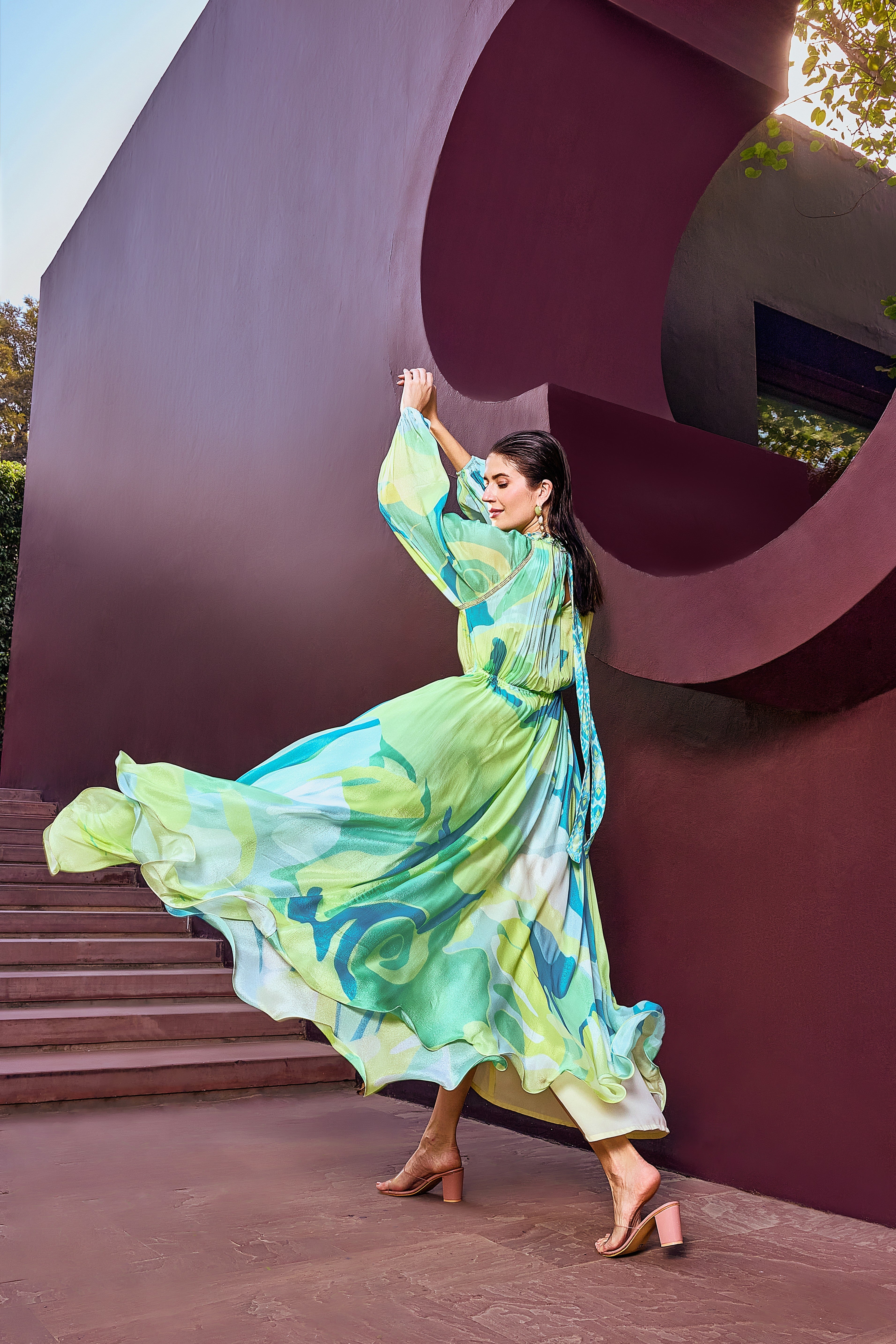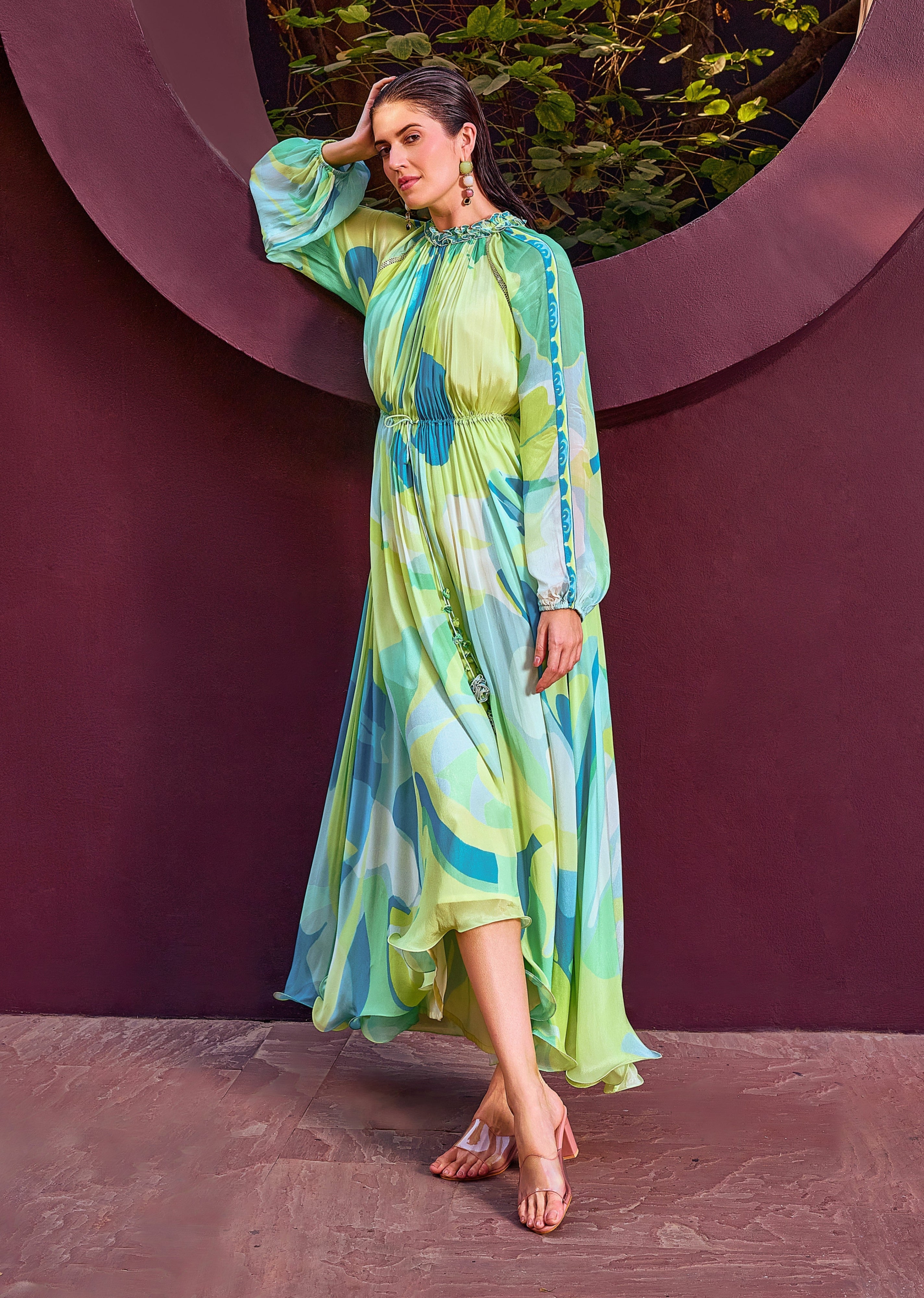 Refined and dynamic, this long dress features an asymmetrical hemline, full sleeves, ruffles in the neckline and an elasticated waist with tassel accents.