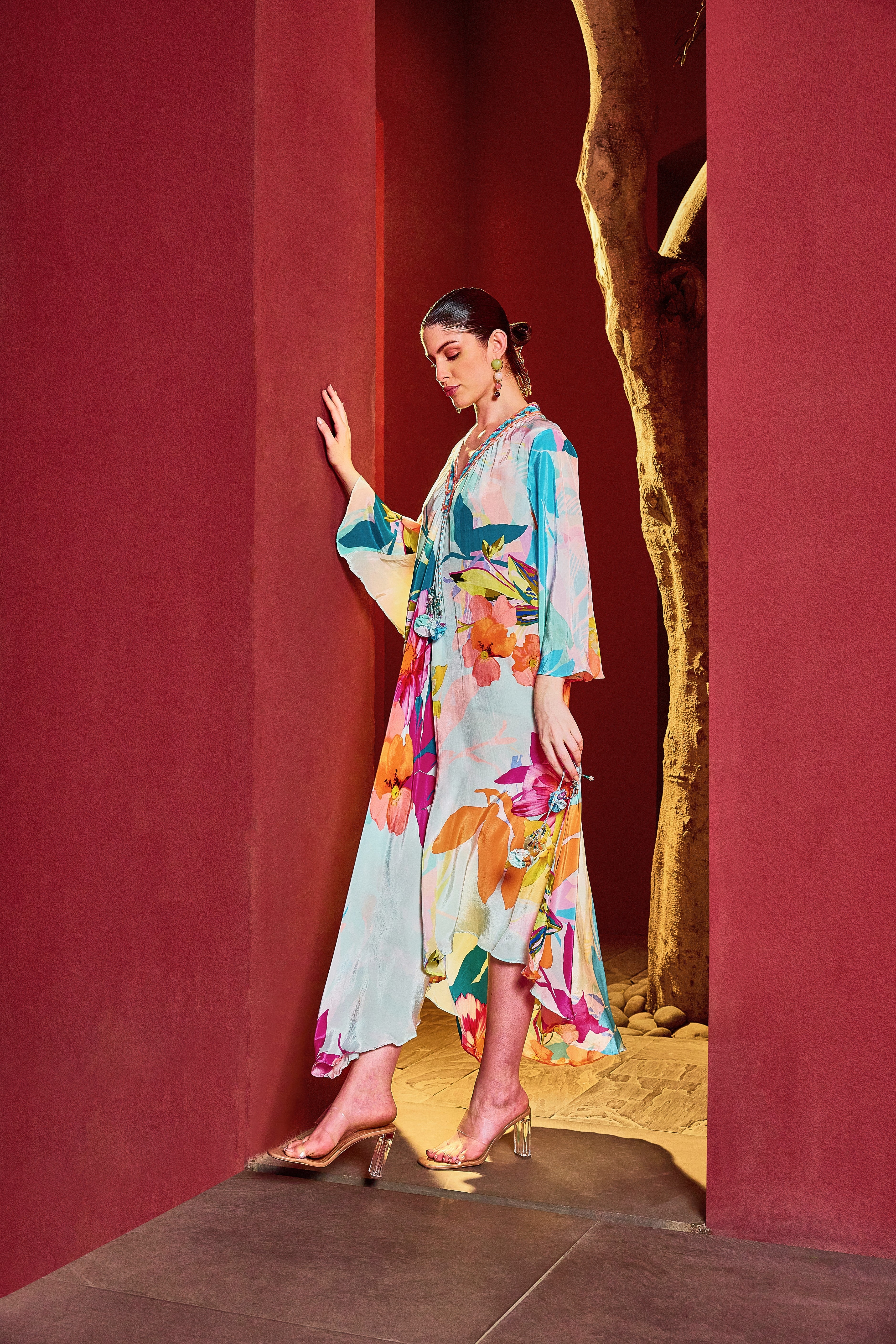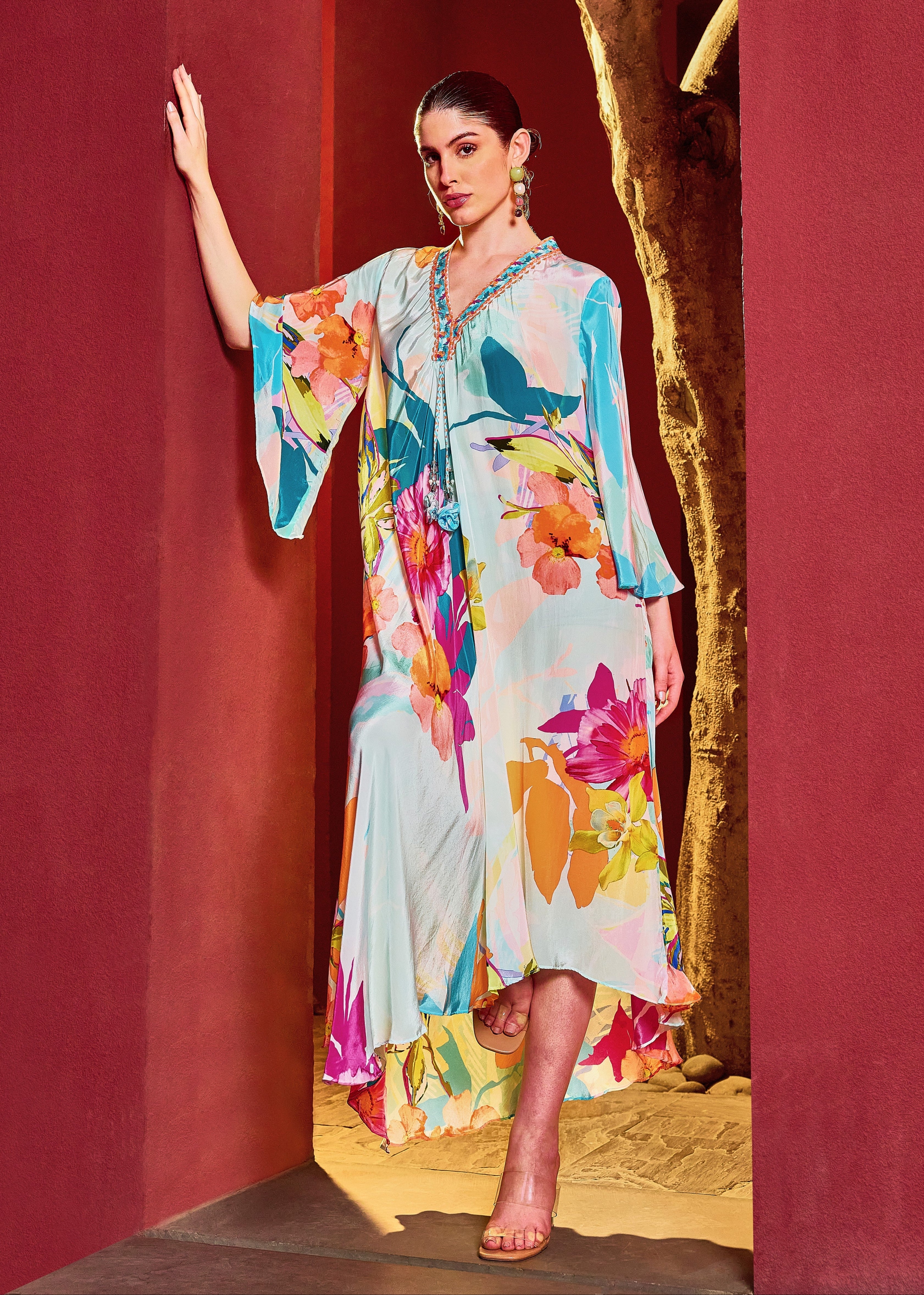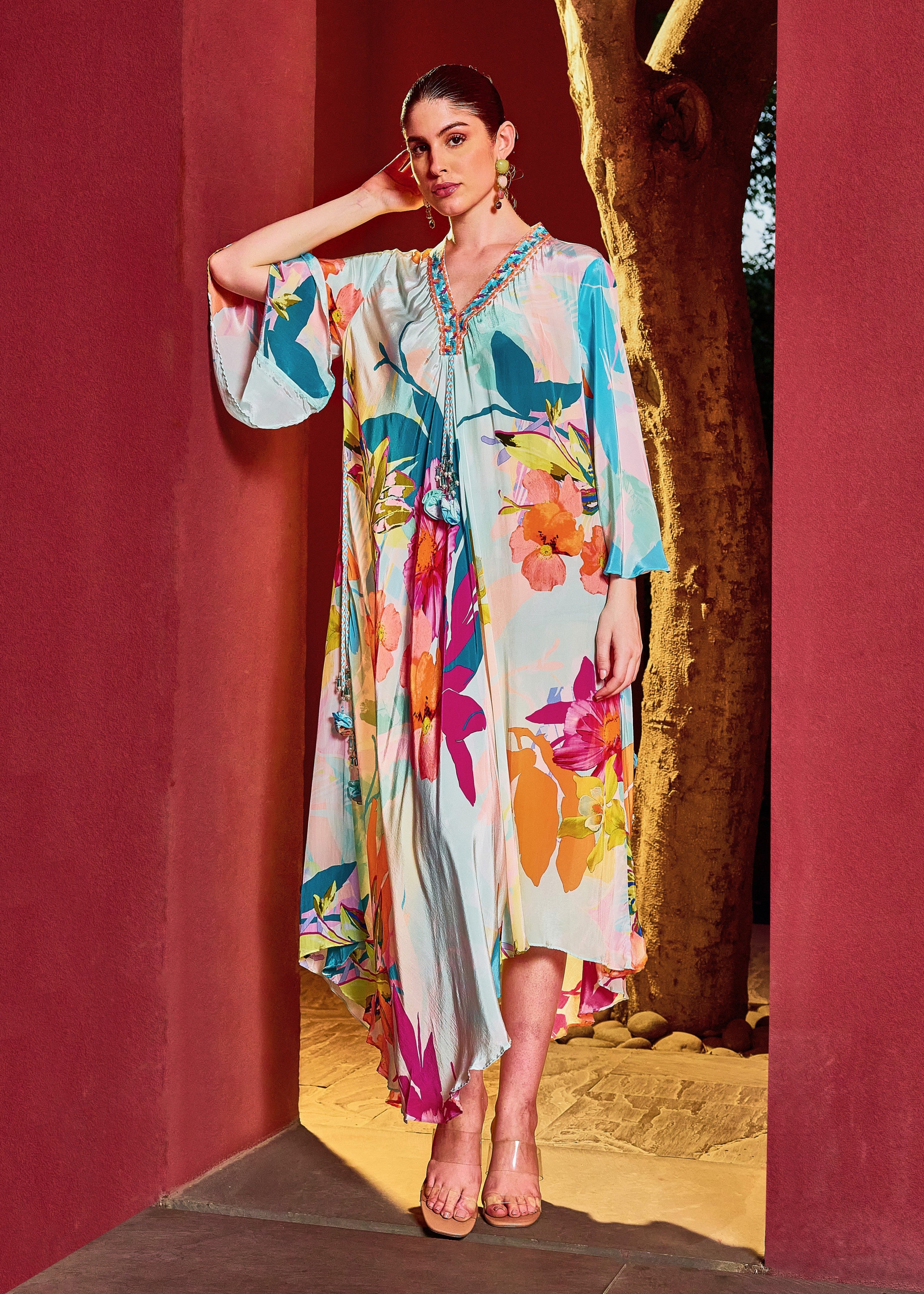 Embrace effortless sophistication in this kaftan dress, featuring an asymmetrical hemline and refined tassel detailing. Perfect for a chic, carefree resort look.