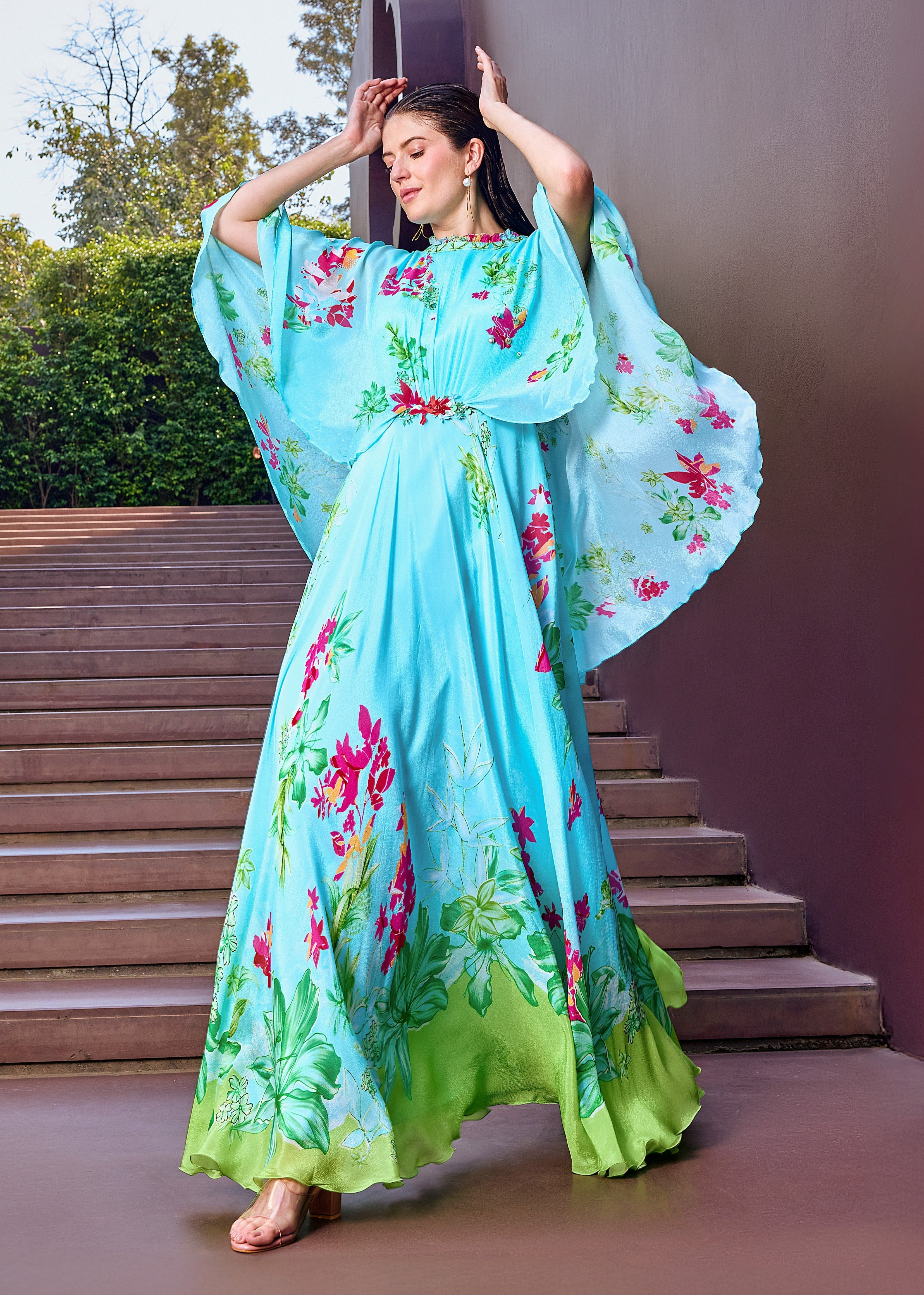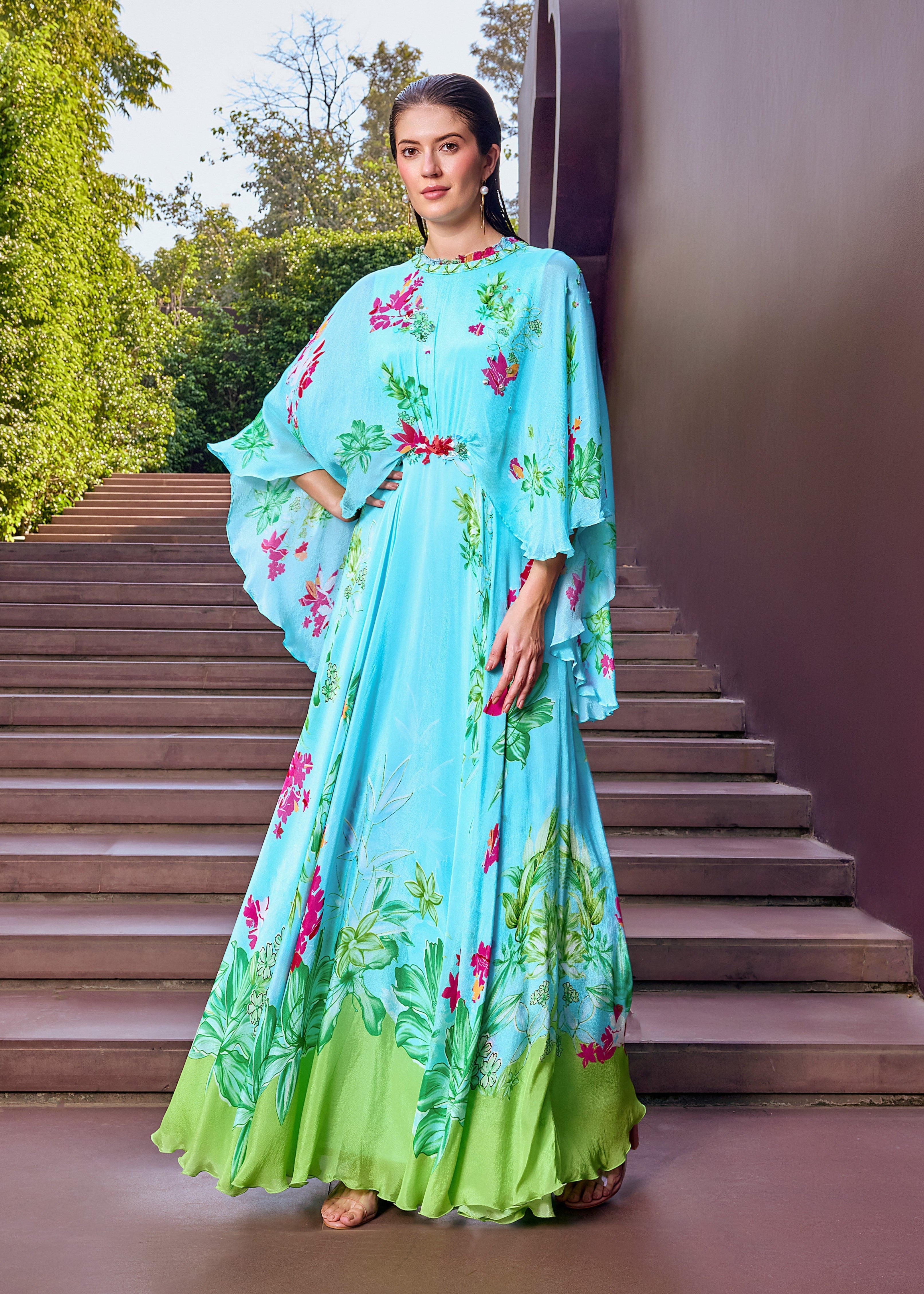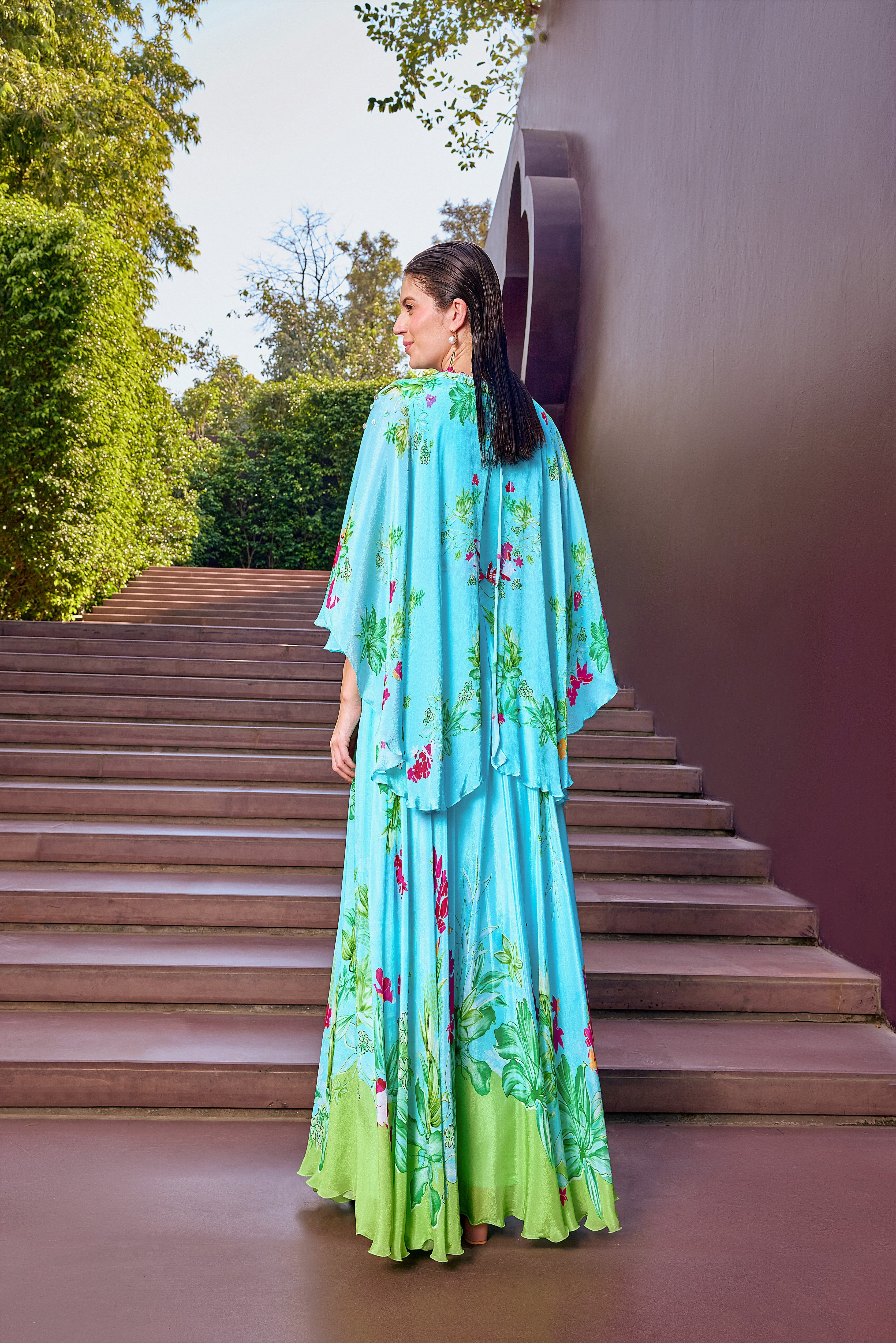 Exquisite and feminine, this dress features cape sleeves, a ruffled neckline, and a foma flower detail at the waist.