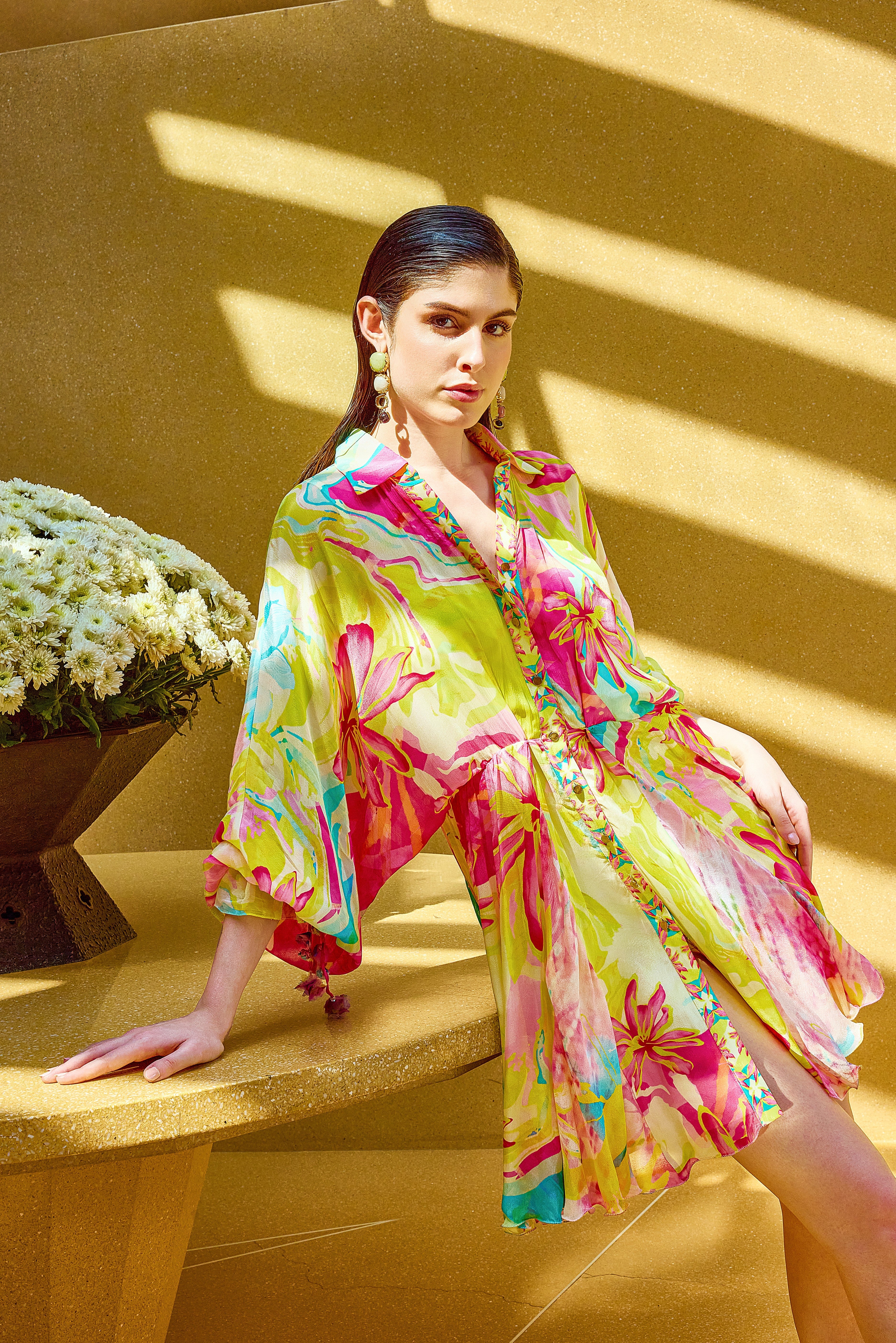 Effortlessly stylish, this short shirt dress is enhanced with playful tassel detailing on the sleeves for a touch of flair.