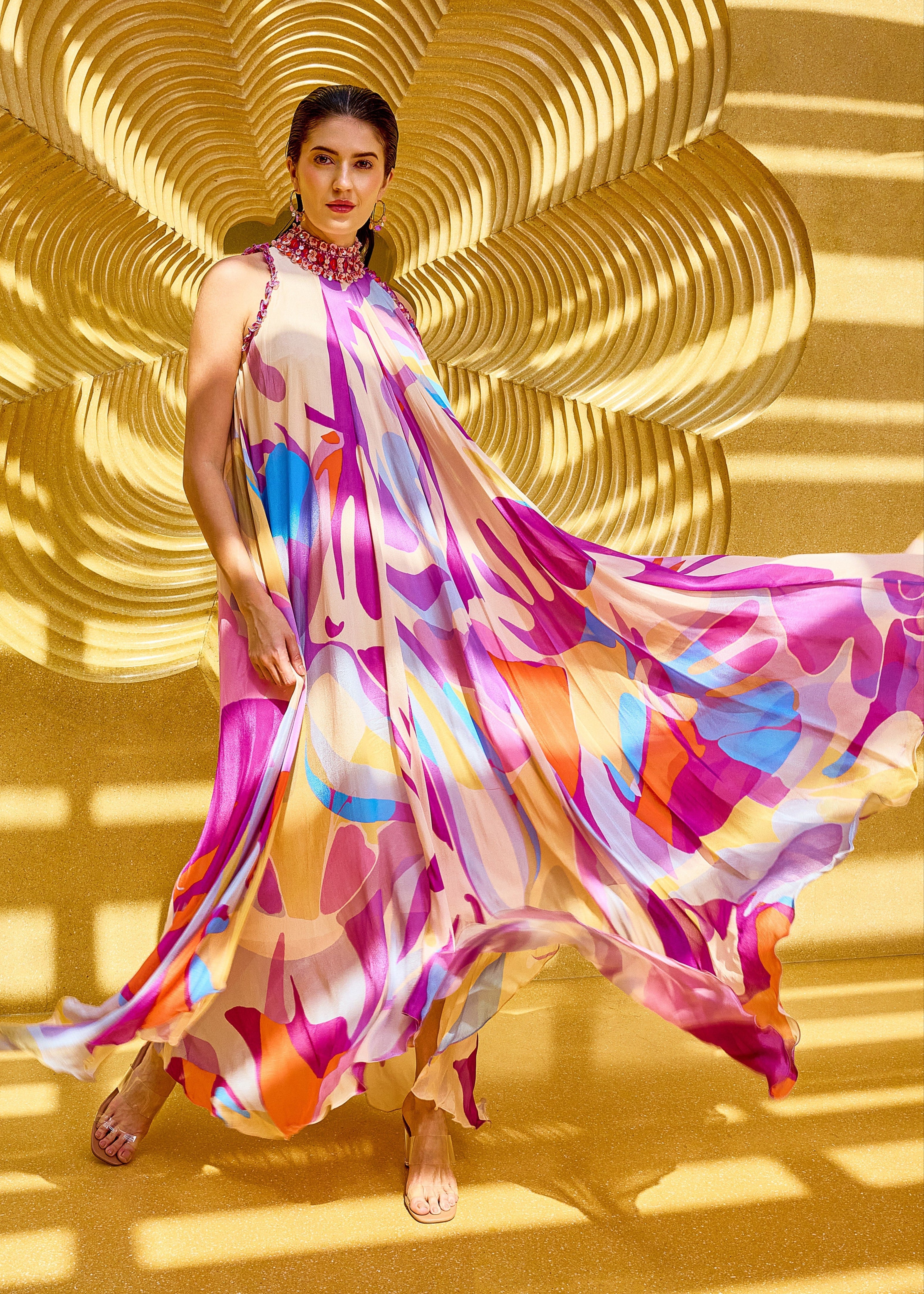 Gracefully modern, this high-neck gown features intricate embroidery at the neckline and an elegant asymmetrical hemline.