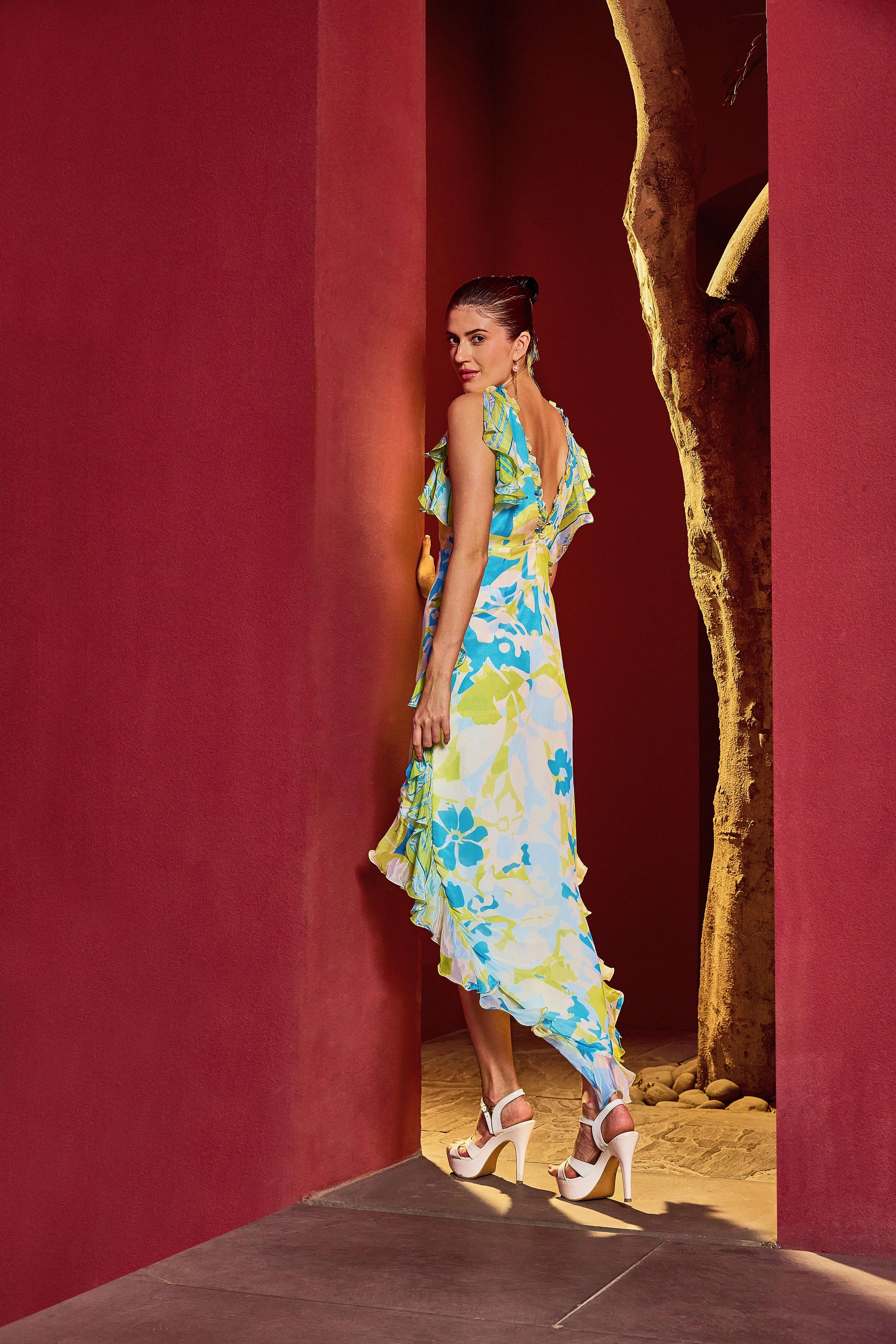 Vibrant and playful, this high-low dress features ruffled detailing in teal and lime yellow for a bold, energetic look.
