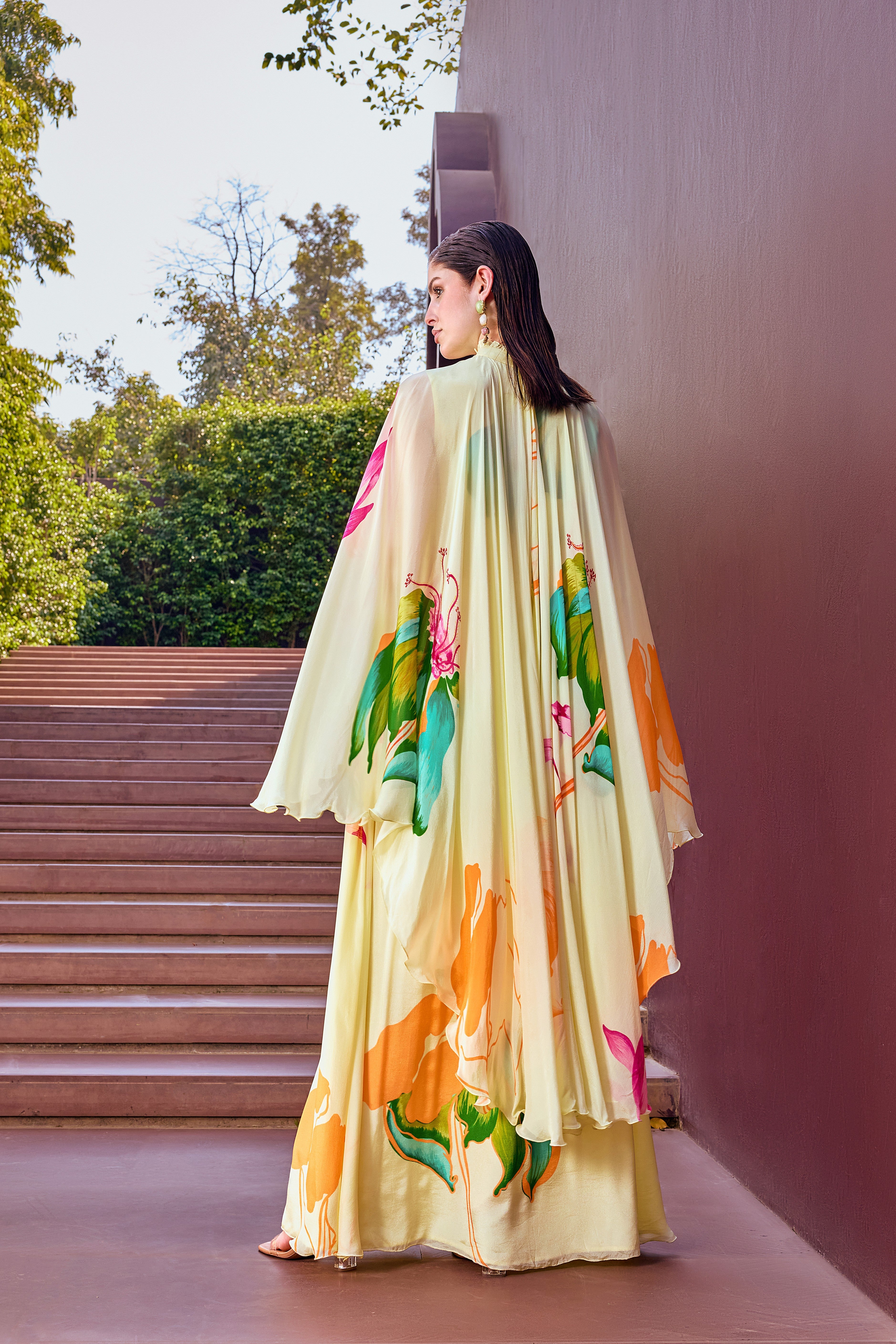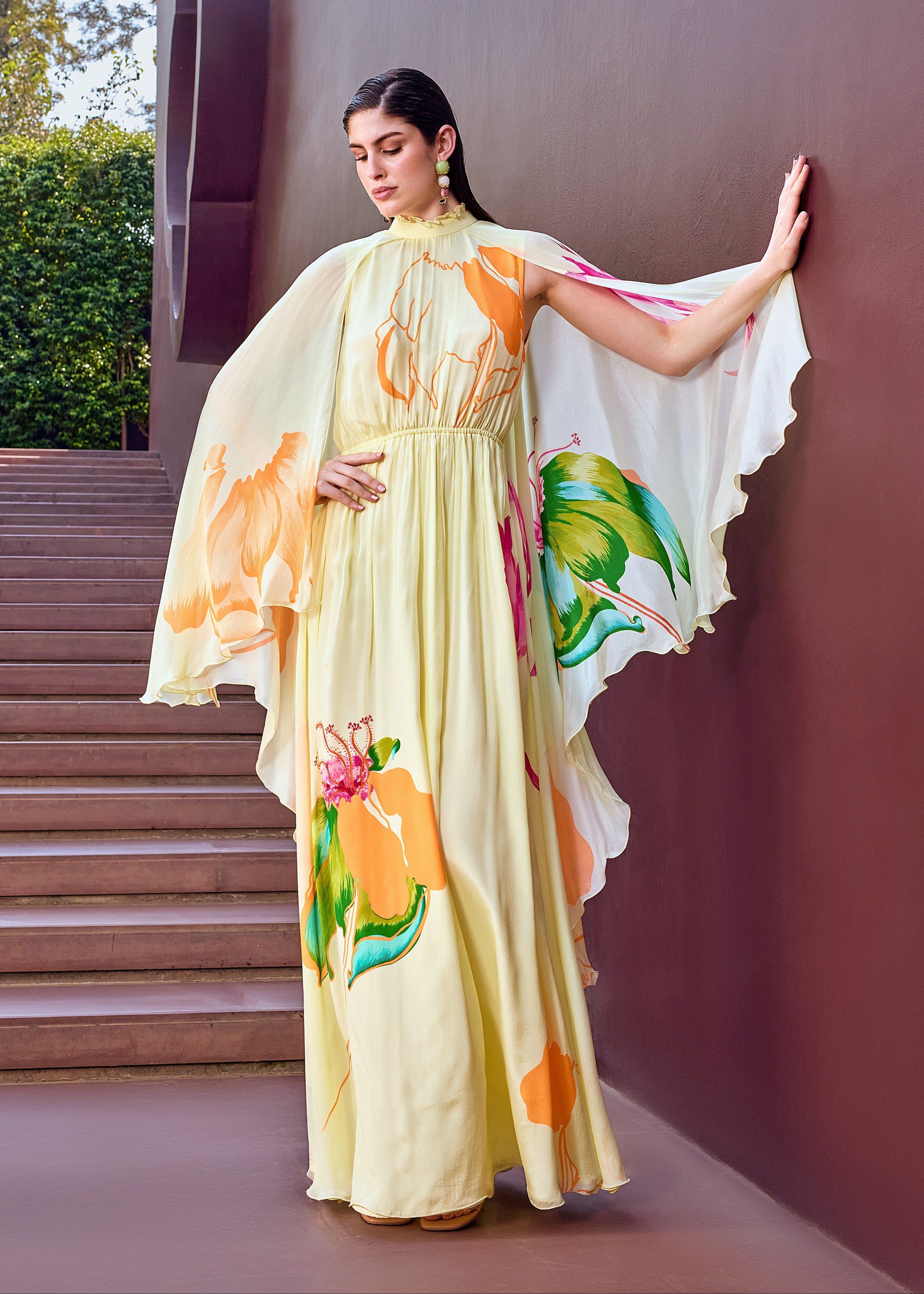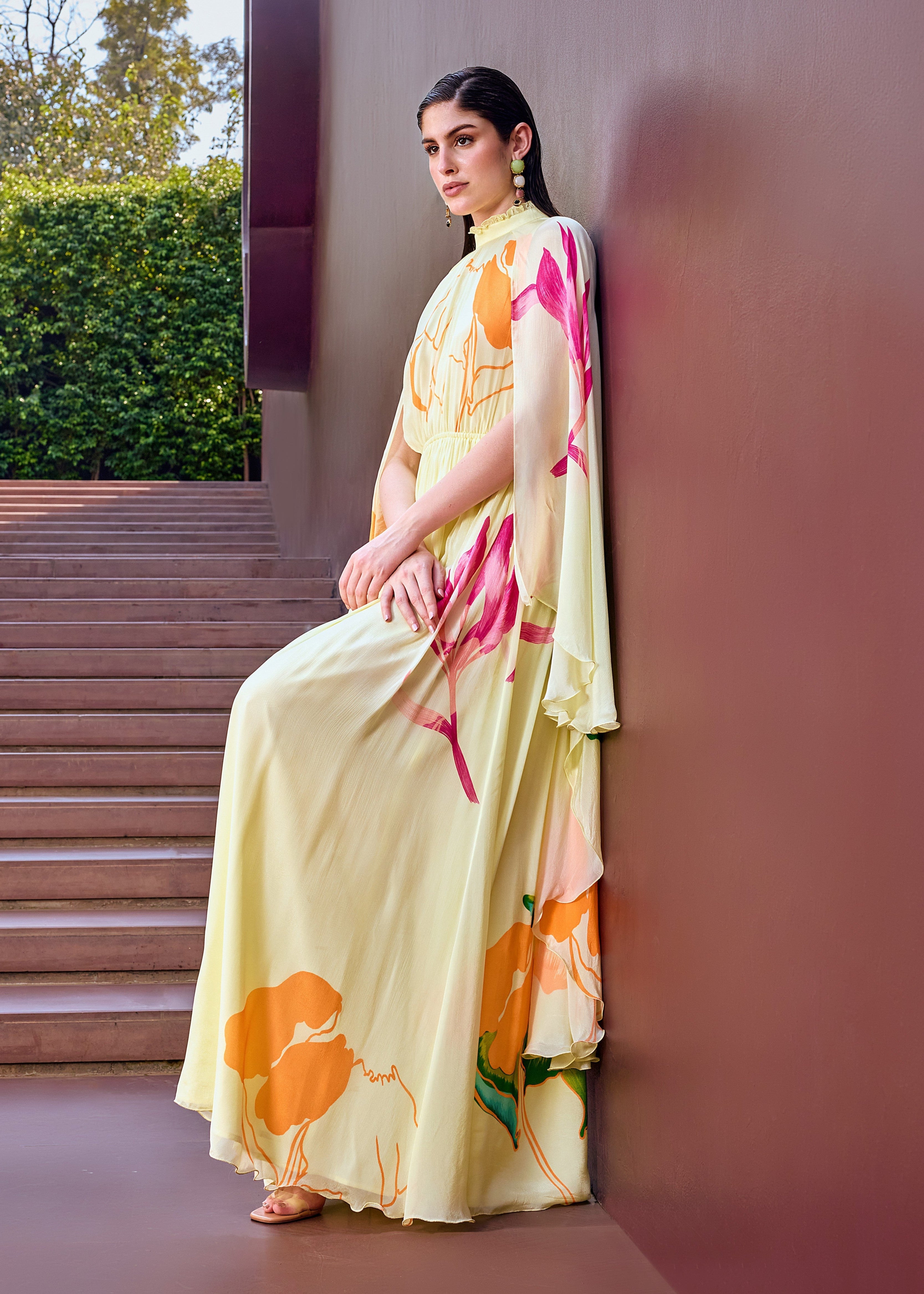 Elegant and flowing, this full-length dress with cape sleeves features an elasticated waist and a delicate ruffled neckline.