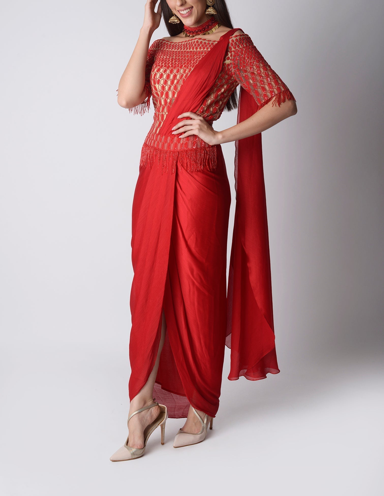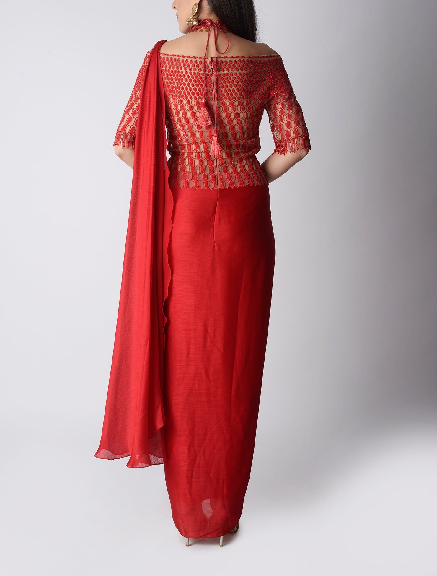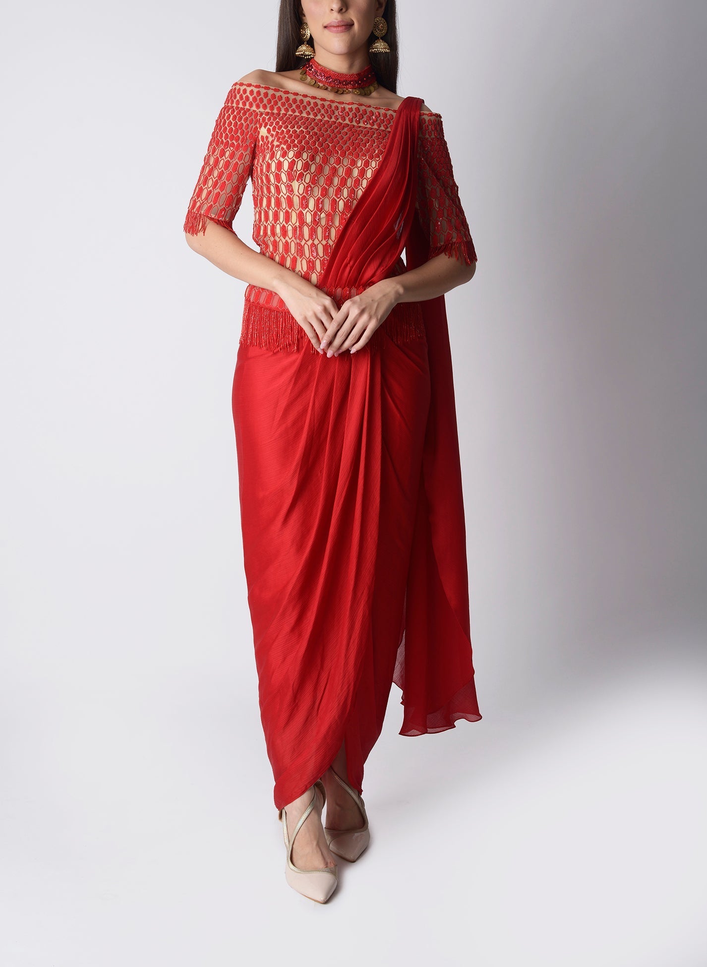 This ensemble is a statement of modern elegance fused with timeless tradition. Draped in a fiery red chiffon saree, the fluid fabric cascades with effortless grace, creating a striking silhouette that exudes sophistication. The saree is paired with an intricately designed off-shoulder blouse, featuring golden geometric embroidery and half sleeves that bring a bold, contemporary edge to the look. The delicate play of sheer detailing and rich metallic accents adds glamour, while the fitted bodice enhances femininity.