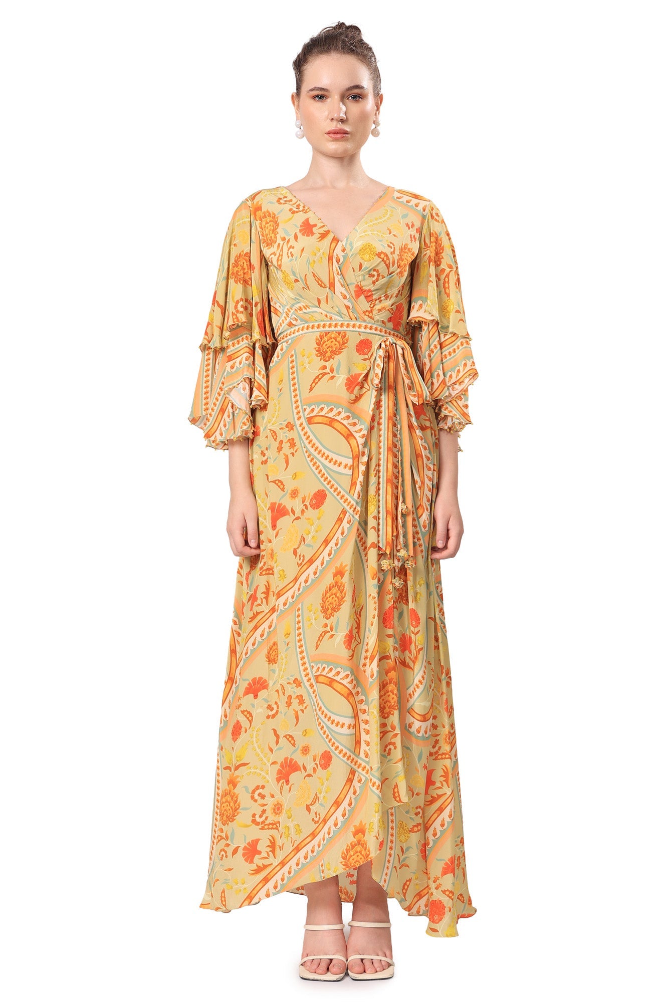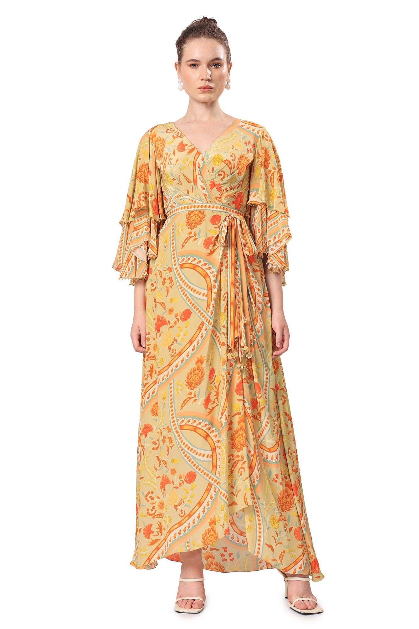 Radiate sophistication with the Ochre Yellow Geometric Floral Printed Long Dress. This striking dress features a rich ochre yellow hue highlighted by an eye-catching geometric floral print, blending modern design with timeless elegance. The long, flowing silhouette is enhanced by flare sleeves, which add a touch of drama and movement. Perfect for any special occasion or evening event, this dress combines vibrant color, intricate patterns, and stylish details to create a standout look that exudes grace and confidence.