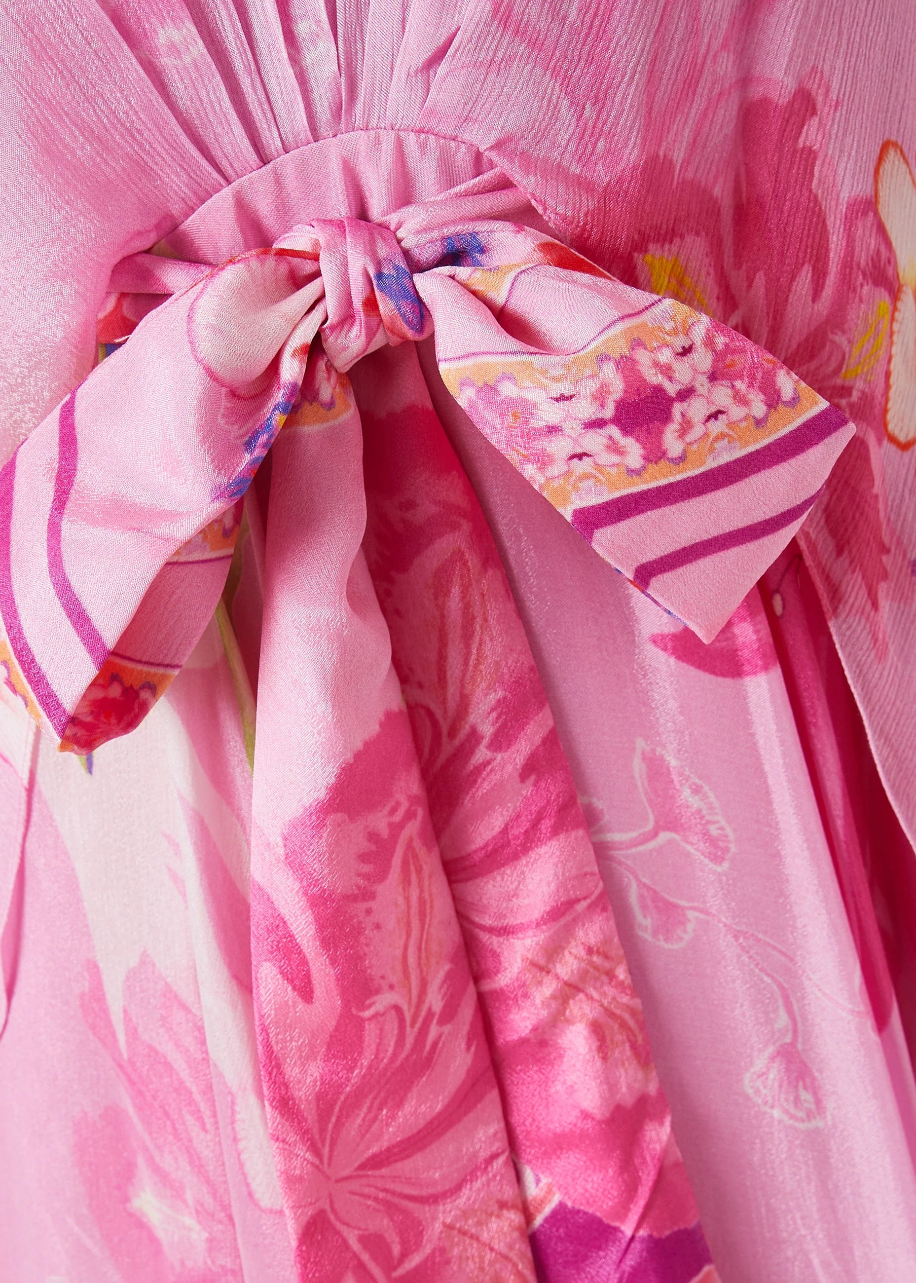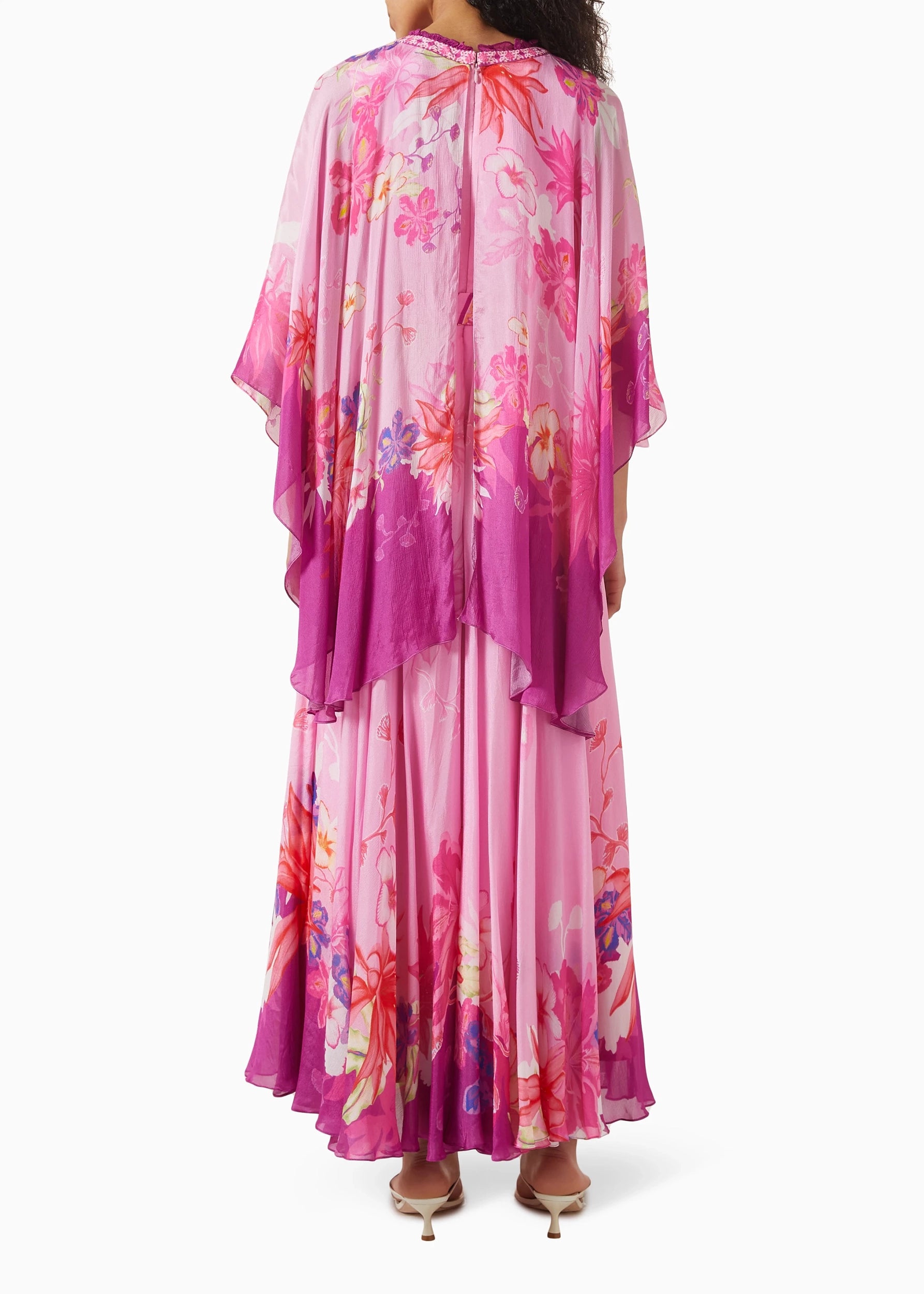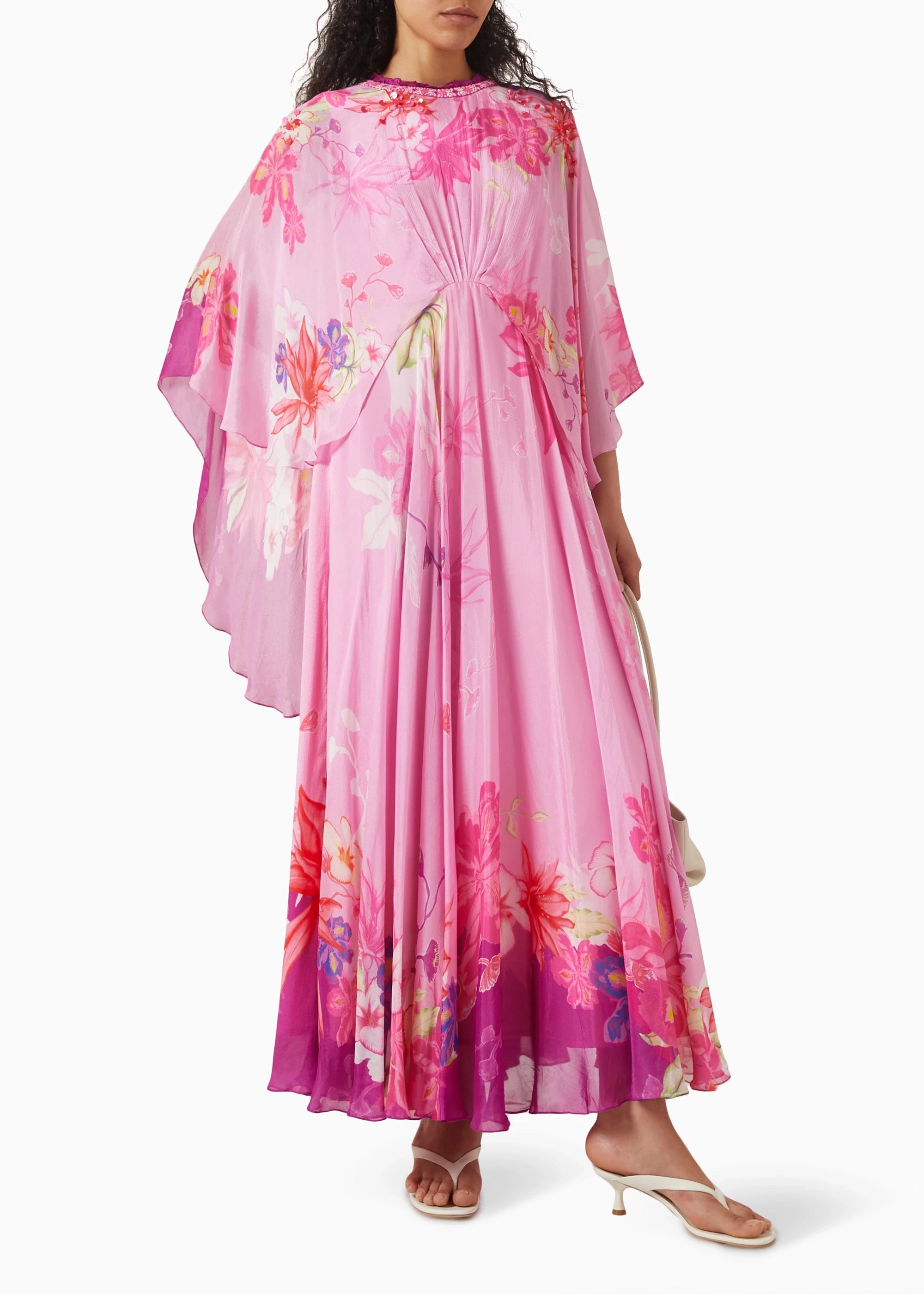 Mandira Wirk's dress is a captivating statement piece. The flowing chiffon fabric adorned with a vibrant print creates a mesmerizing visual impact. The high neckline and asymmetric cape sleeves add an element of unexpected drama, while the front waist tie-up detail and back fastening ensure a flattering and secure fit.